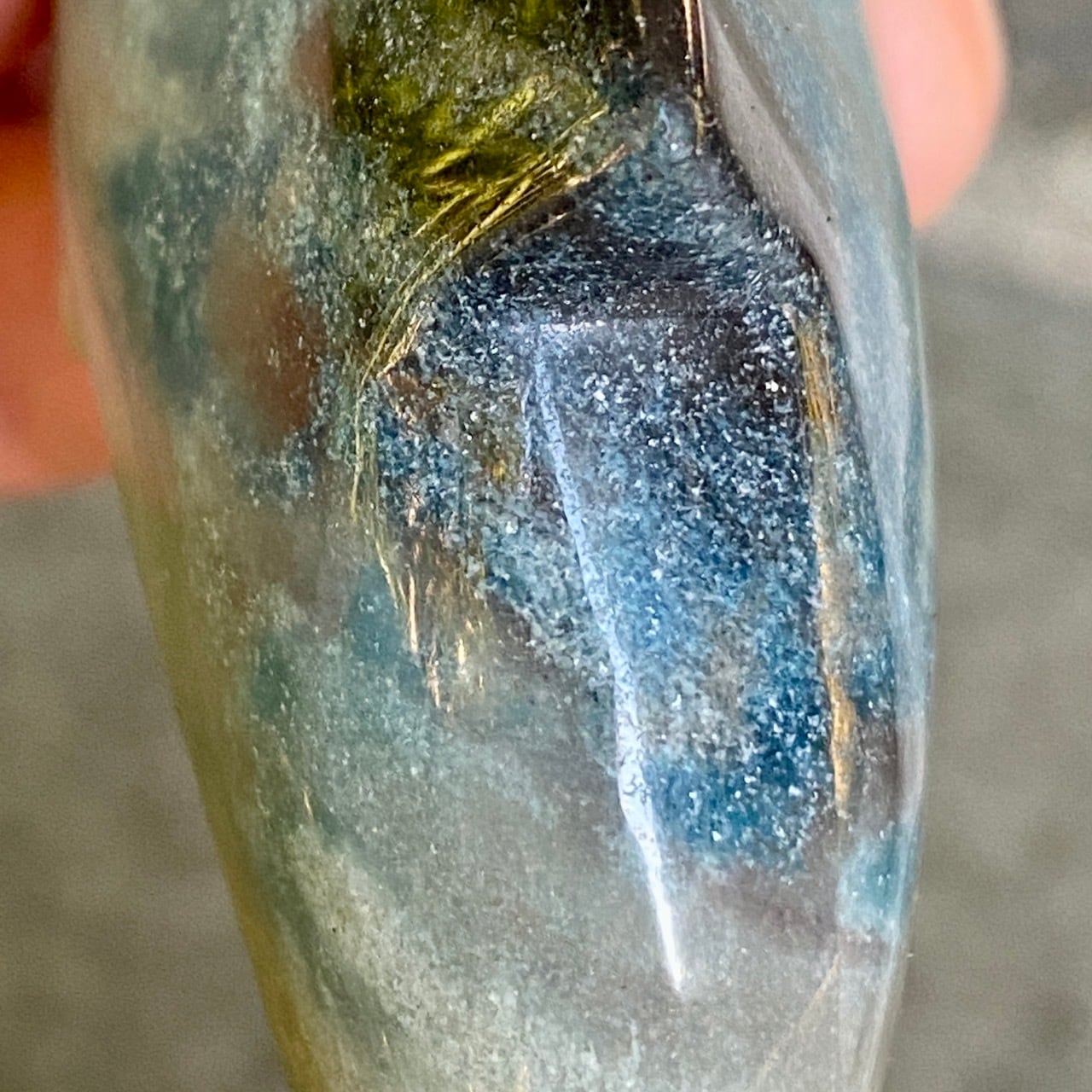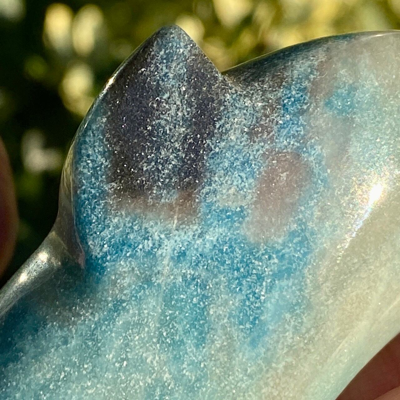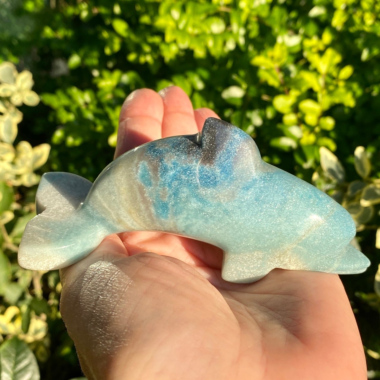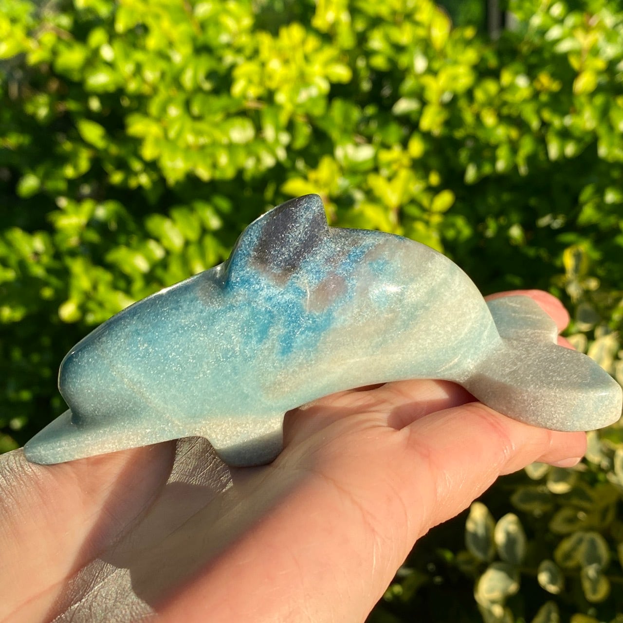 店主の大好きな石、トロレアイトのイルカで、ブルーの濃淡、ネイビー、そして乳白色のコンビネーションが非常に魅力的な子です。神聖な生き物であるイルカとアセンションストーンであるトロレアイトの組み合わせが最強です。