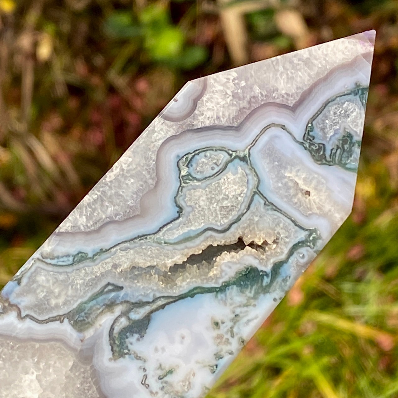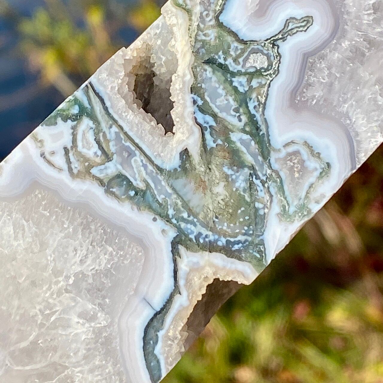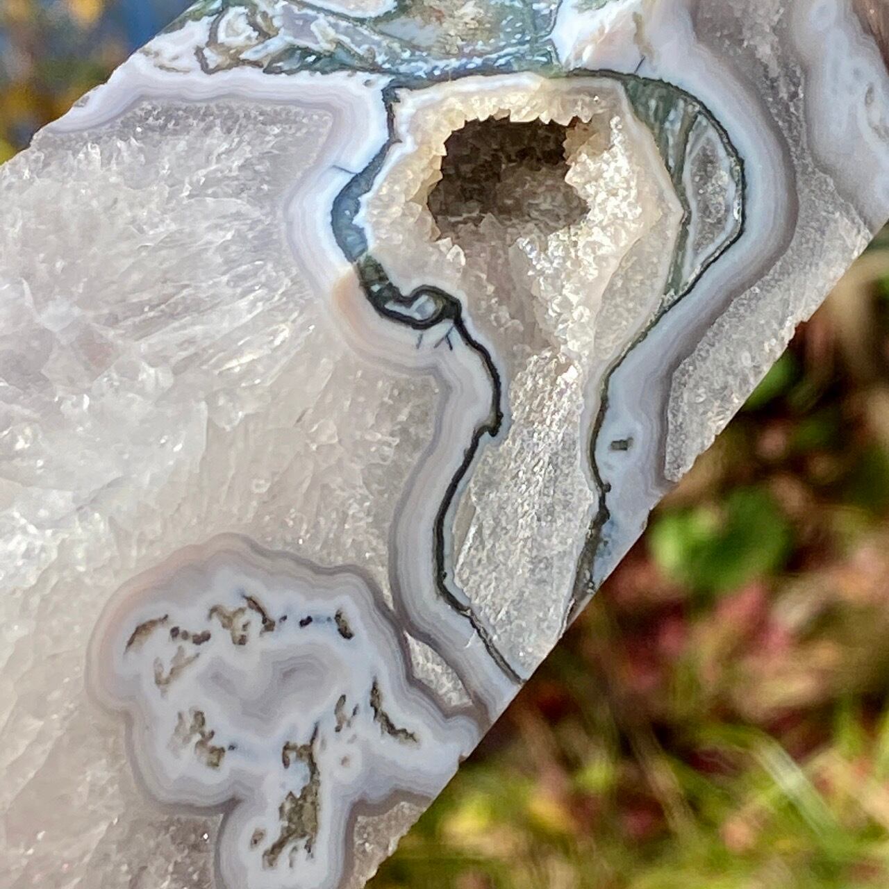 モスアゲートは瑪瑙(メノウ)の中に緑色や赤色、黒色などの内包物が入り、それが苔や樹形(木の枝)のような模様に見えるのが特徴です。