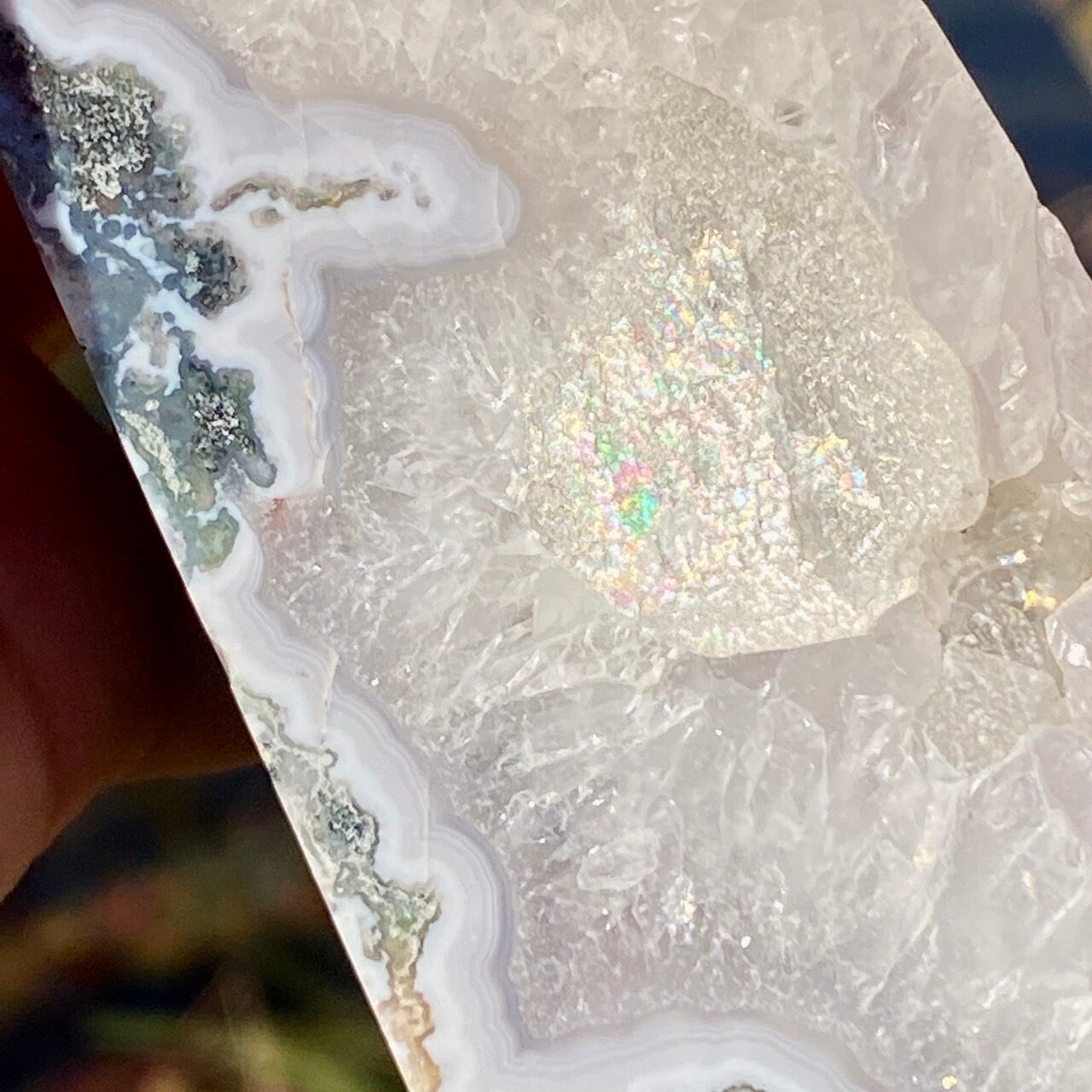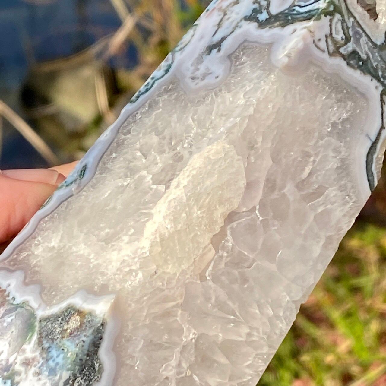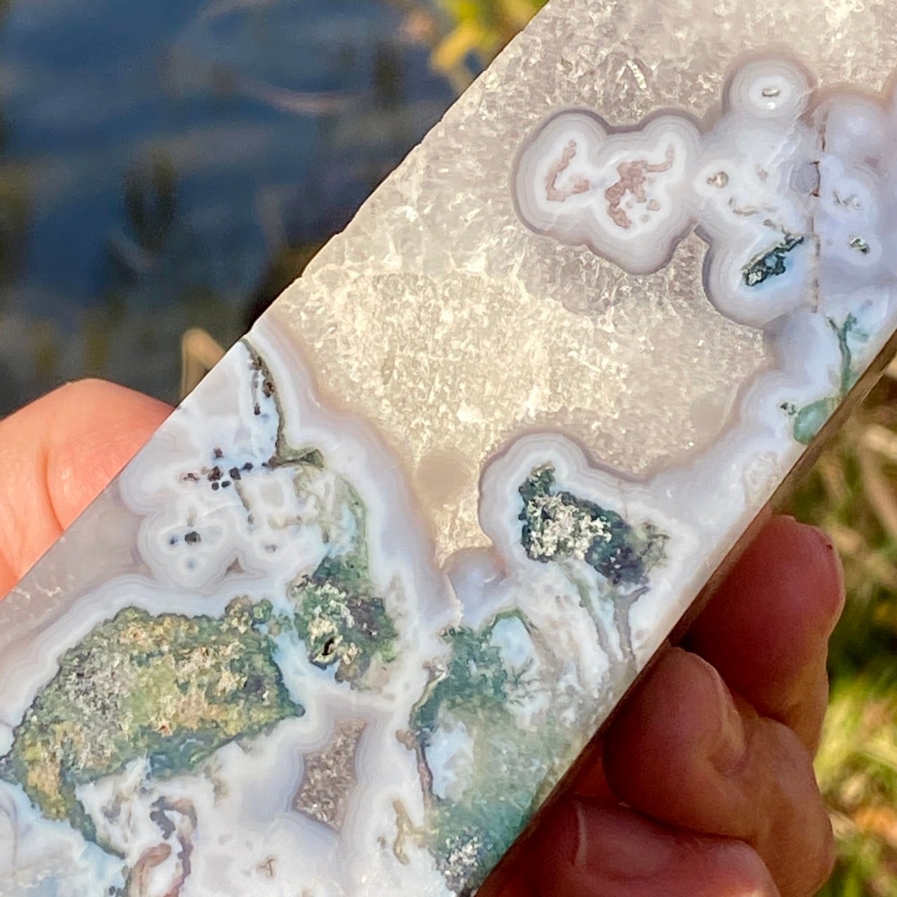 モスアゲートは瑪瑙(メノウ)の中に緑色や赤色、黒色などの内包物が入り、それが苔や樹形(木の枝)のような模様に見えるのが特徴です。