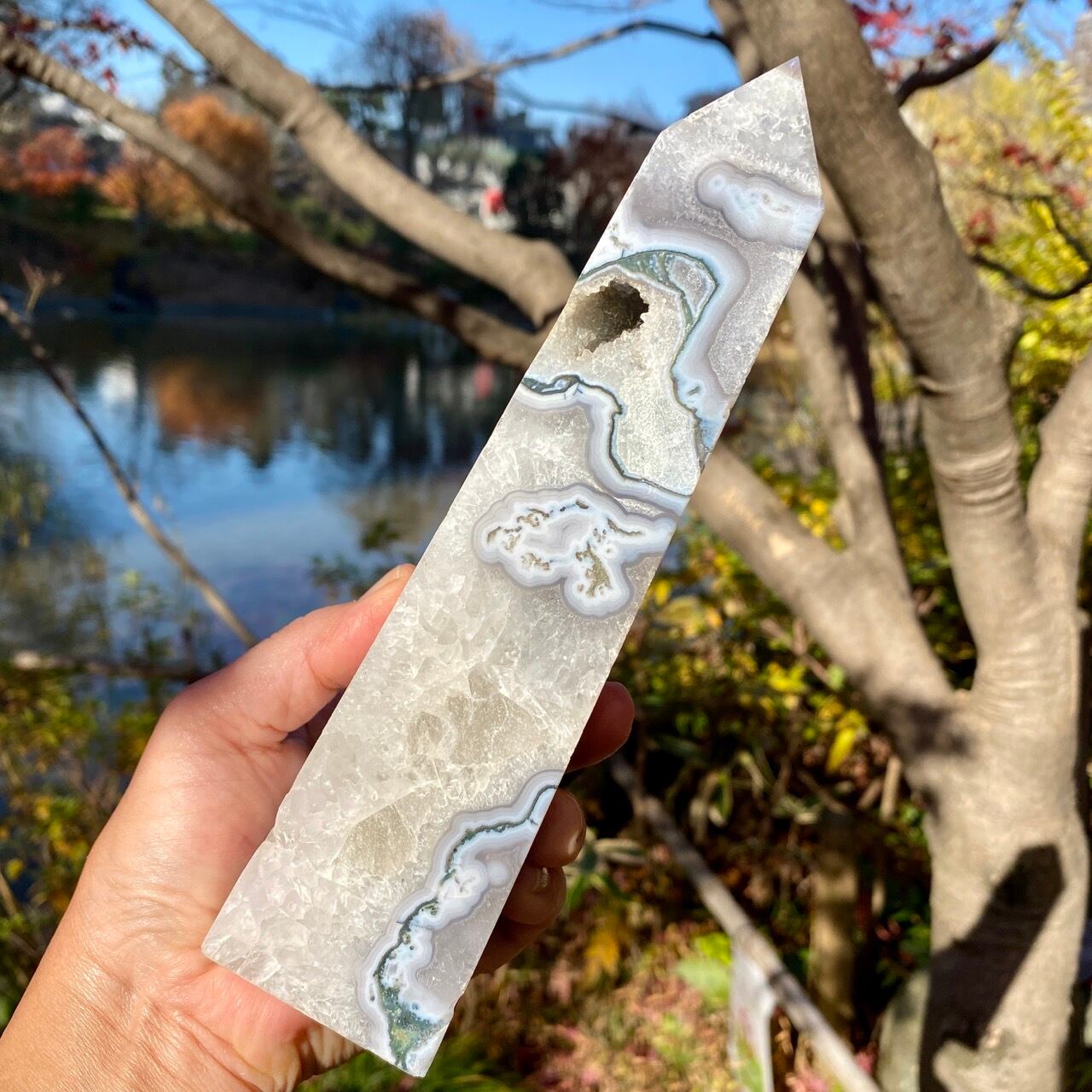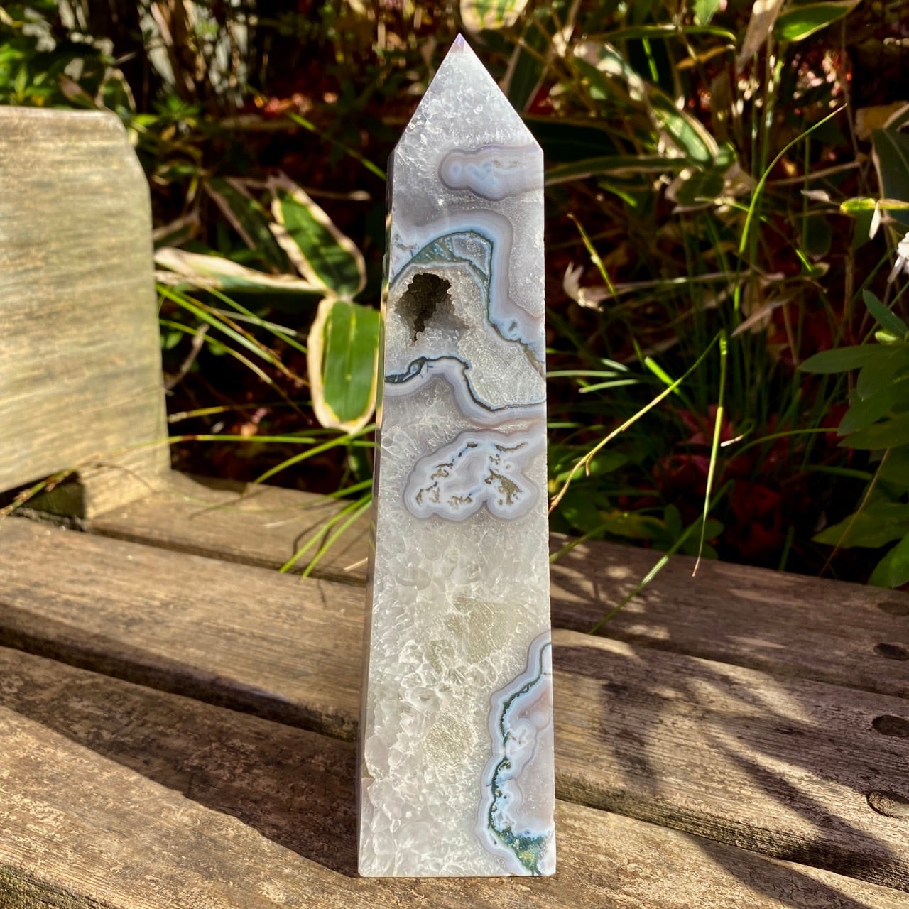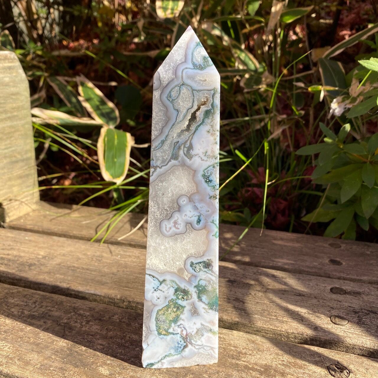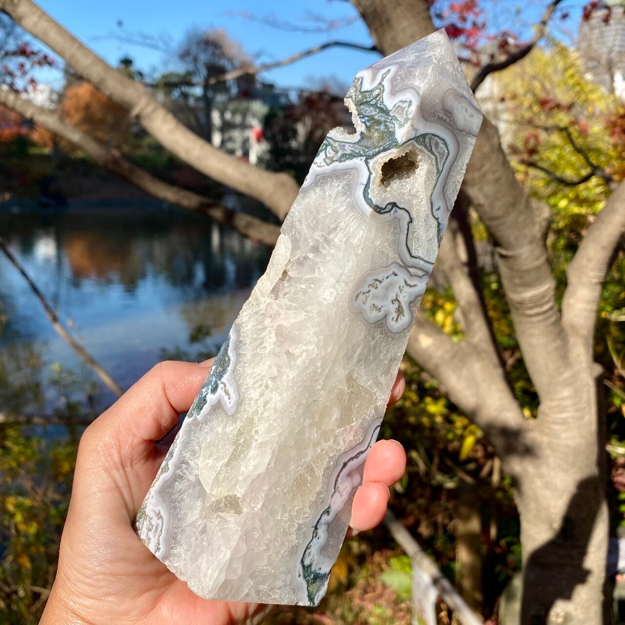 世界中で人気のある、ブルーモスアゲートのタワーです。苔の様な模様と優しいブルーの色味、ざくざく入った結晶化したクウォーツ部分、そしてキャビティから顔を覗かせるクォーツのドゥルージー等、見どころ満載のゴージャスなタワーです。加えてこの重量感と高さは、アイキャッチャーとして華麗にインテリアを装飾する存在感のあるサイズです。