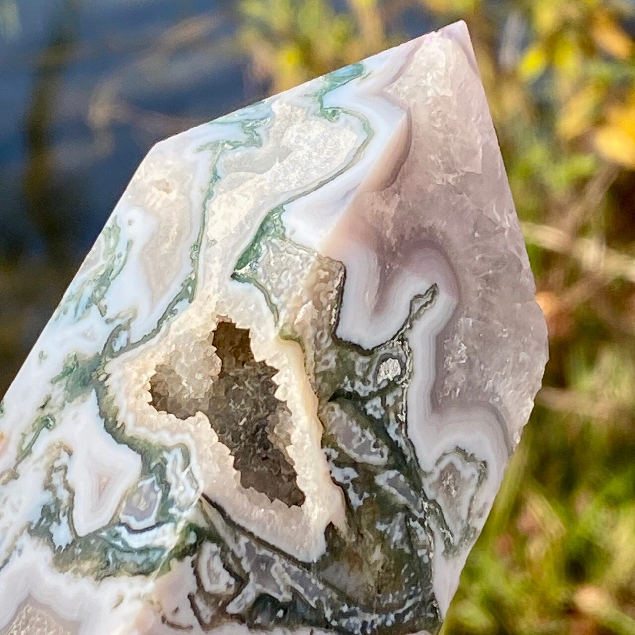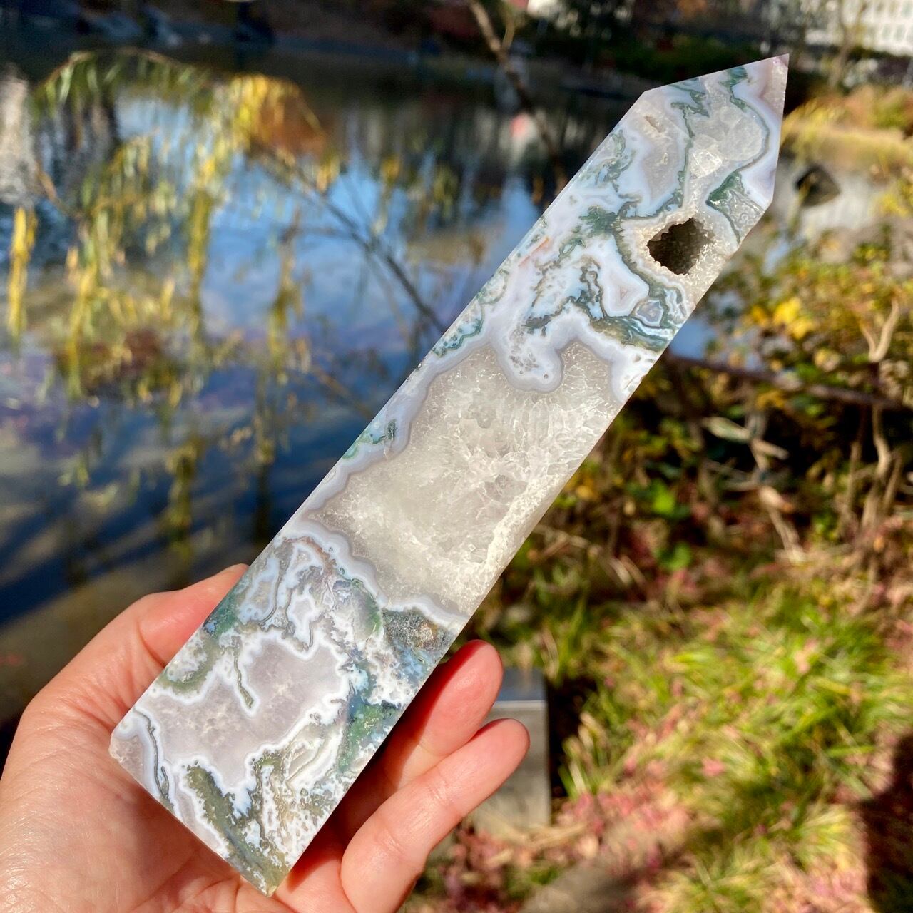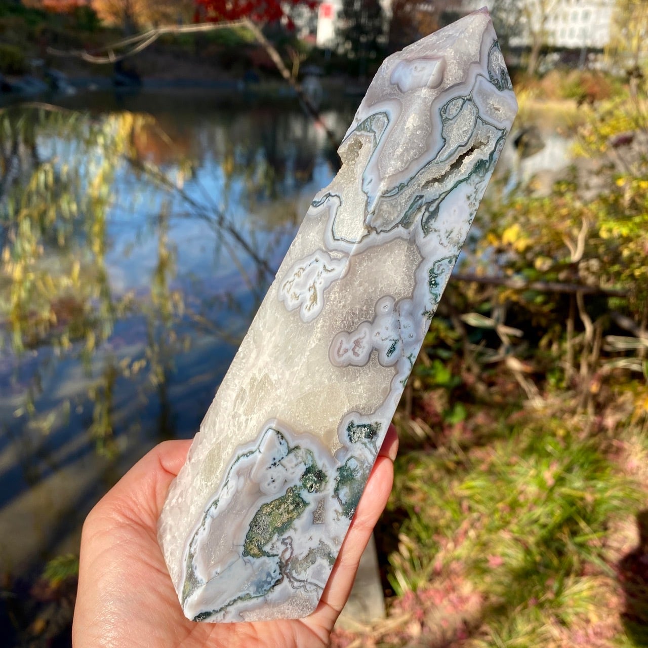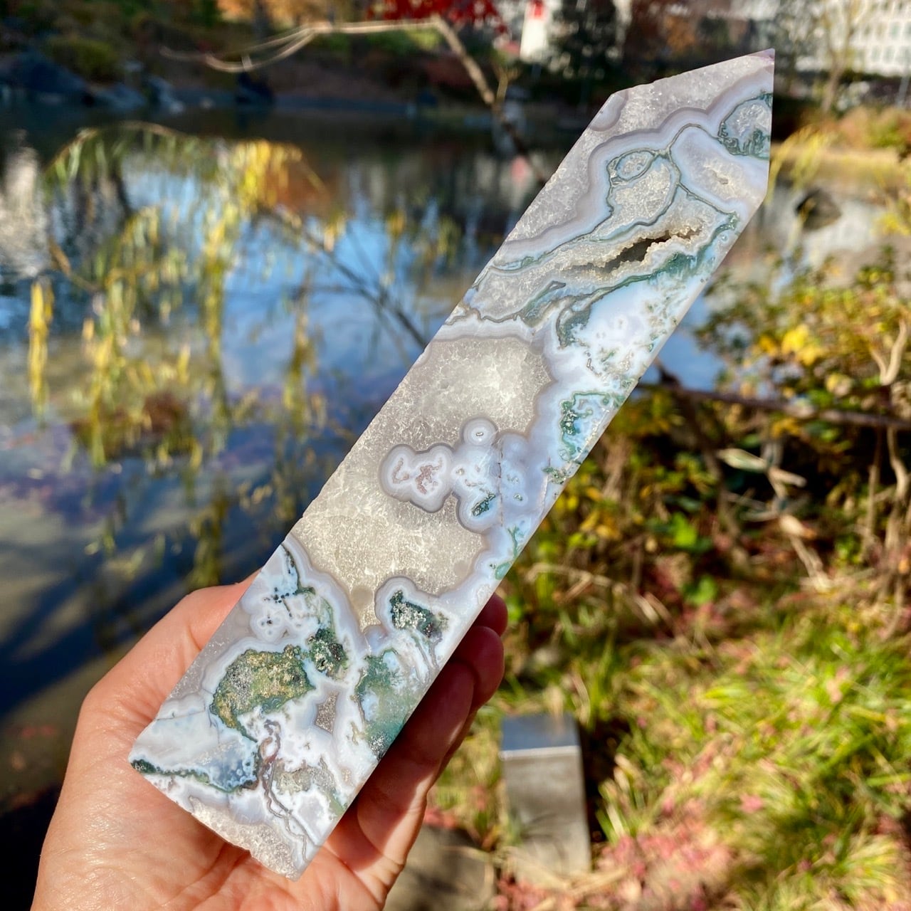 世界中で人気のある、ブルーモスアゲートのタワーです。苔の様な模様と優しいブルーの色味、ざくざく入った結晶化したクウォーツ部分、そしてキャビティから顔を覗かせるクォーツのドゥルージー等、見どころ満載のゴージャスなタワーです。加えてこの重量感と高さは、アイキャッチャーとして華麗にインテリアを装飾する存在感のあるサイズです。