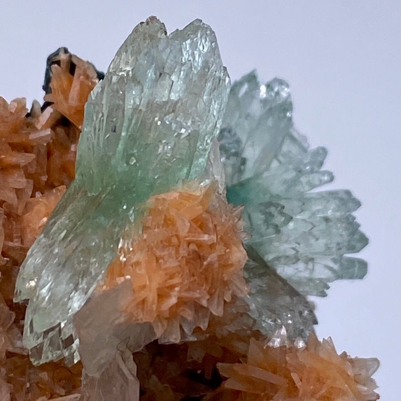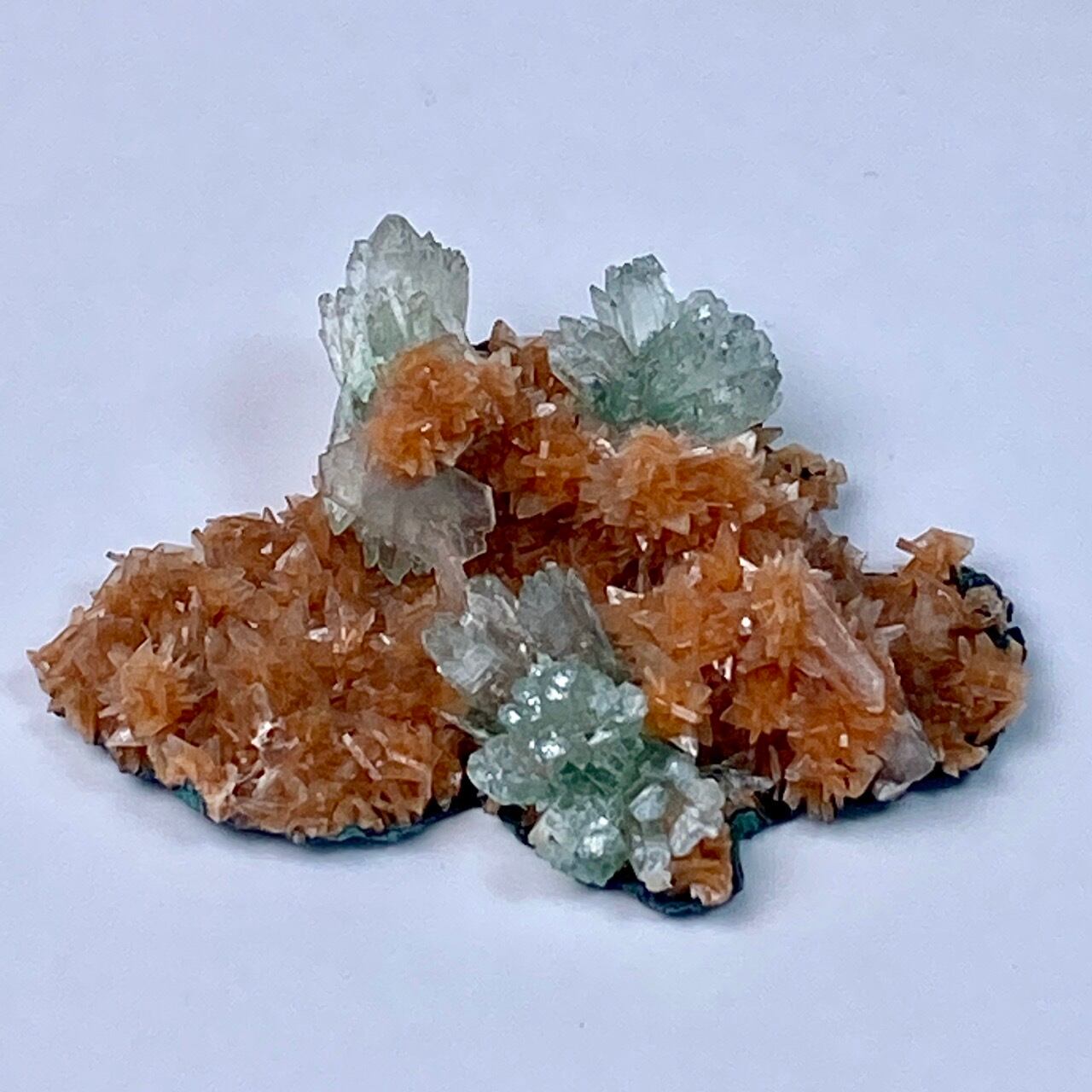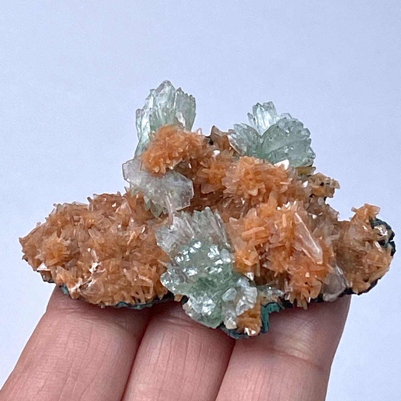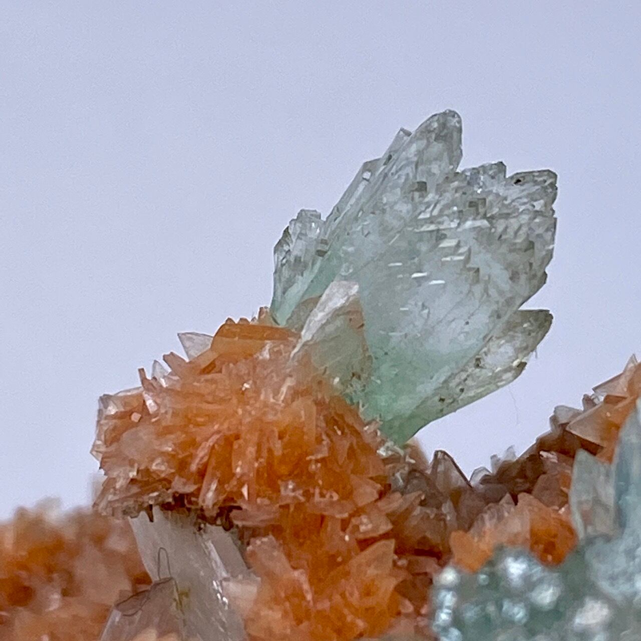 インドの息子的存在からお迎えした、蝶ネクタイ型のグリーンアポフィライトを抱く、レア系の赤い(実際はキャロットのようなオレンジ色です)ヒューランダイトのクラスターです。