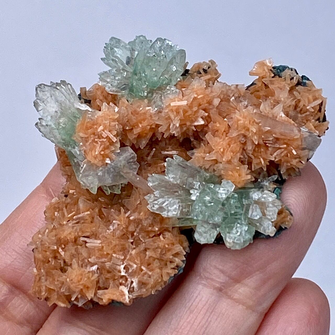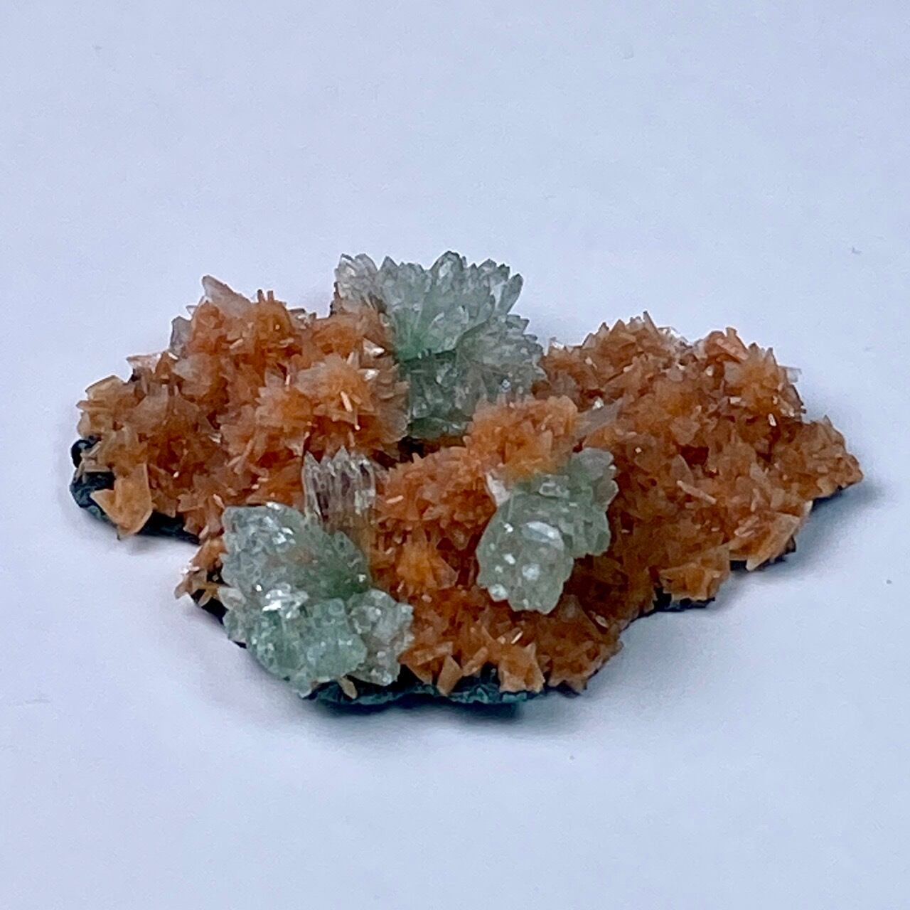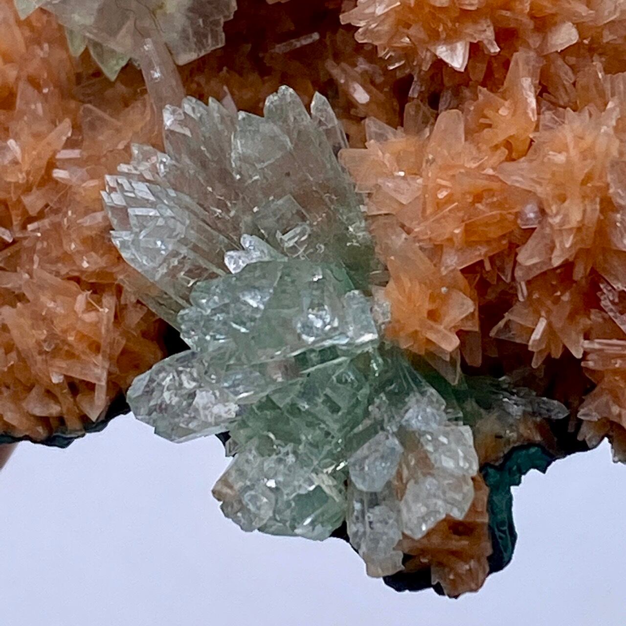 インドの息子的存在からお迎えした、蝶ネクタイ型のグリーンアポフィライトを抱く、レア系の赤い(実際はキャロットのようなオレンジ色です)ヒューランダイトのクラスターです。