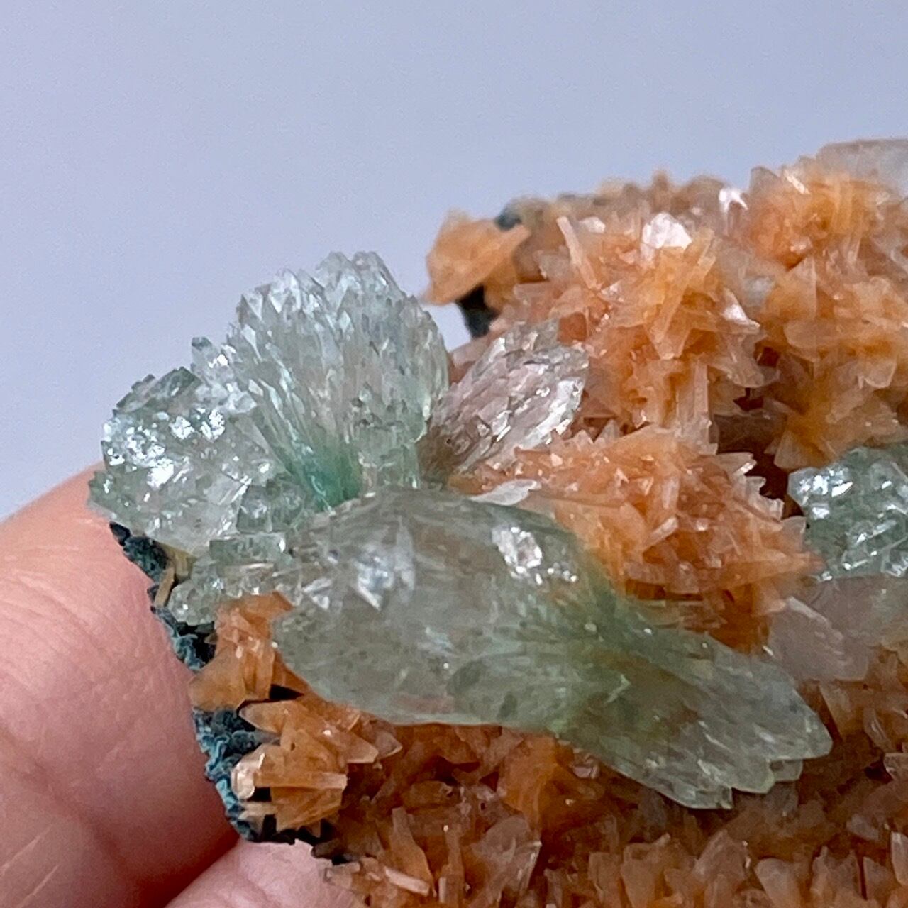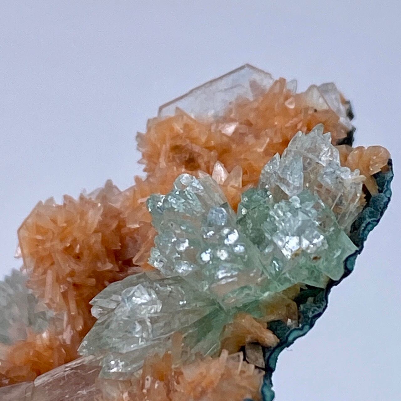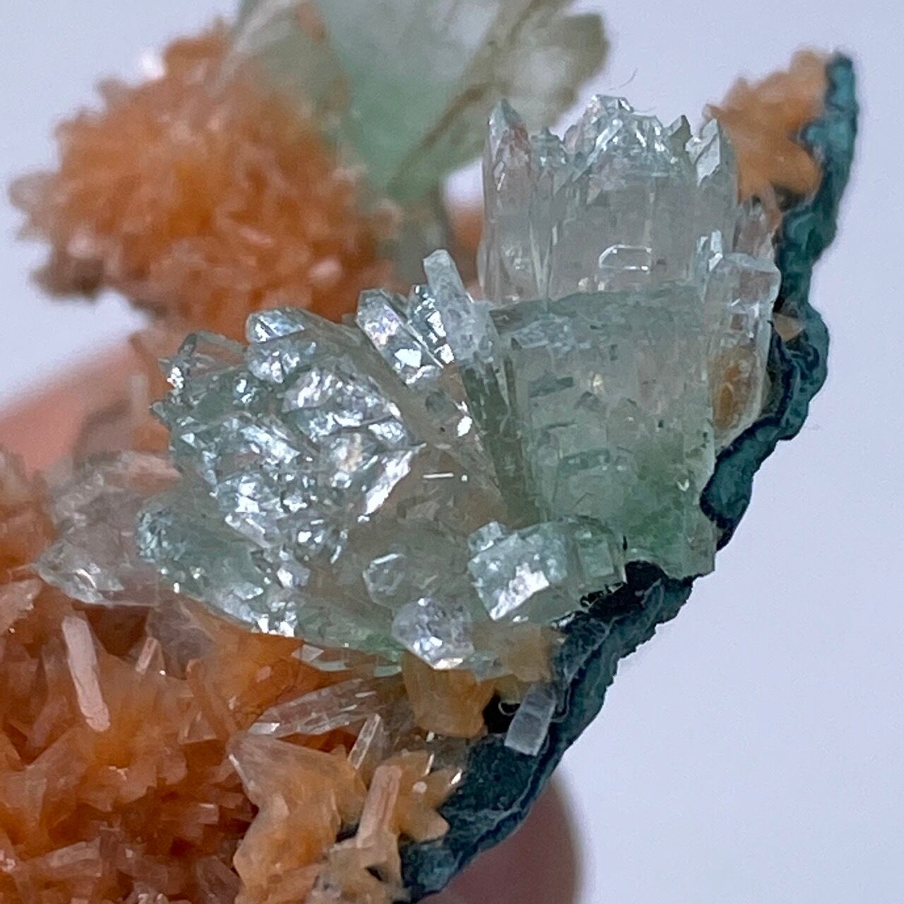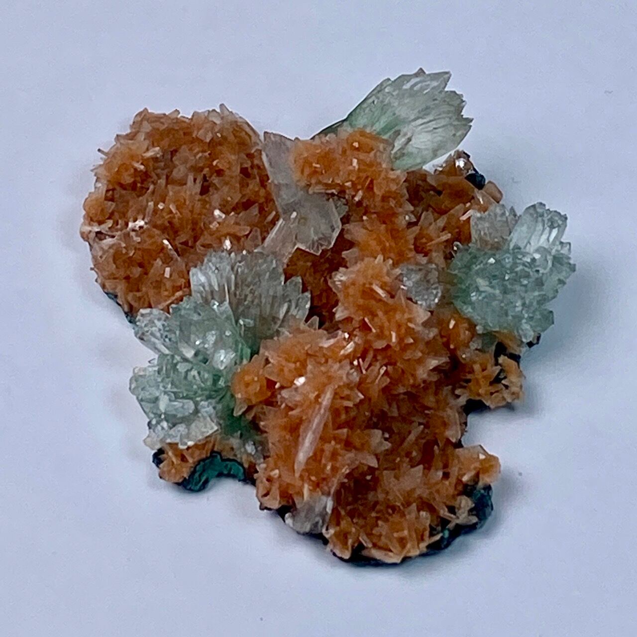 インドの息子的存在からお迎えした、蝶ネクタイ型のグリーンアポフィライトを抱く、レア系の赤い(実際はキャロットのようなオレンジ色です)ヒューランダイトのクラスターです。