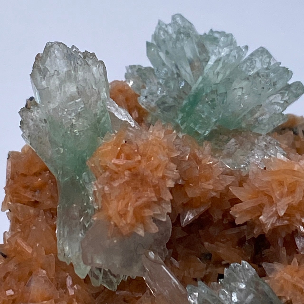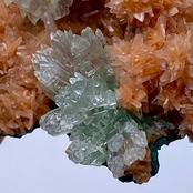 グリーンアポフィライト共生レッドヒューランダイトクラスター Red heulandite cluster symbiotic with bowtie shaped green apophyllite RW6172