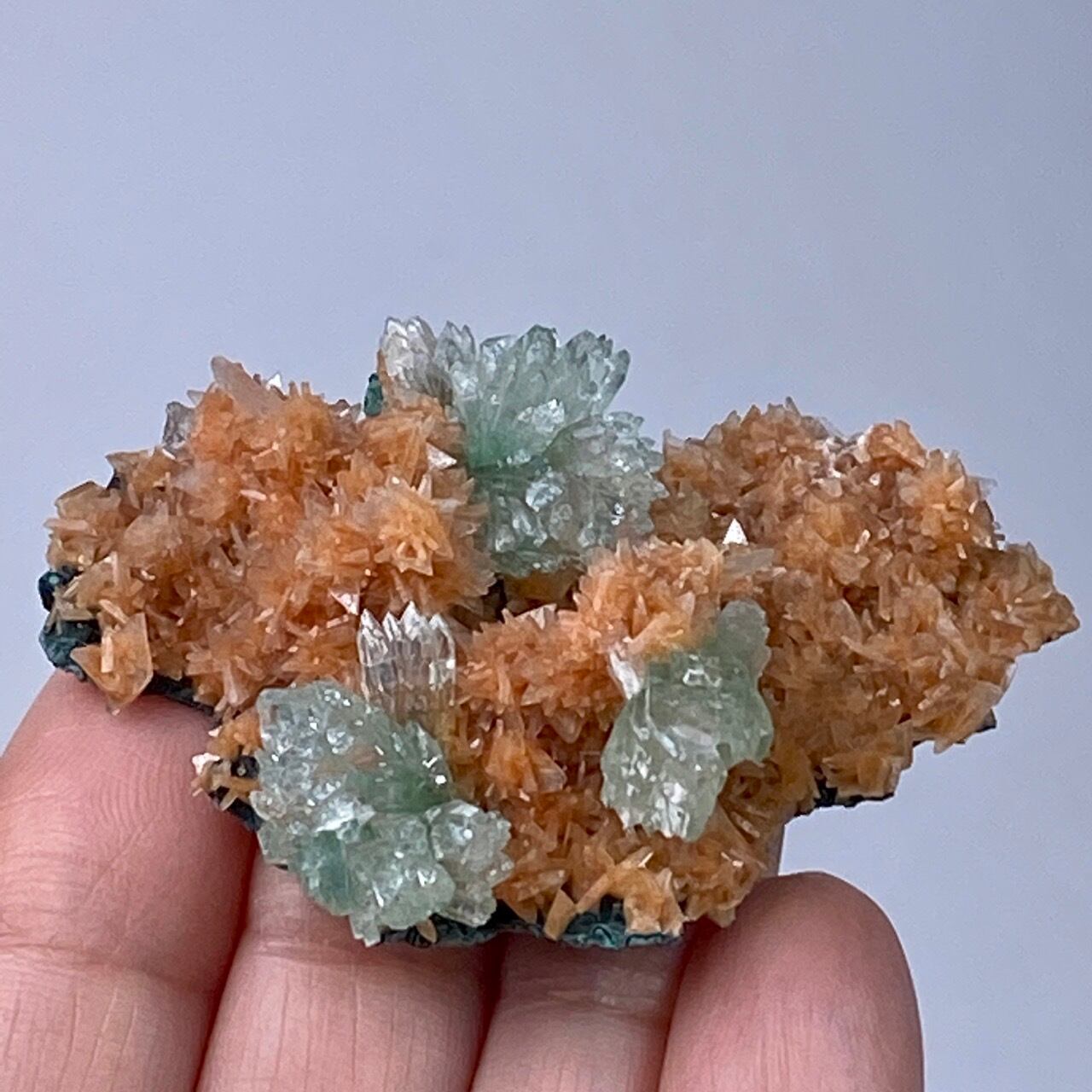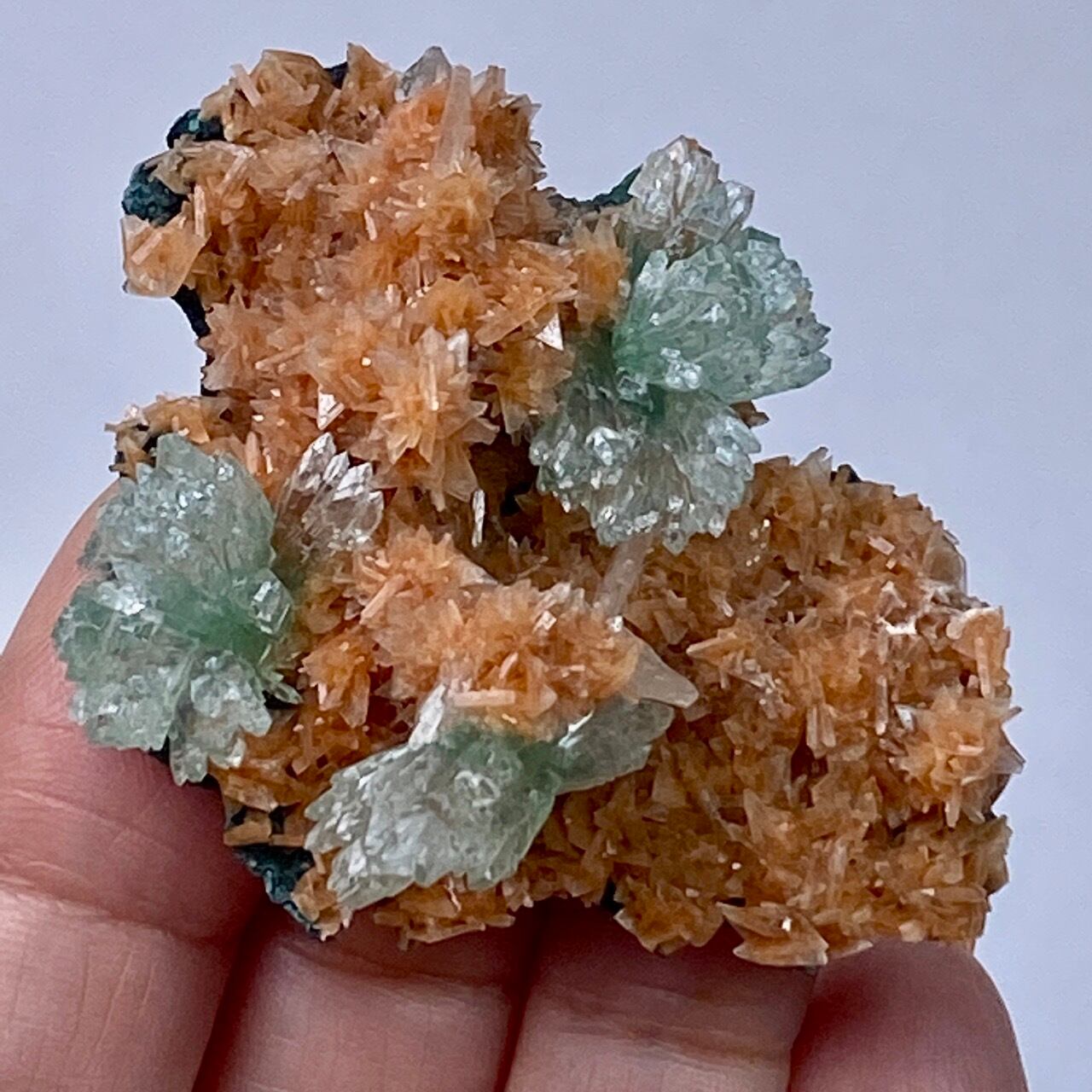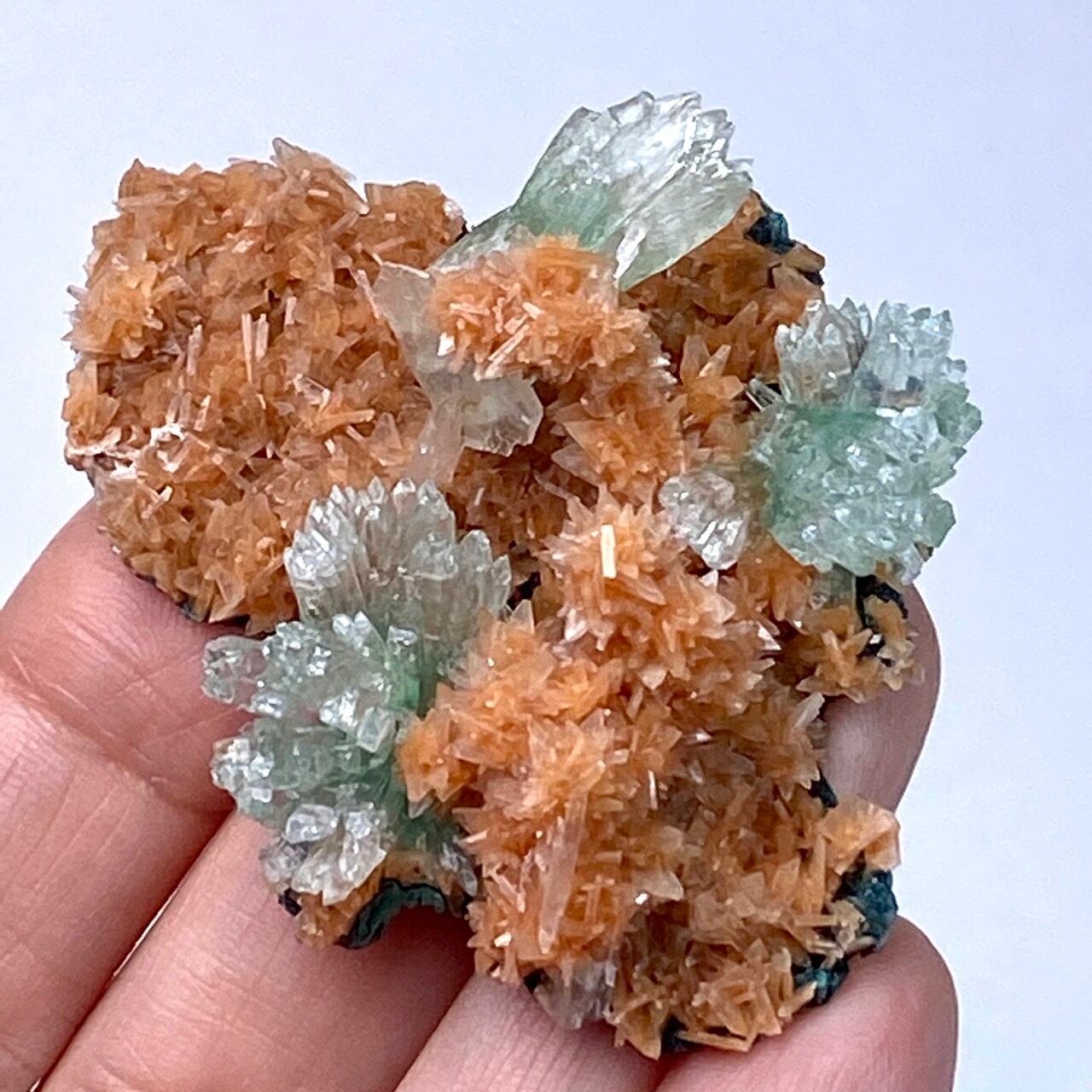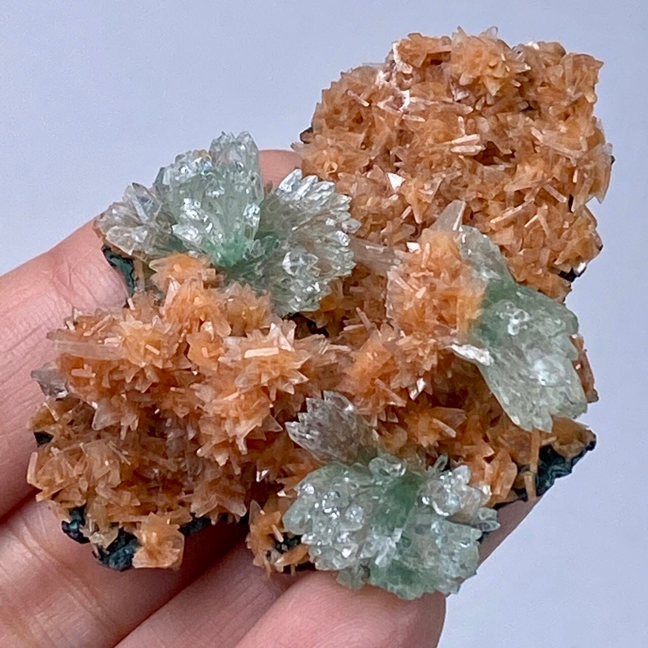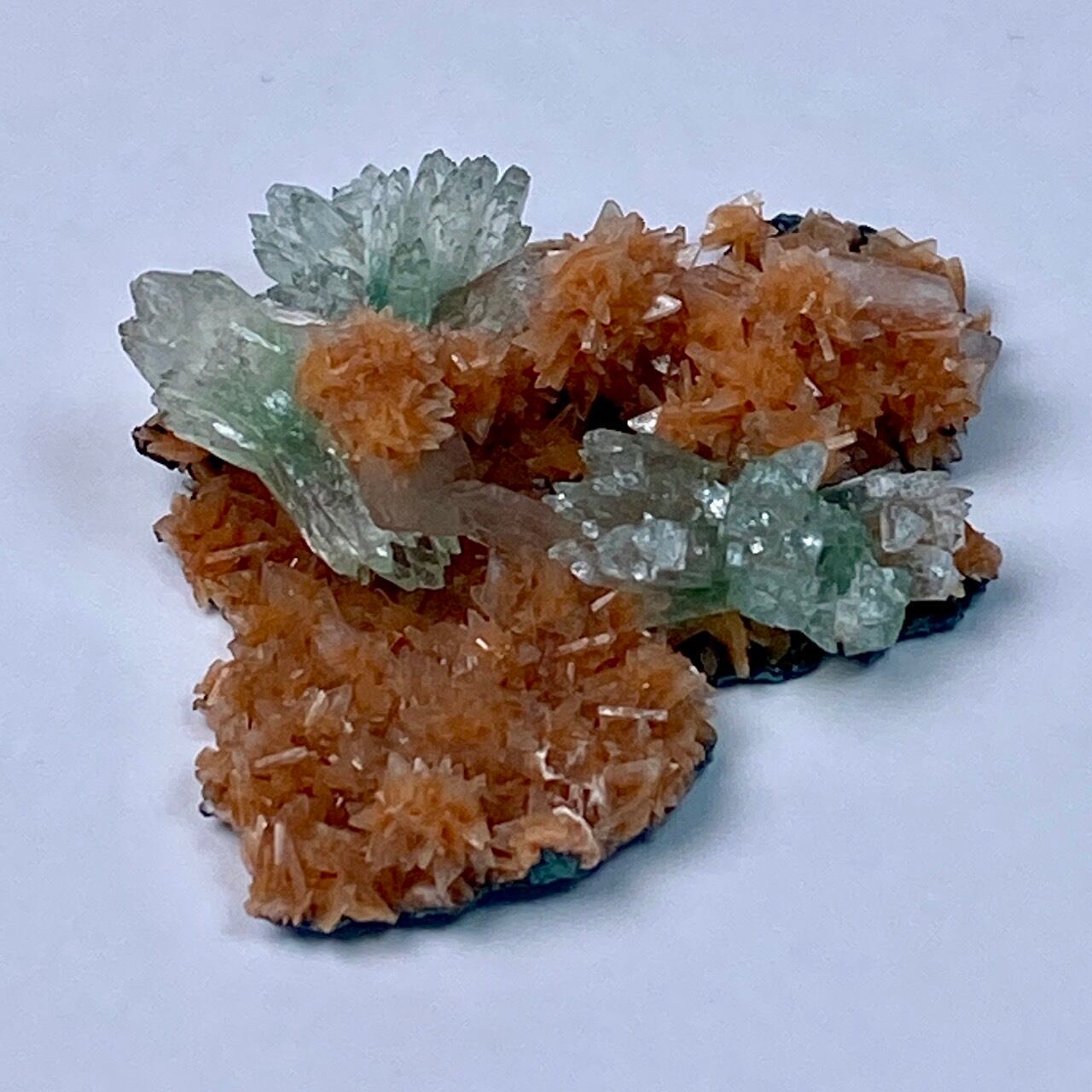 きらきらと光を放つヒューランダイトは、まるでお花のポンポンみたいな形状でスーパーキュート。所々に、蝶ネクタイ型や放射状の優しいグリーンのグリーンアポフィライトが煌めき、ブローチみたいにキュートなクラスターです。店主のモニターでは、実際の色味は2枚目の画像のものに近いです。