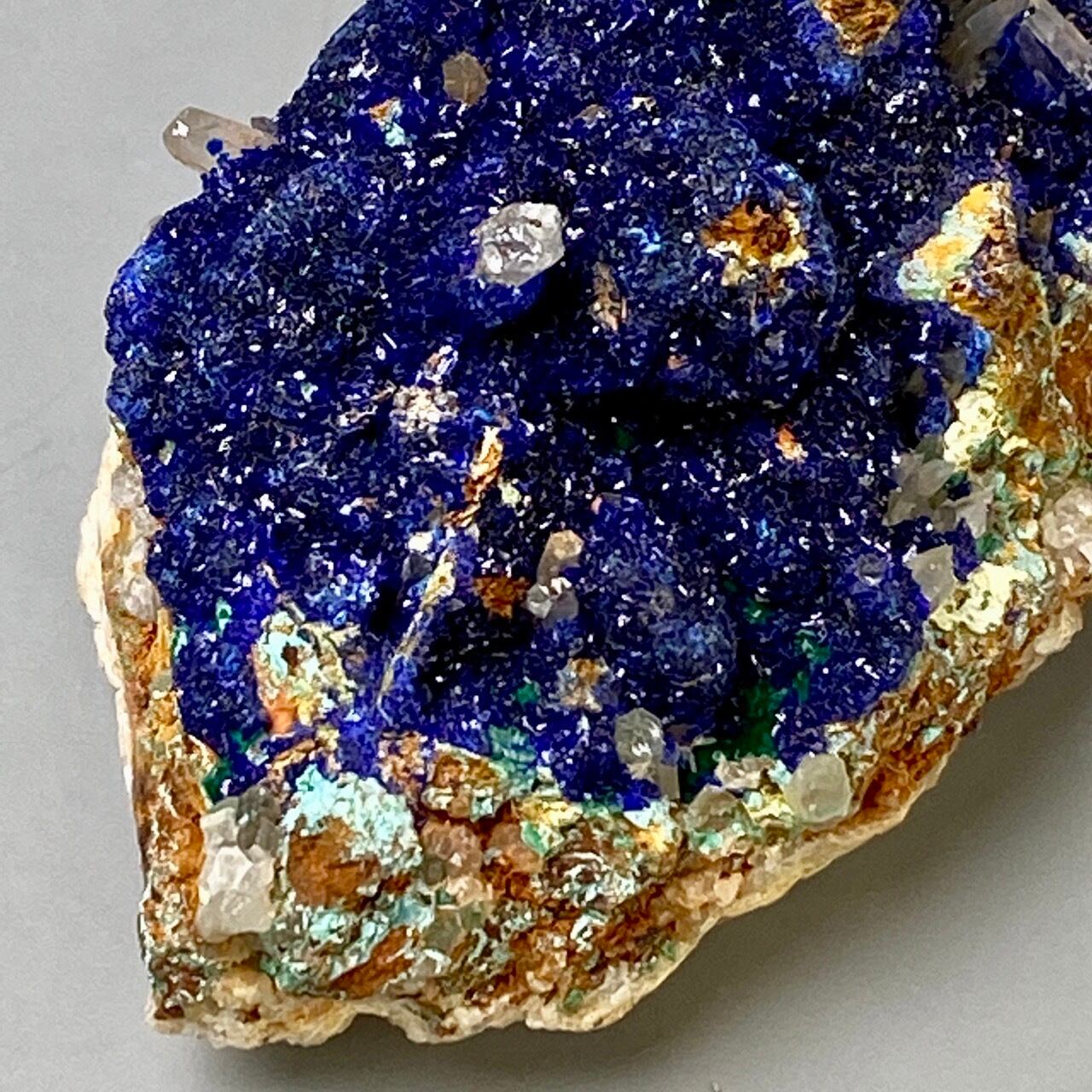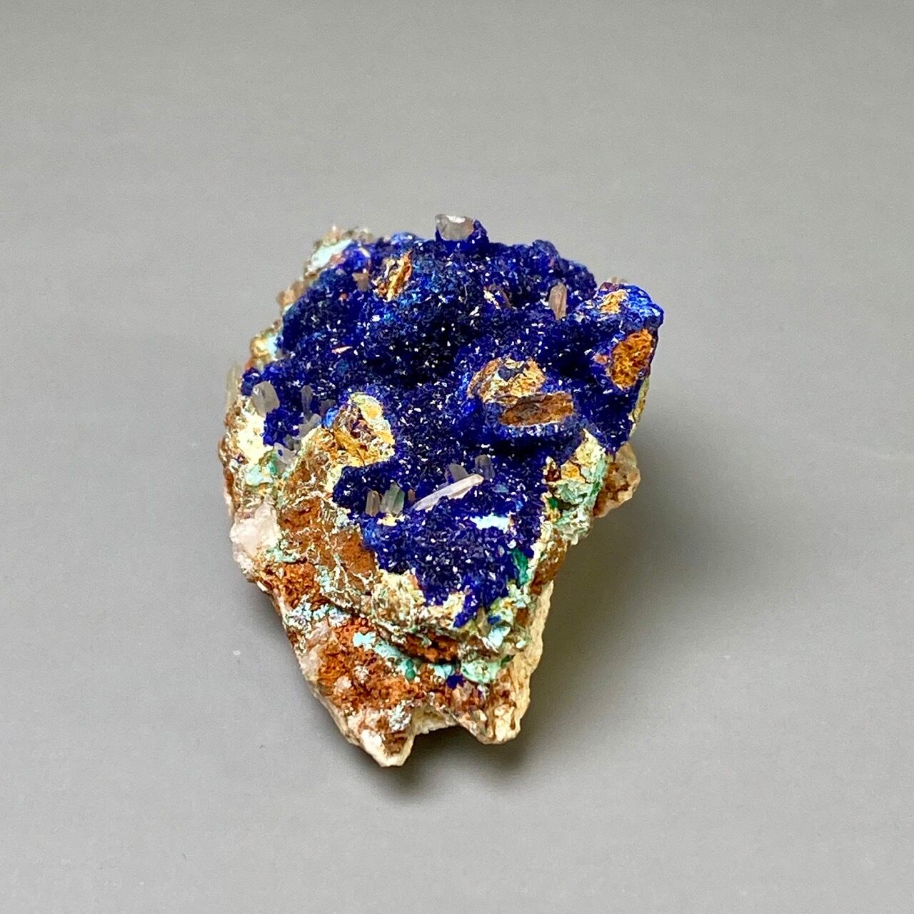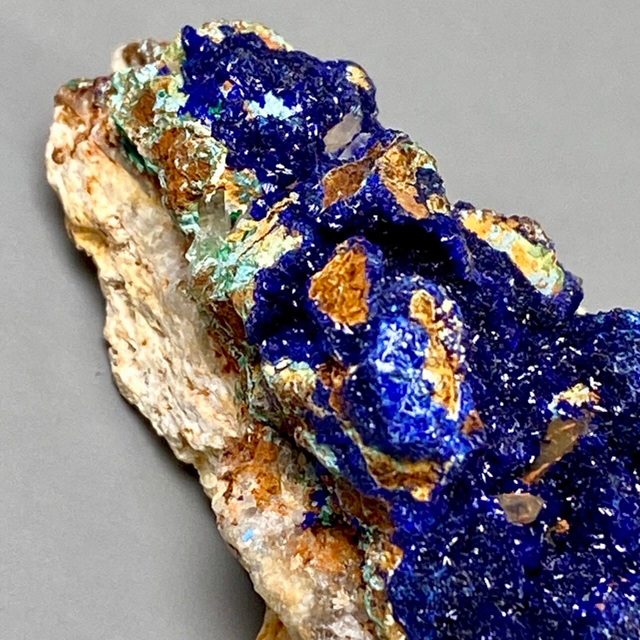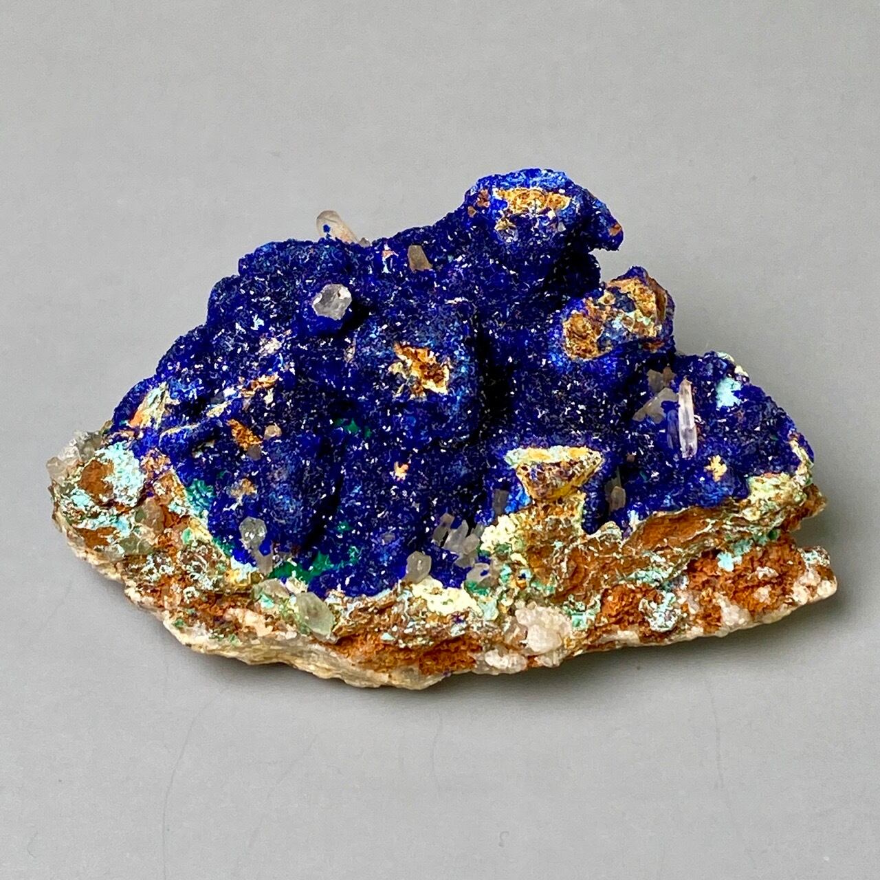 キュートでトロピカルな見た目の母岩がアズライトの上にも若干付着しているところが可愛く、少量のマラカイト(グリーン)がアズライトの深い青をより一層引き立てています。