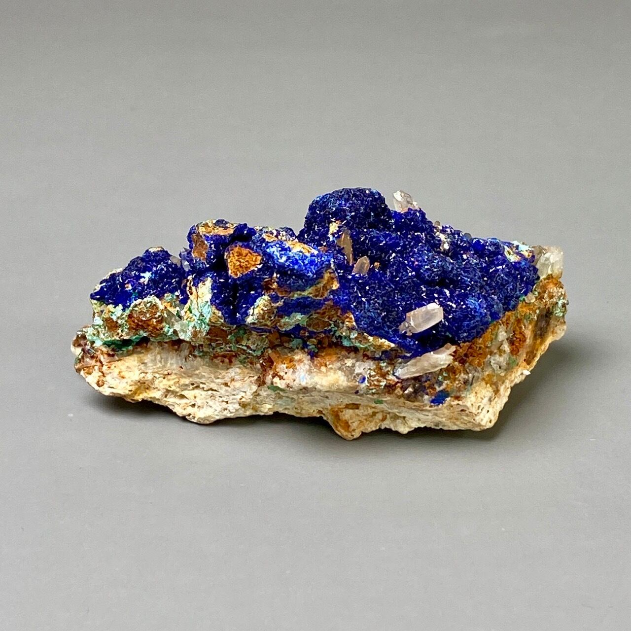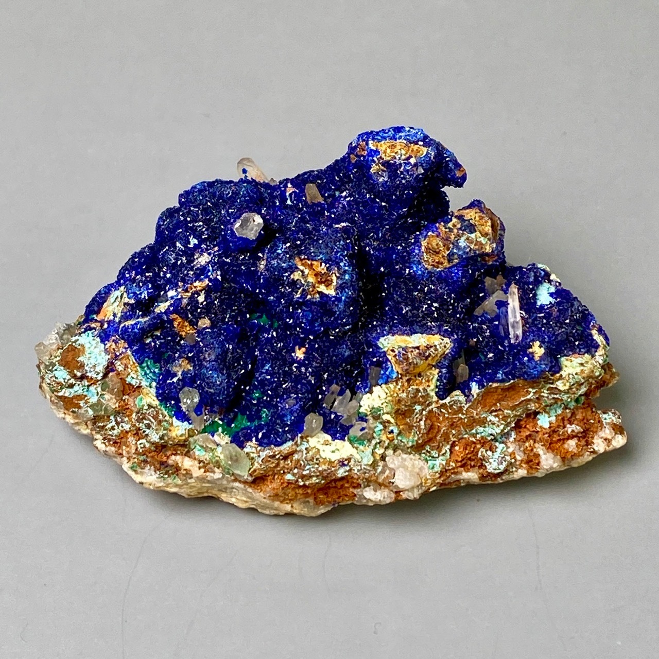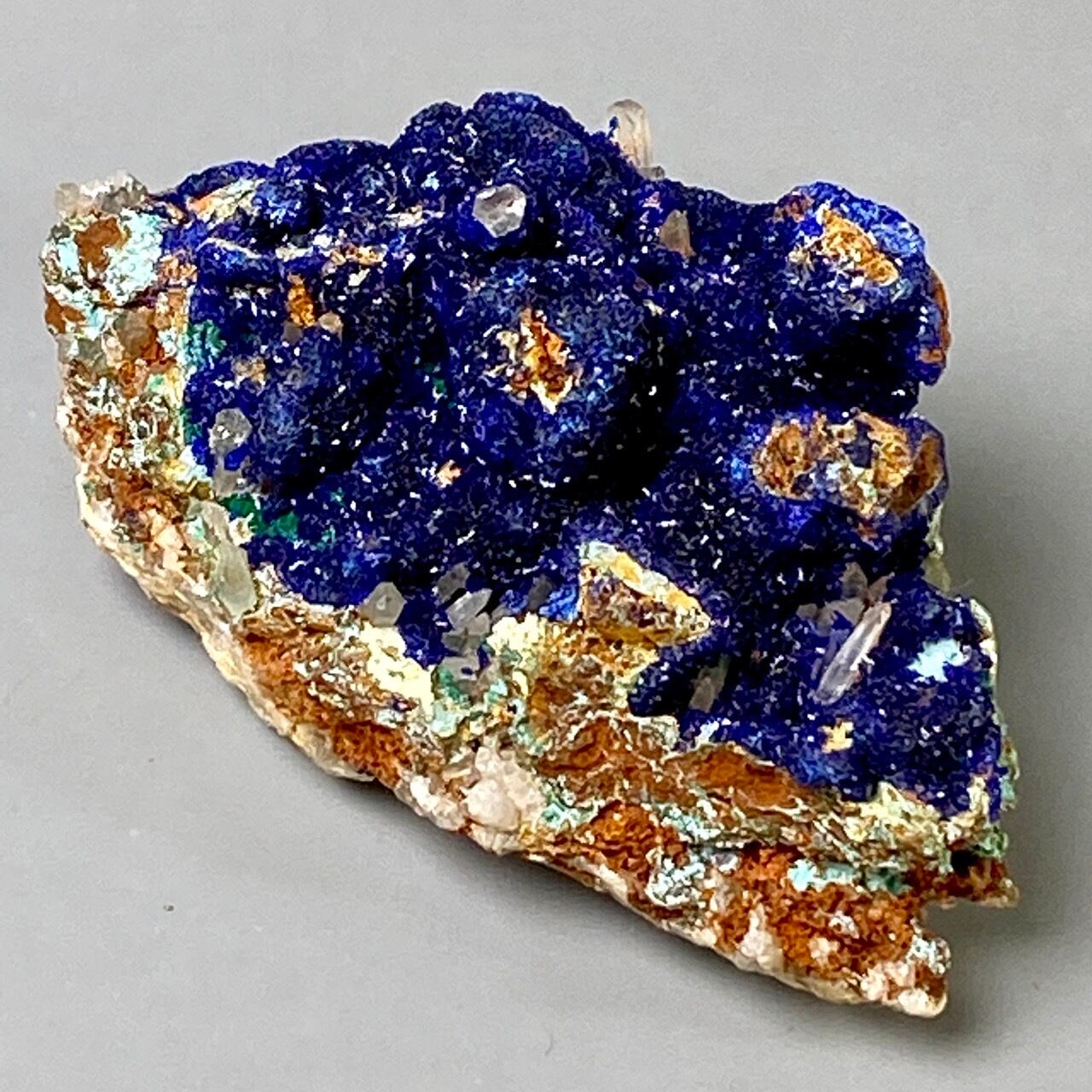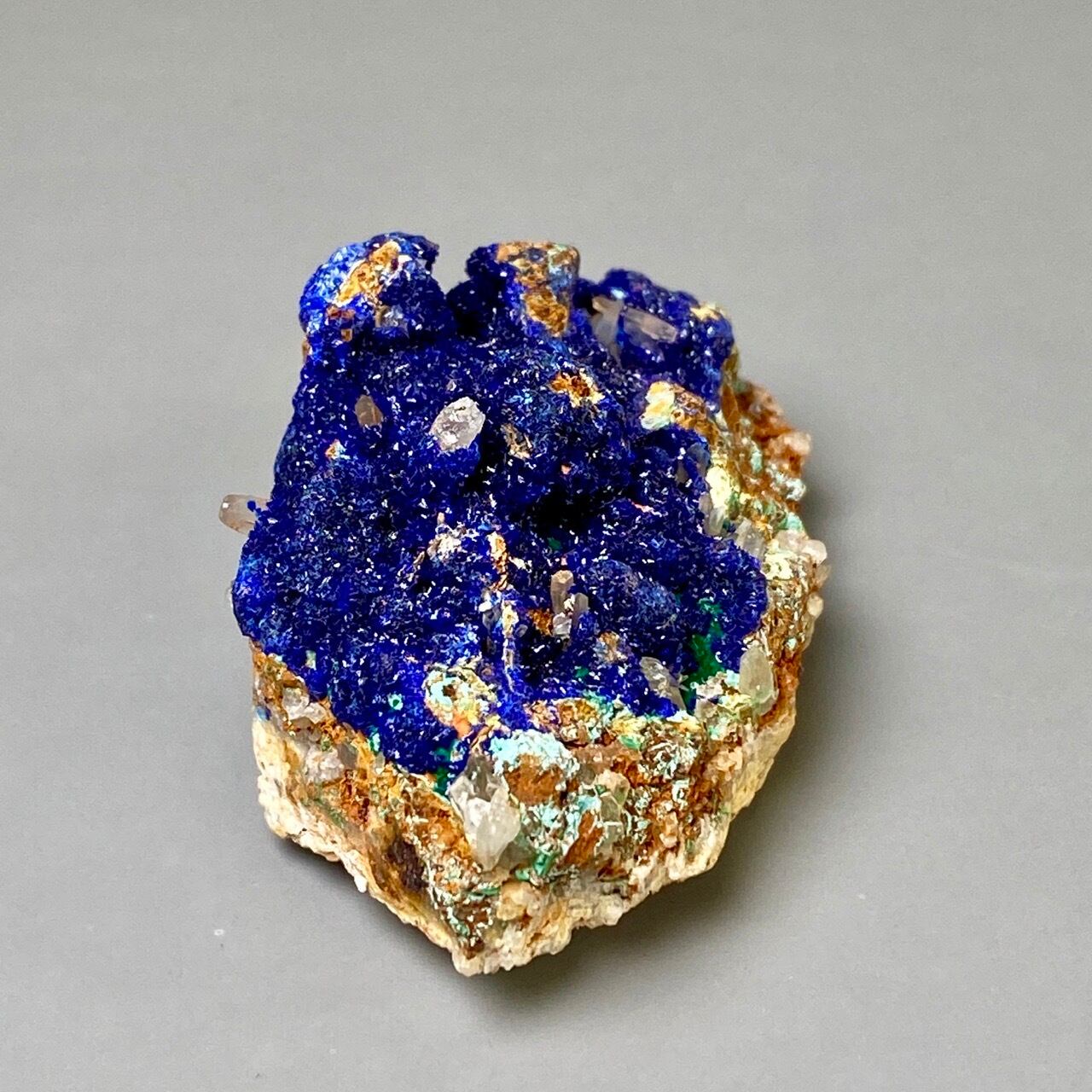 キュートでトロピカルな見た目の母岩がアズライトの上にも若干付着しているところが可愛く、少量のマラカイト(グリーン)がアズライトの深い青をより一層引き立てています。