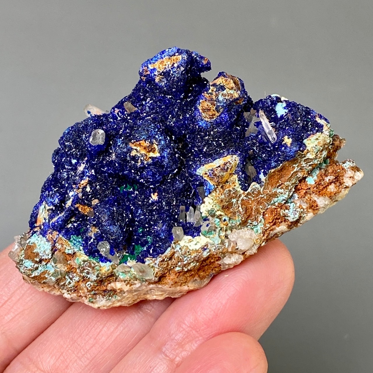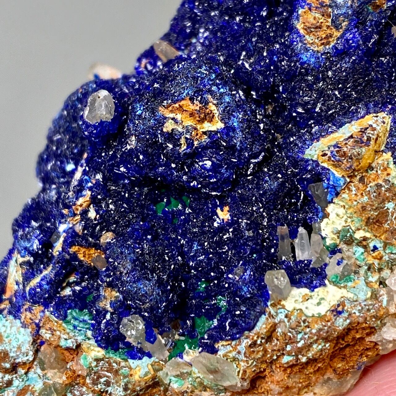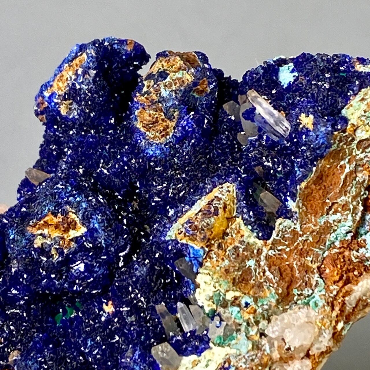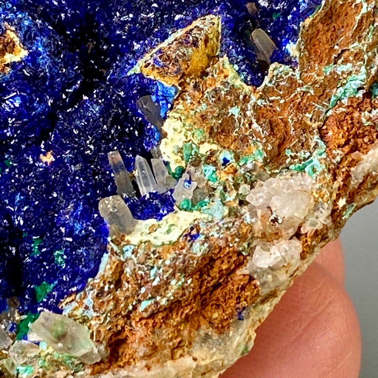 キュートでトロピカルな見た目の母岩がアズライトの上にも若干付着しているところが可愛く、少量のマラカイト(グリーン)がアズライトの深い青をより一層引き立てています。