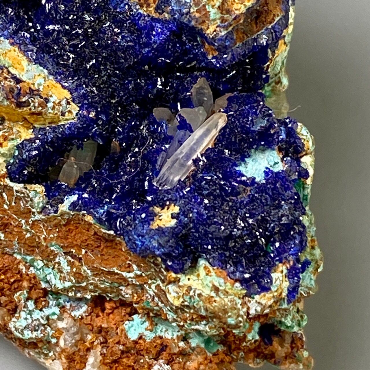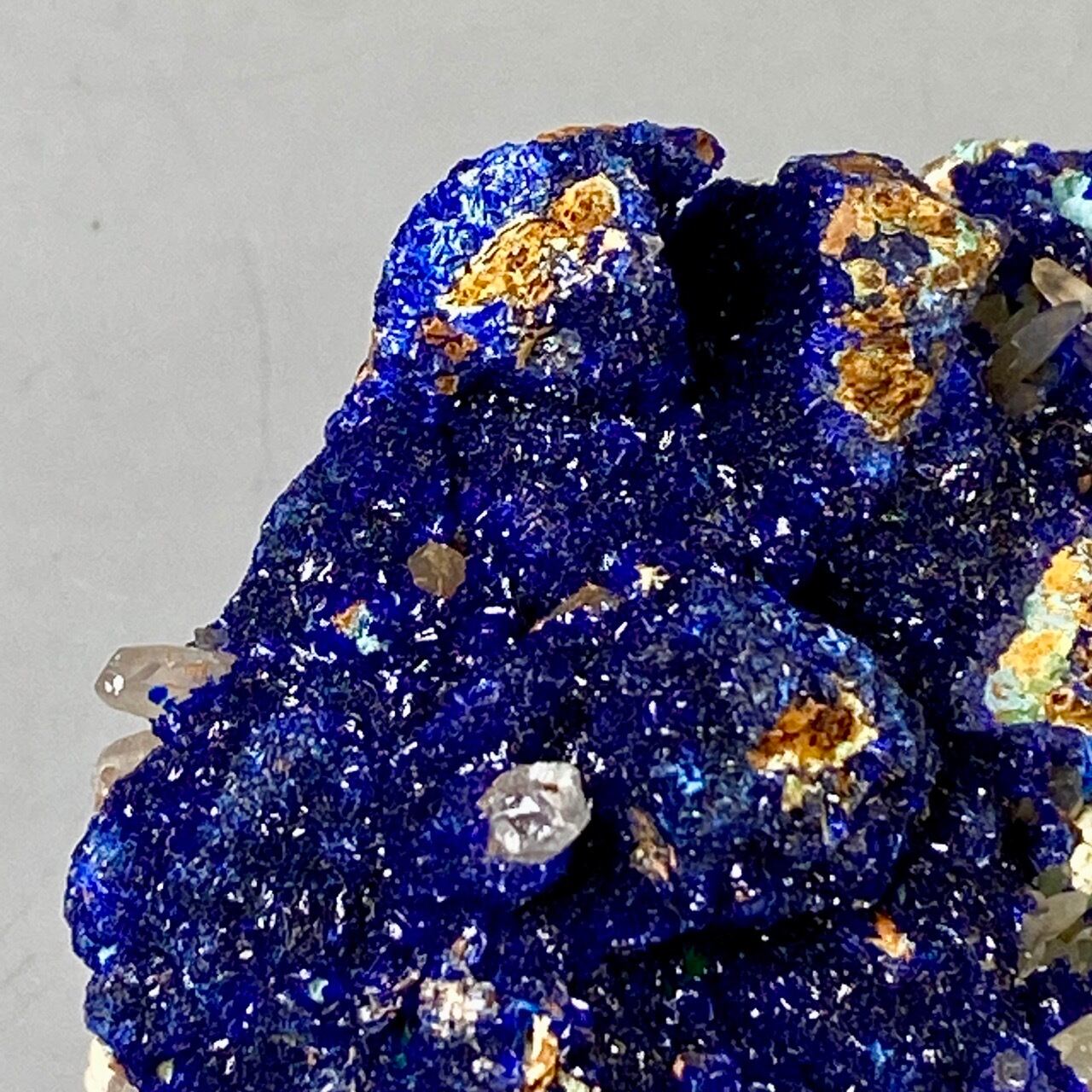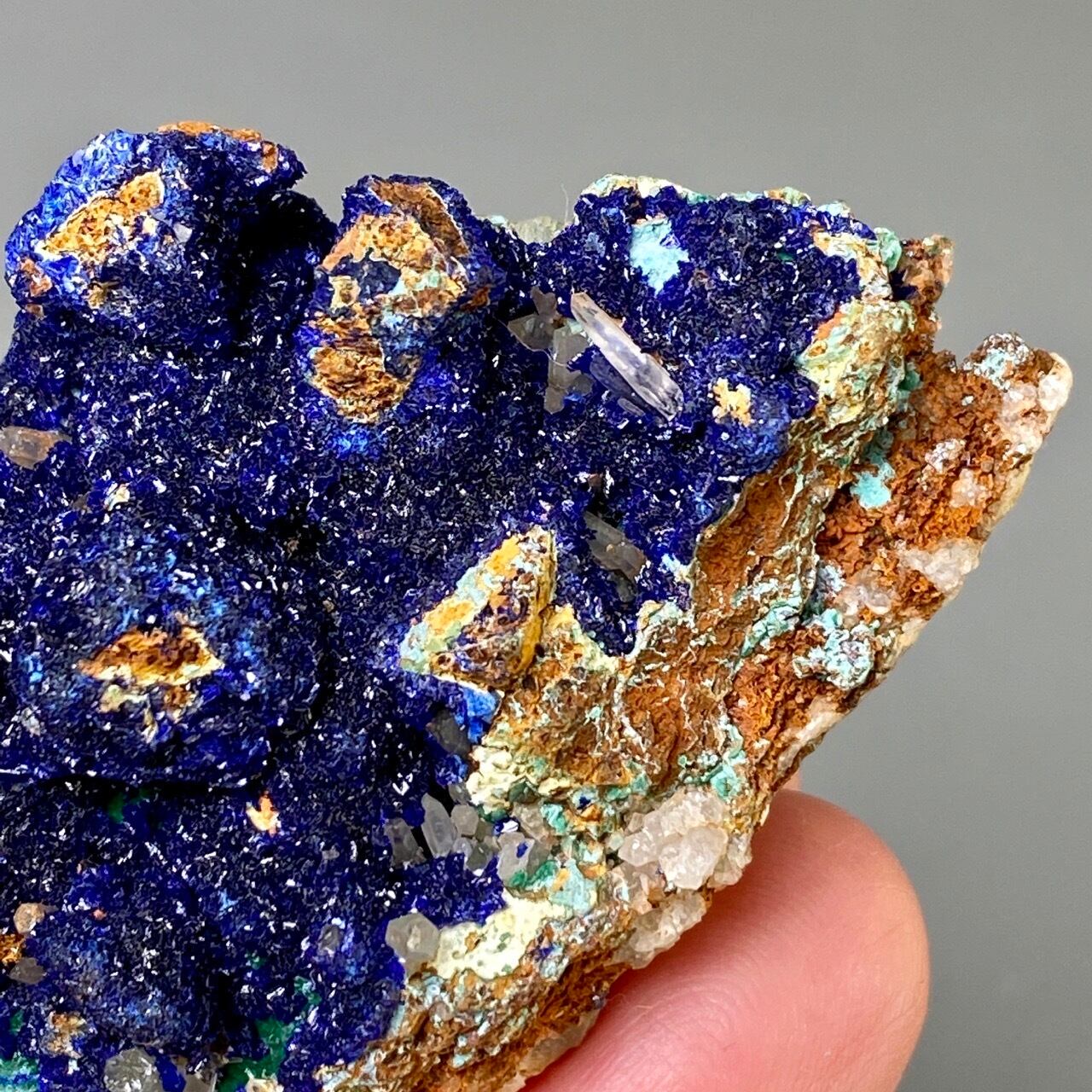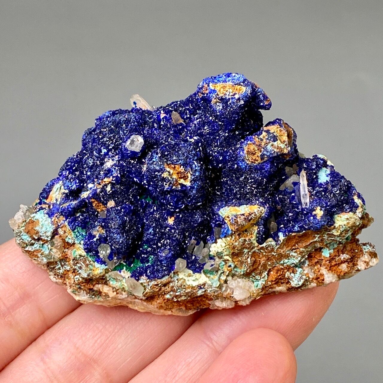 キュートでトロピカルな見た目の母岩がアズライトの上にも若干付着しているところが可愛く、少量のマラカイト(グリーン)がアズライトの深い青をより一層引き立てています。