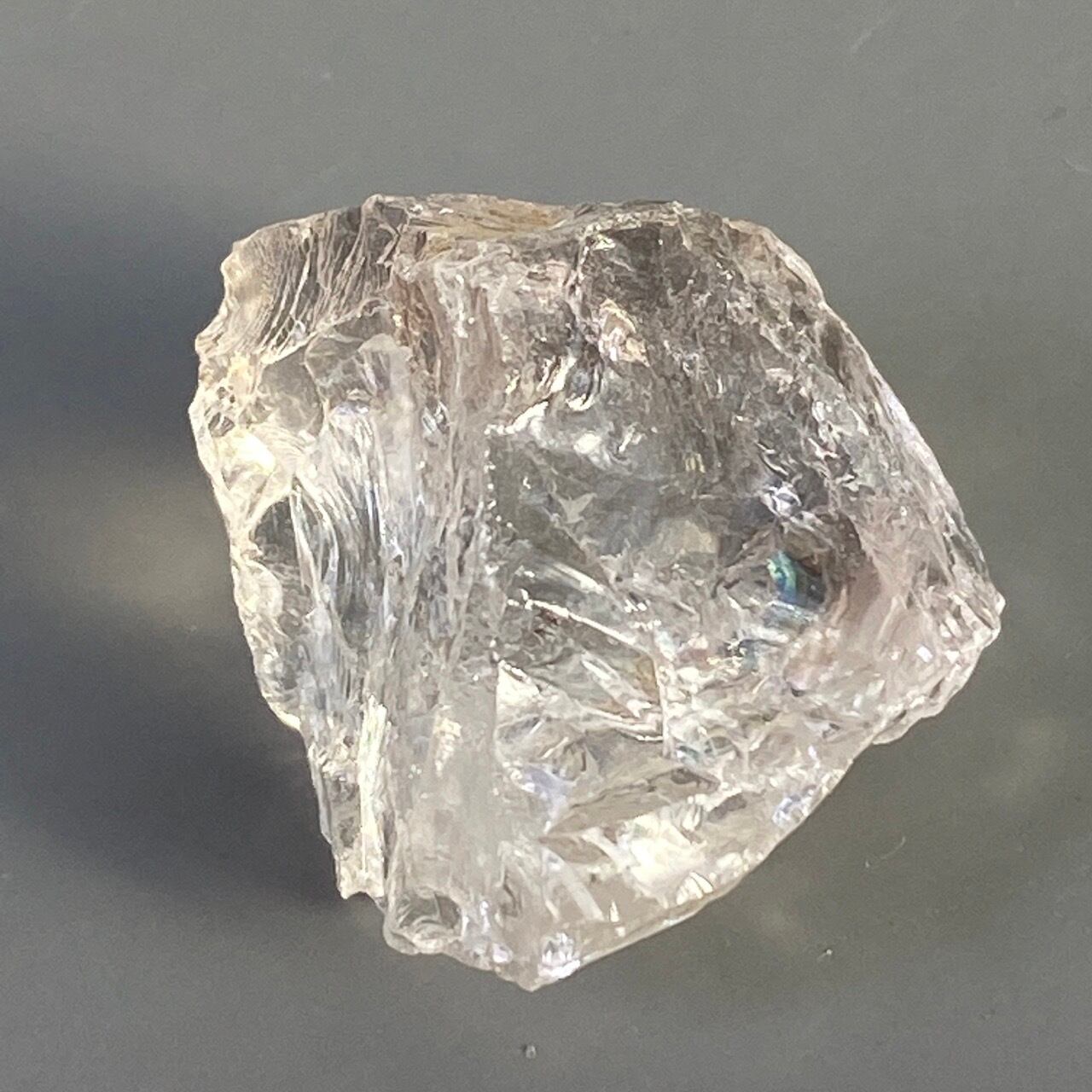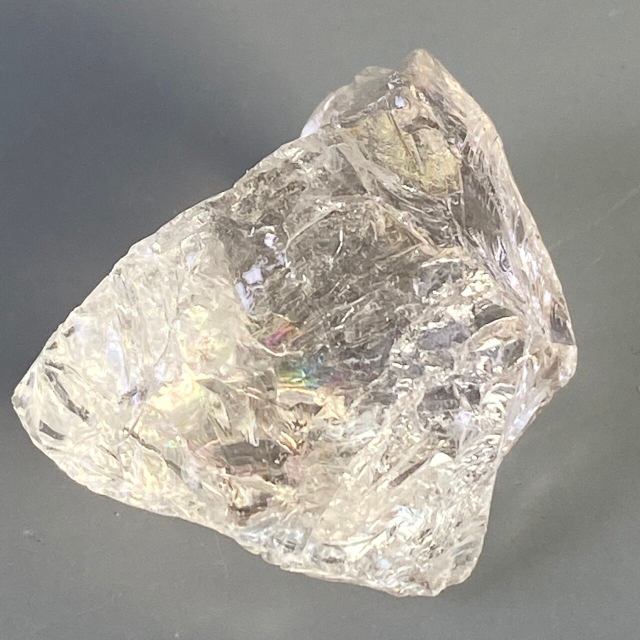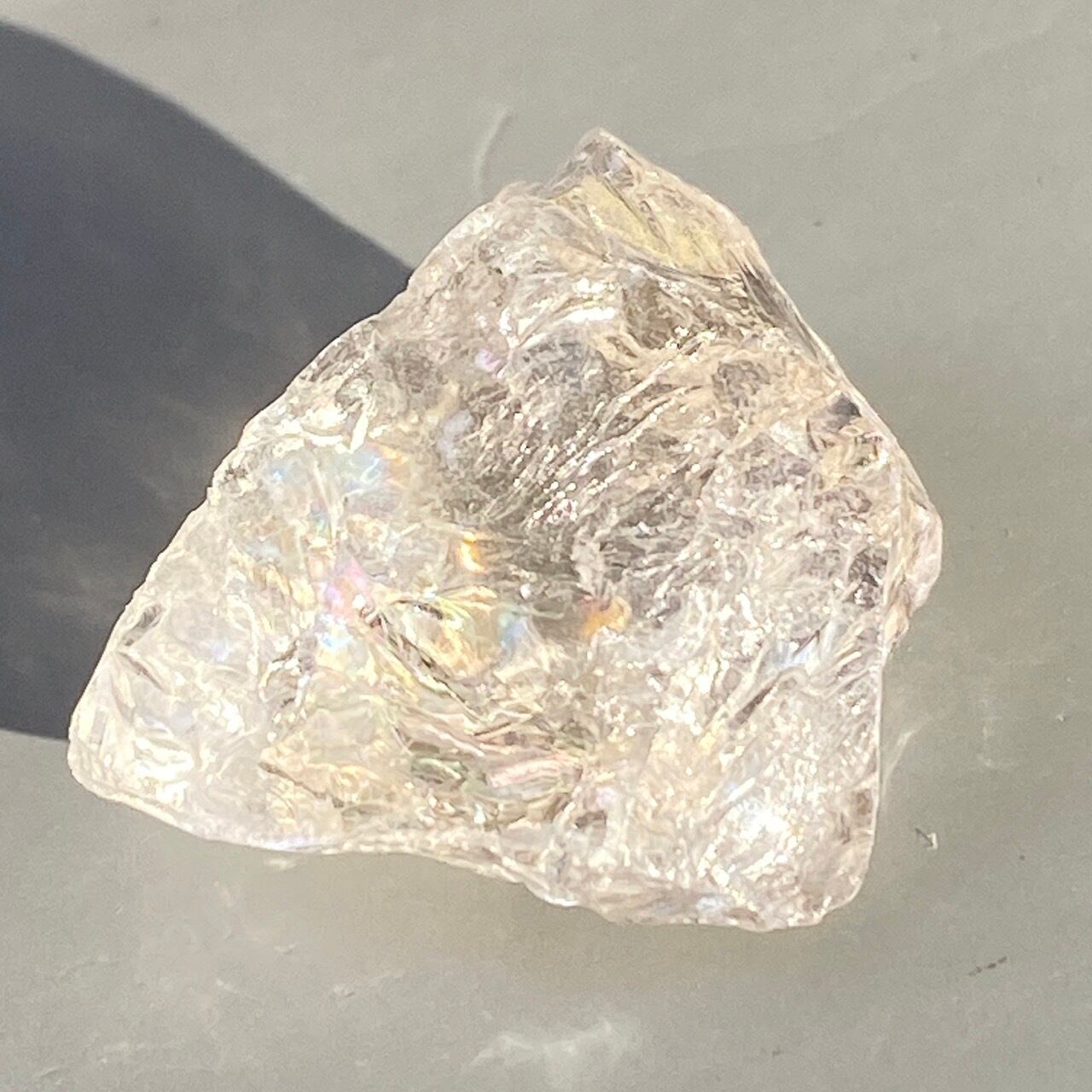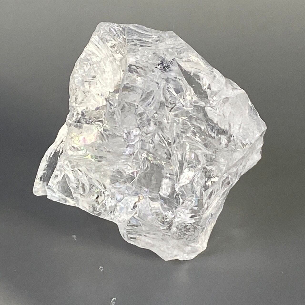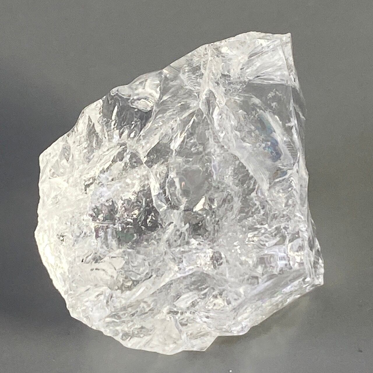 ブラジル産の透明感のある水晶に煌めく虹(画像では控えめに写っています)。ラフカットの良さは、表面にできるうねりのような流線形が水晶にダイナミックさおよびナチュラル感を与えているところです。氷を割った様な涼しげな見た目が水晶の魅力を引き出しています。