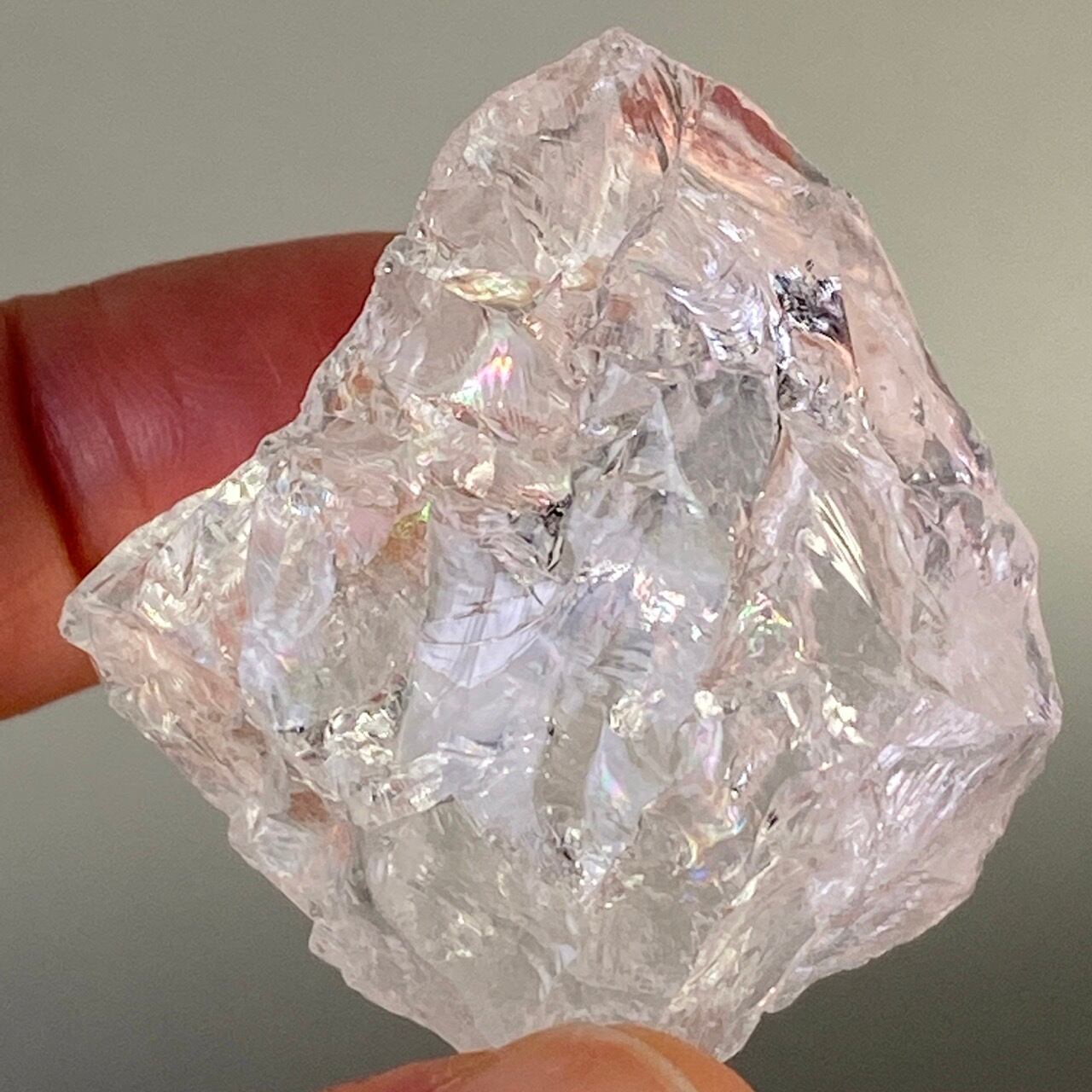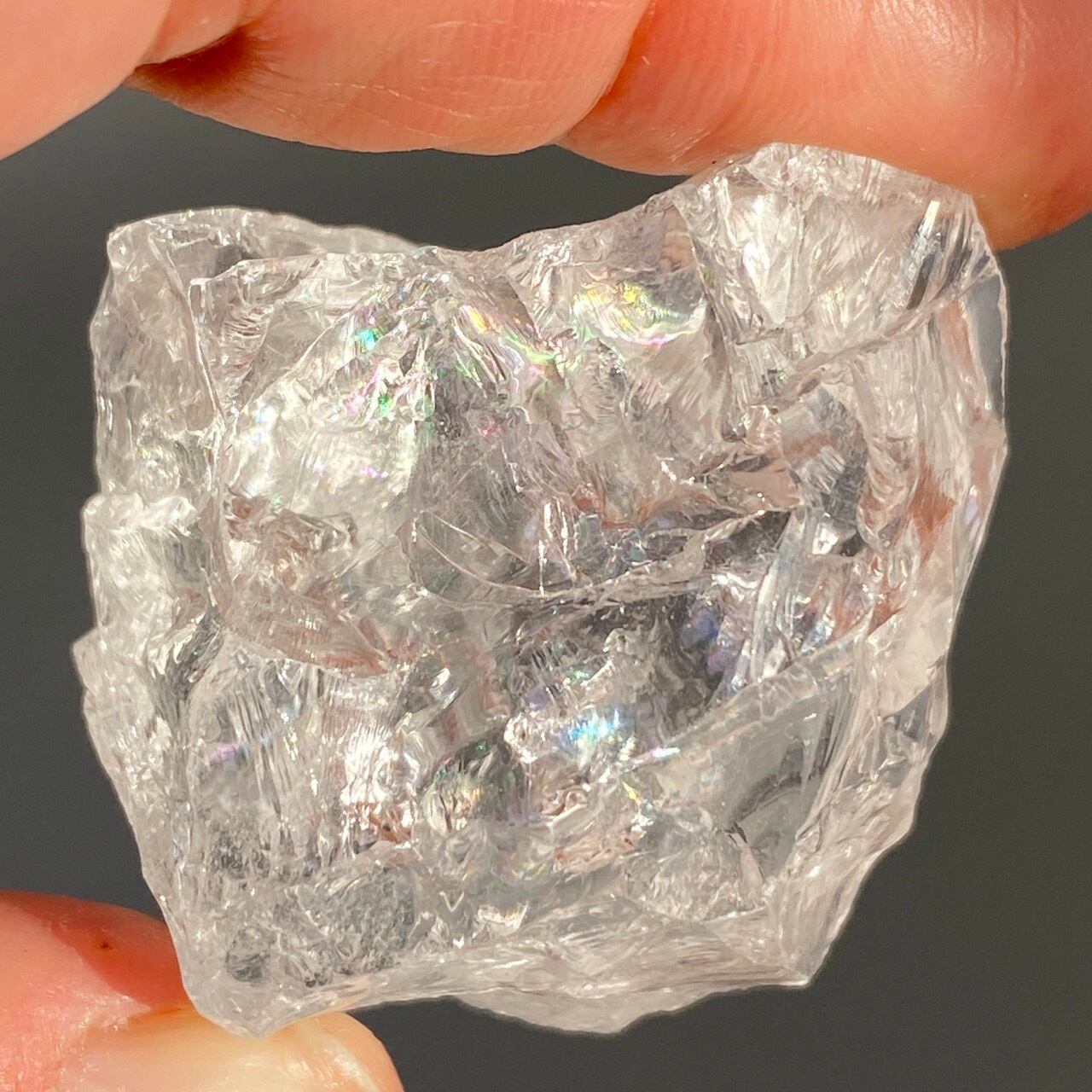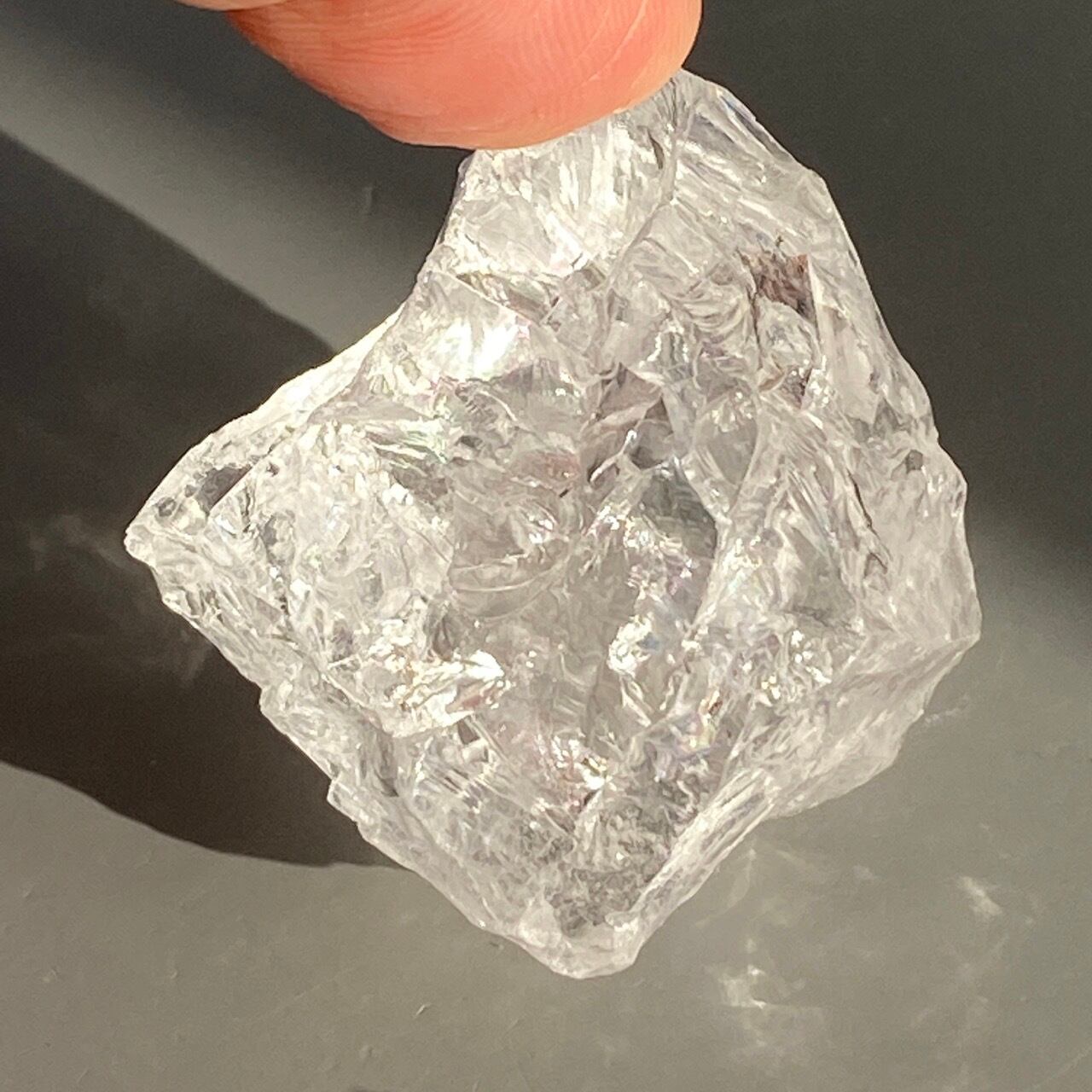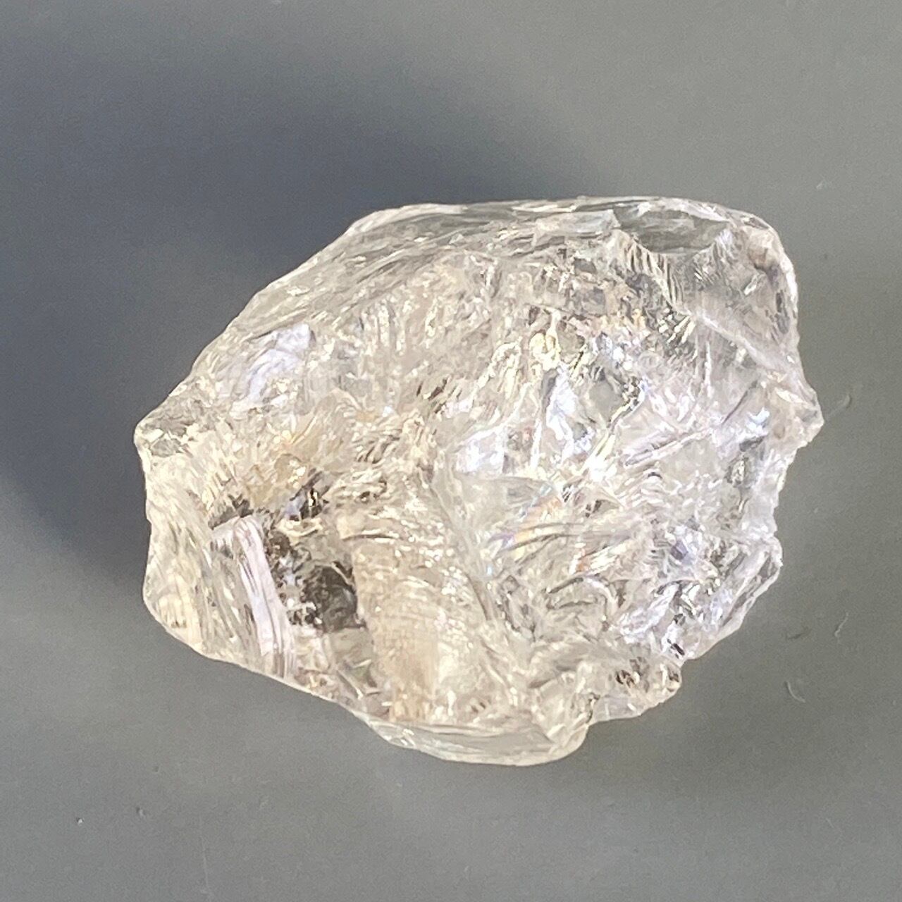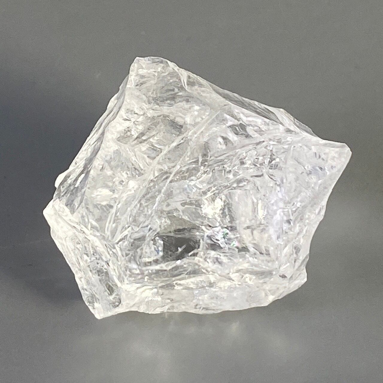 ブラジル産の透明感のある水晶に煌めく虹(画像では控えめに写っています)。ラフカットの良さは、表面にできるうねりのような流線形が水晶にダイナミックさおよびナチュラル感を与えているところです。氷を割った様な涼しげな見た目が水晶の魅力を引き出しています。