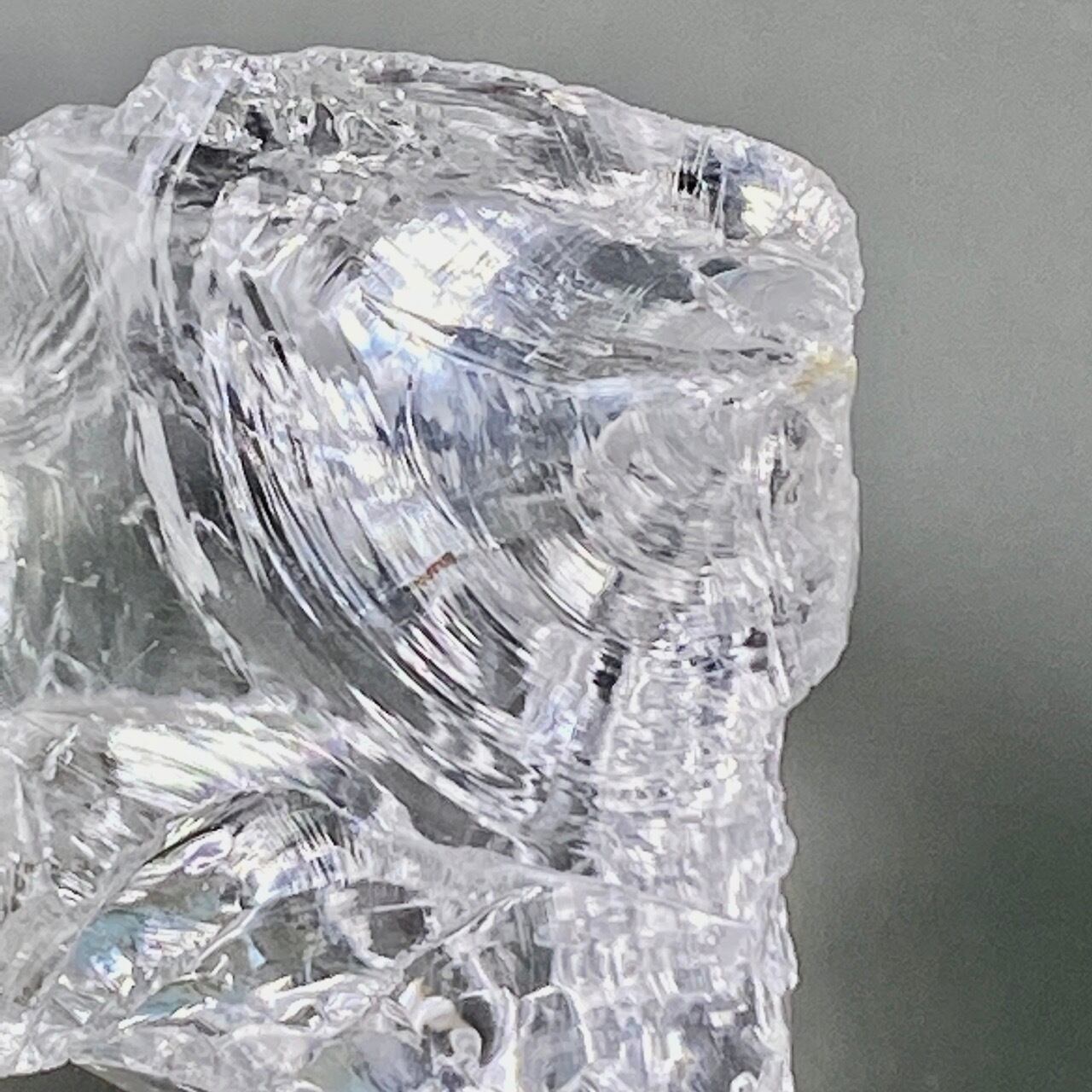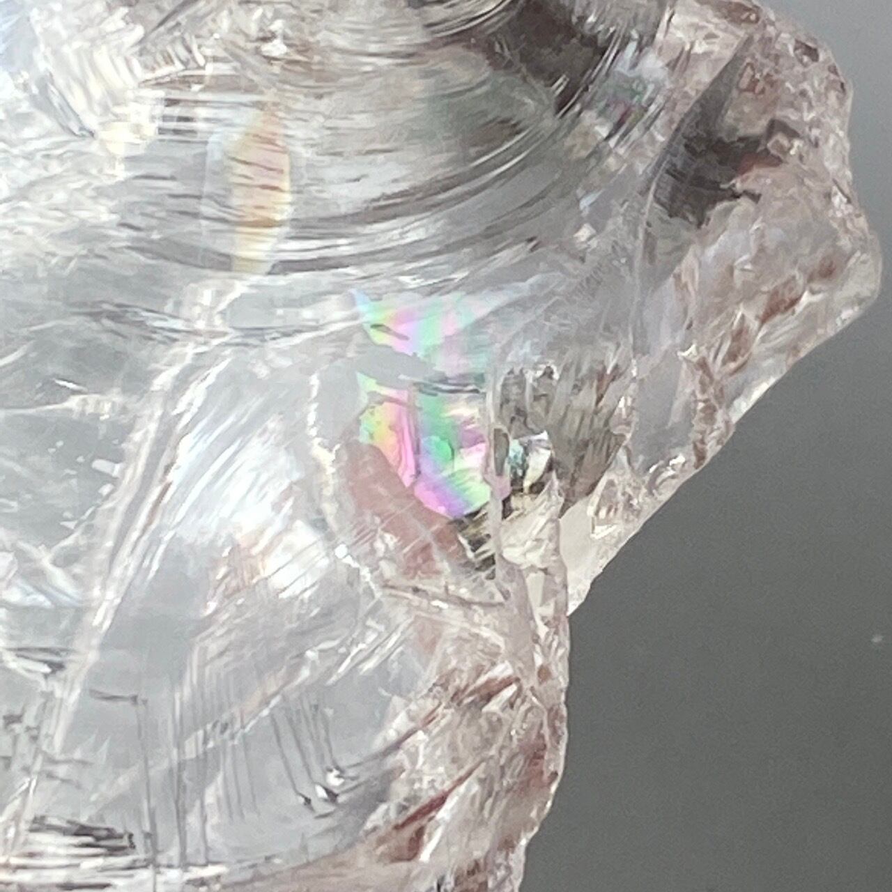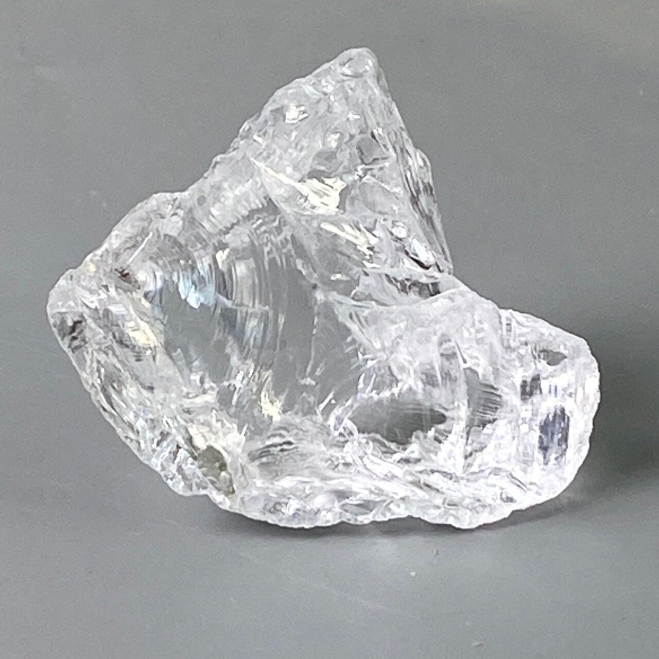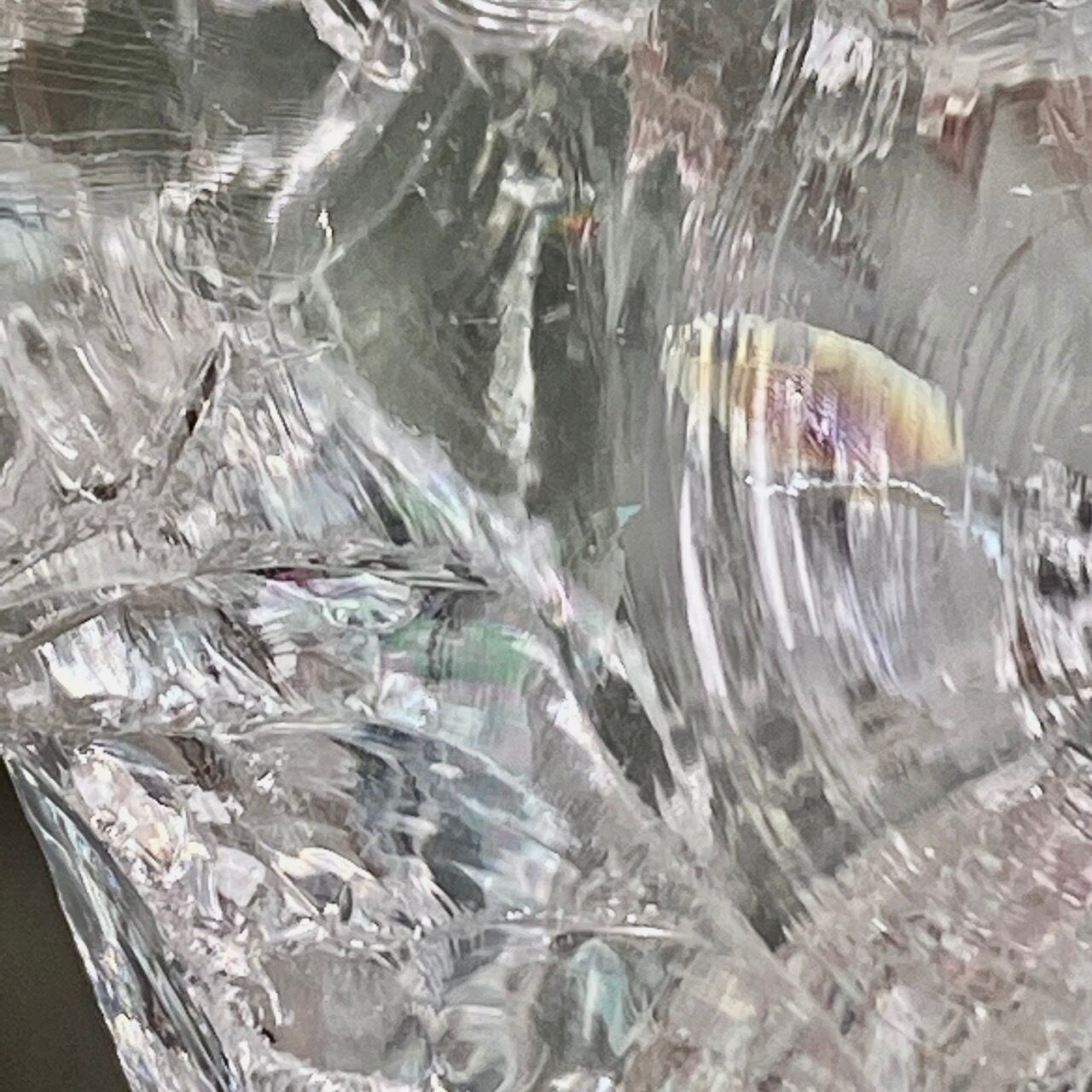 ブラジル産の透明感のある水晶に煌めく虹(画像では控えめに写っています)。ラフカットの良さは、表面にできるうねりのような流線形が水晶にダイナミックさおよびナチュラル感を与えているところです。氷を割った様な涼しげな見た目が水晶の魅力を引き出しています。