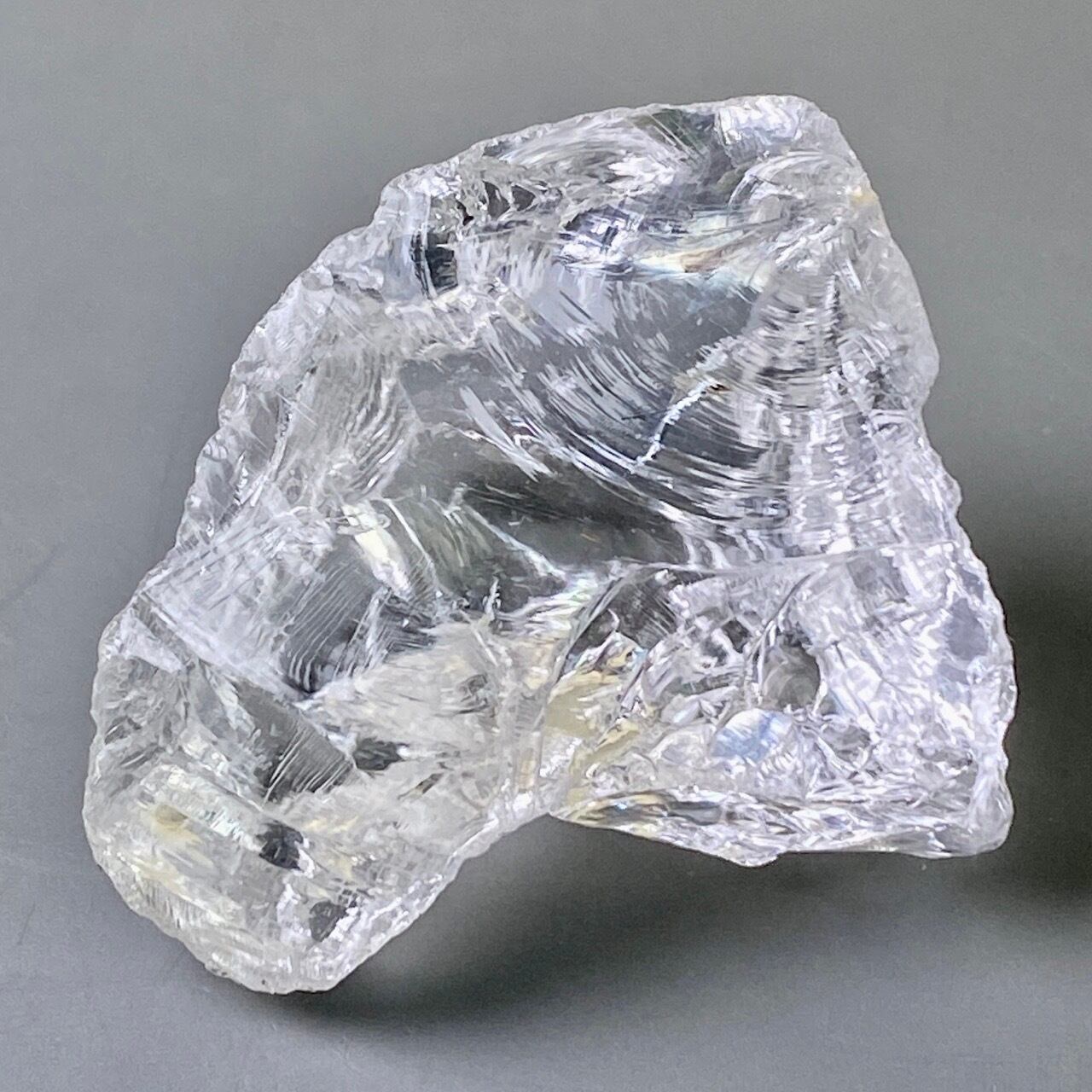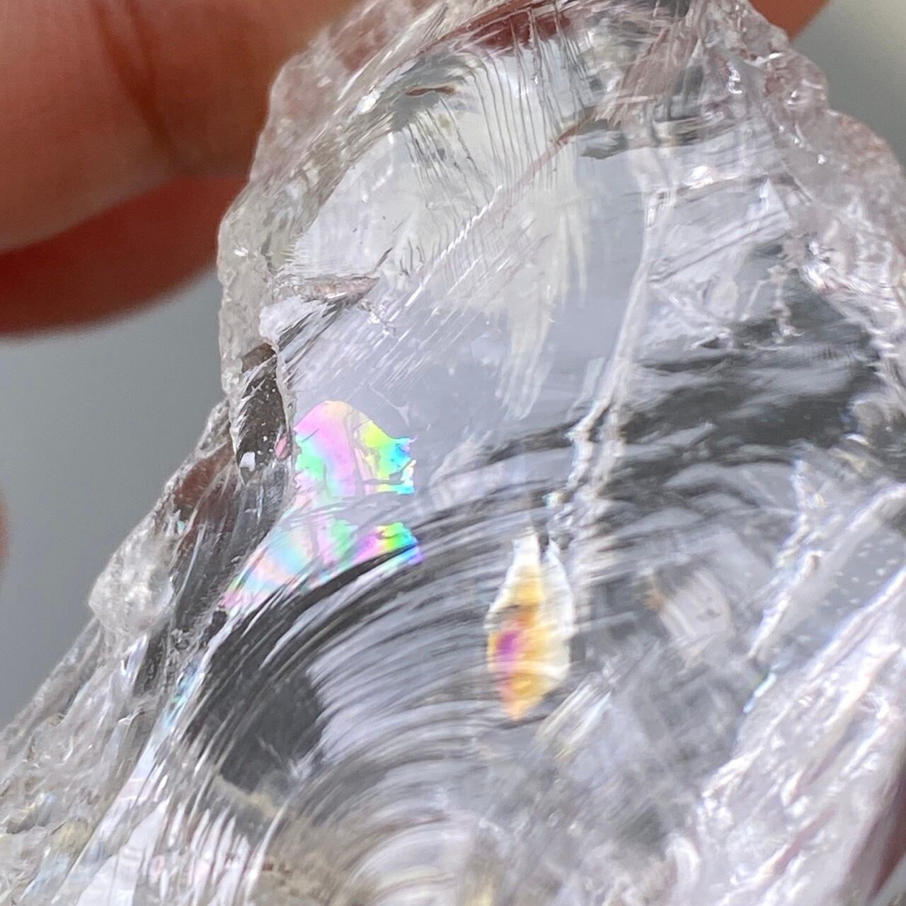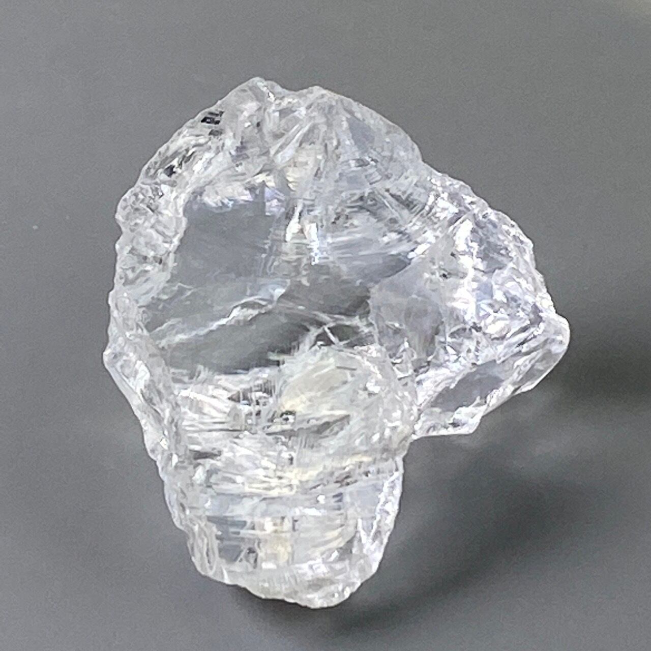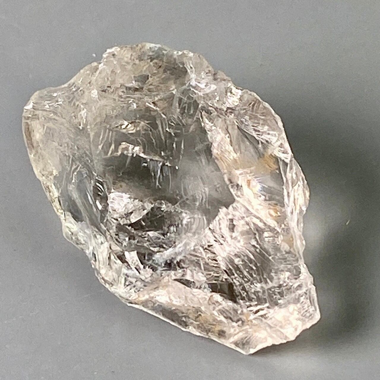 ブラジル産の透明感のある水晶に煌めく虹(画像では控えめに写っています)。ラフカットの良さは、表面にできるうねりのような流線形が水晶にダイナミックさおよびナチュラル感を与えているところです。氷を割った様な涼しげな見た目が水晶の魅力を引き出しています。