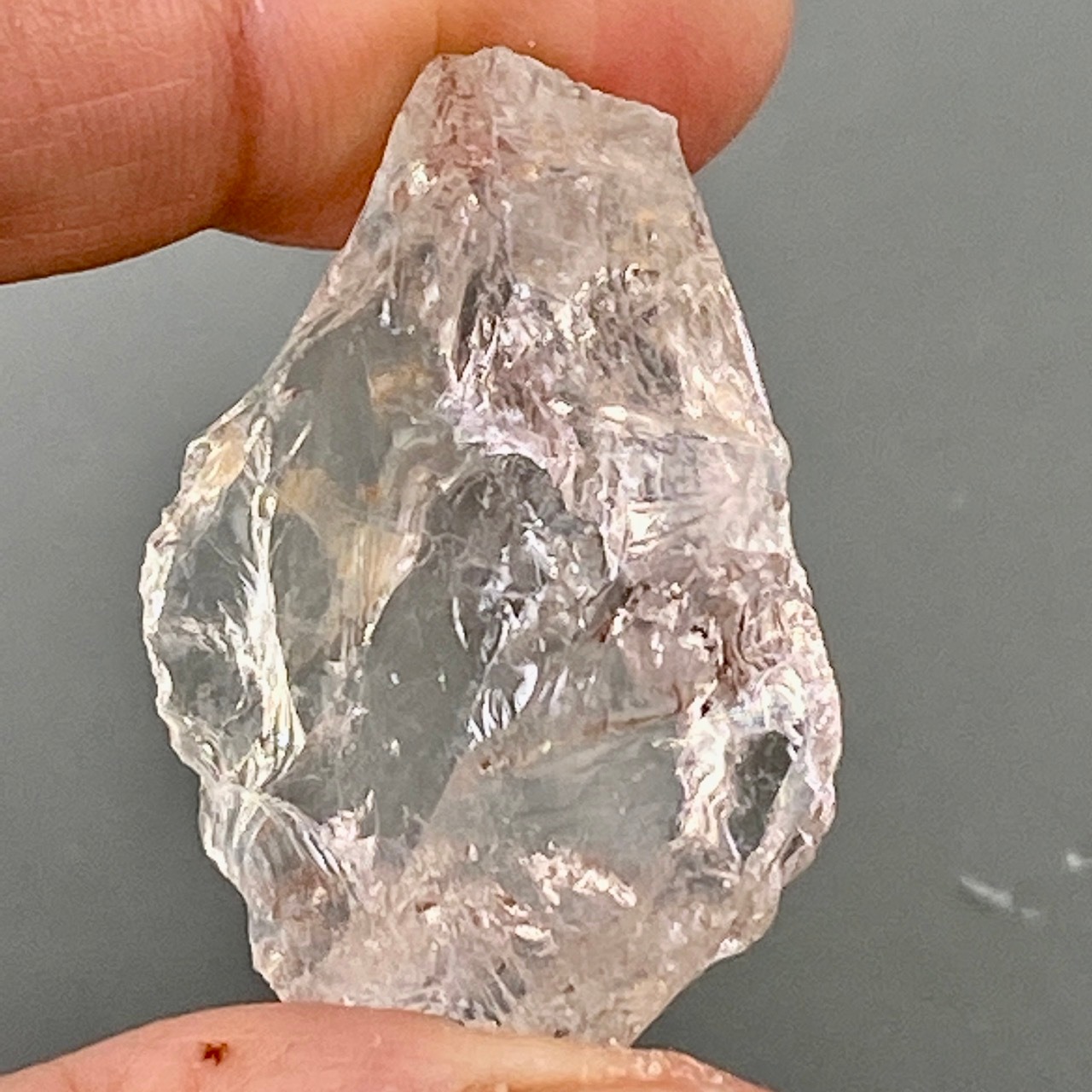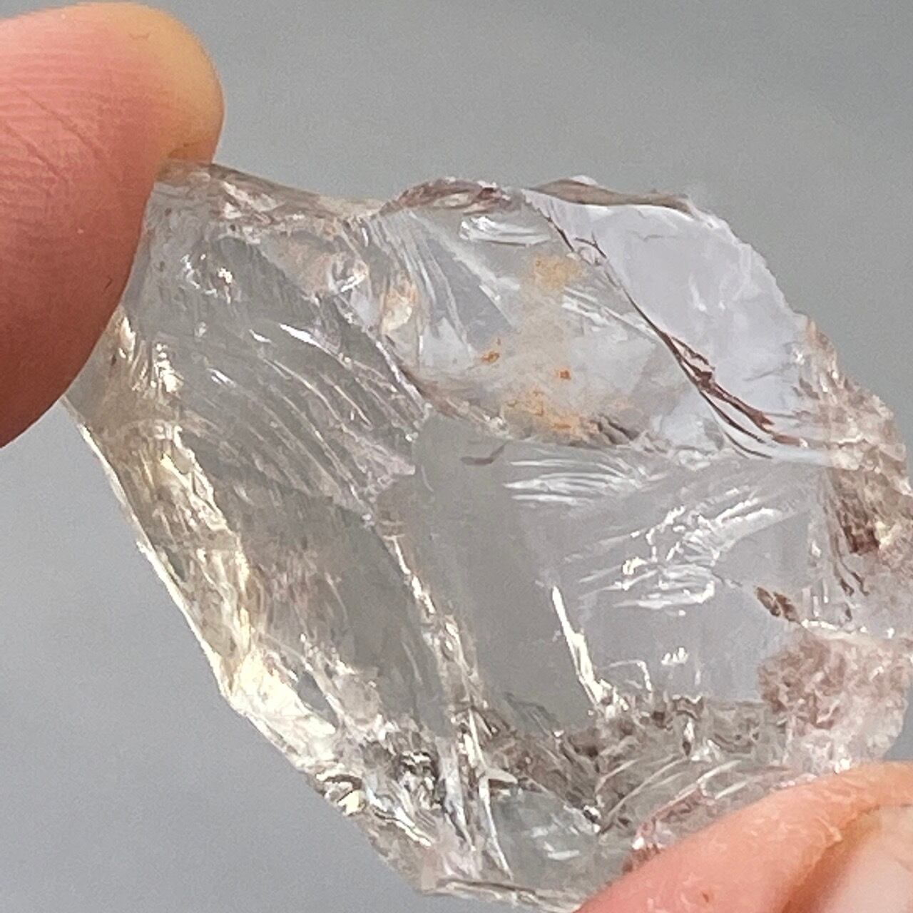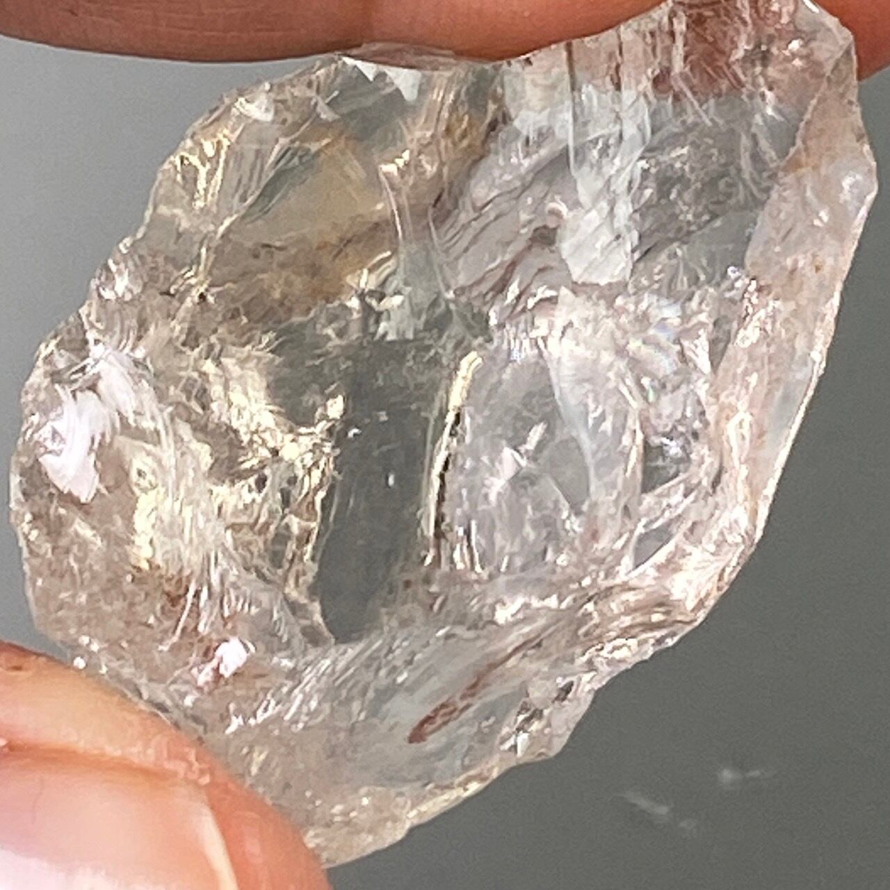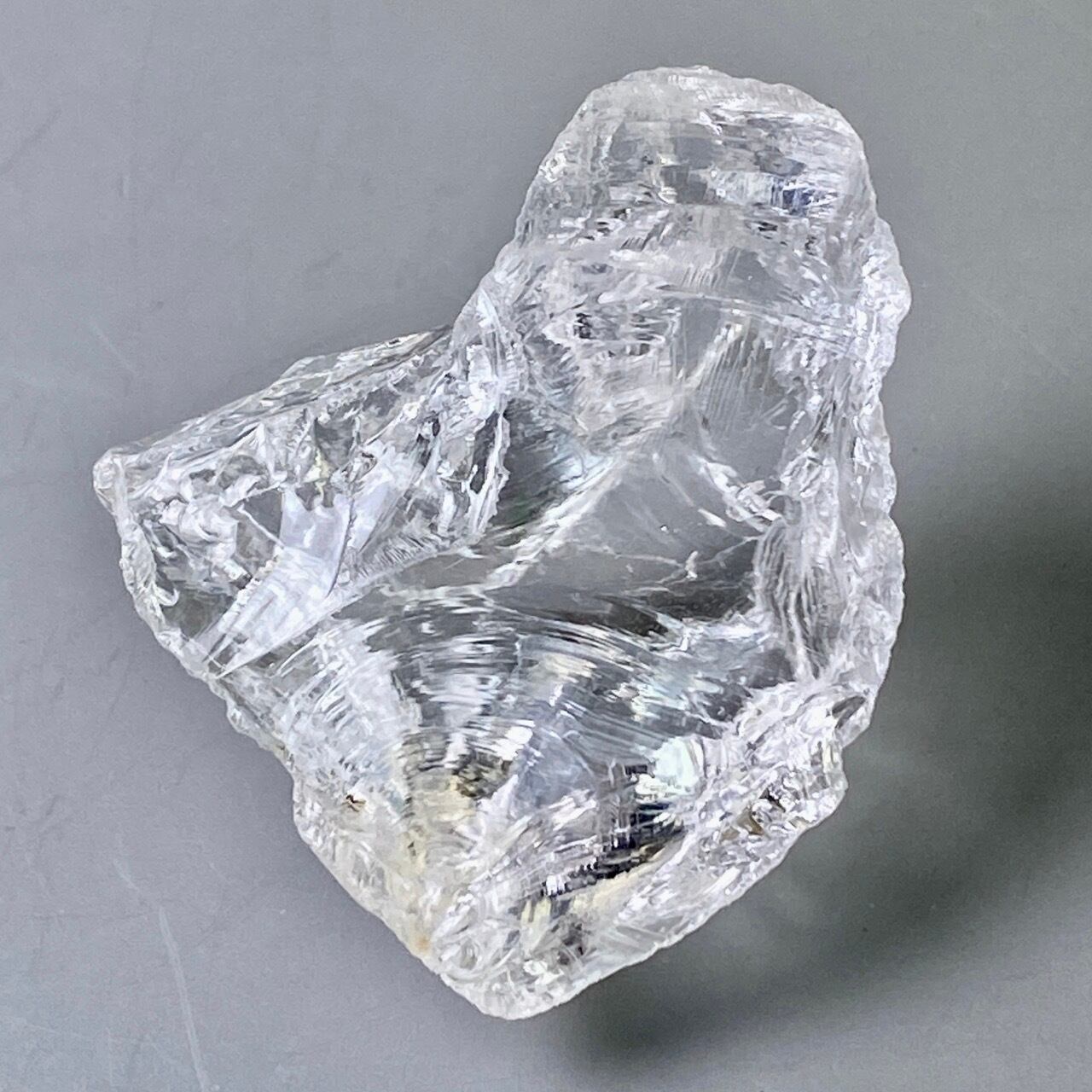 ブラジル産の透明感のある水晶に煌めく虹(画像では控えめに写っています)。ラフカットの良さは、表面にできるうねりのような流線形が水晶にダイナミックさおよびナチュラル感を与えているところです。氷を割った様な涼しげな見た目が水晶の魅力を引き出しています。