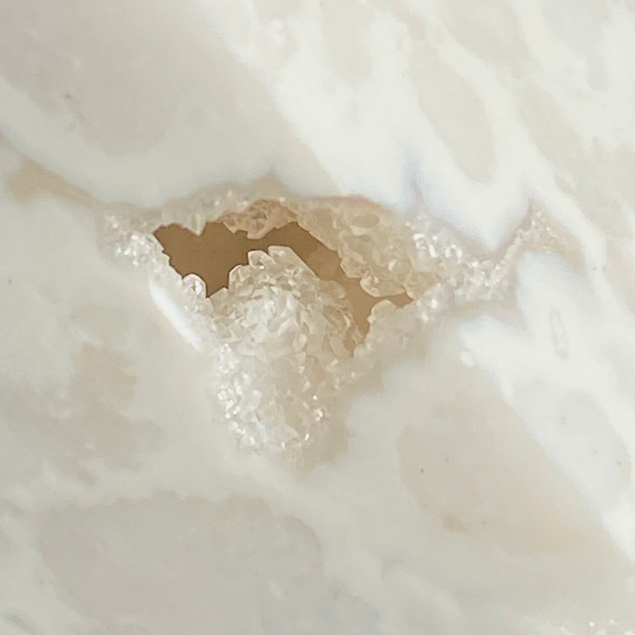 大きなキャビティーからキラキラの光沢を放つ砂糖菓子の様なドゥルージーがに覗く非常に魅力的な子です。所々ドゥルージーが見られ、ゴージャスなタワーで店主のお勧め品です。