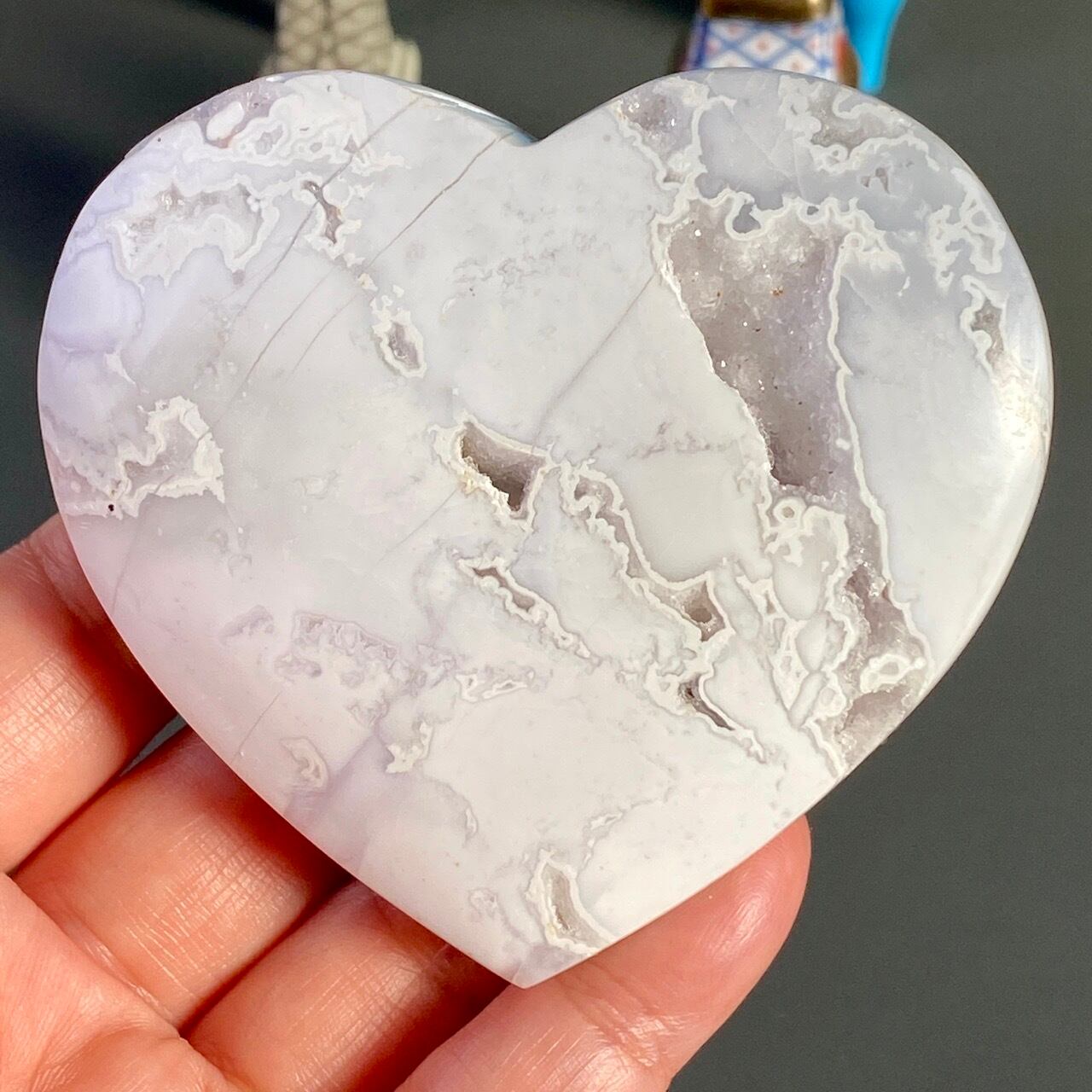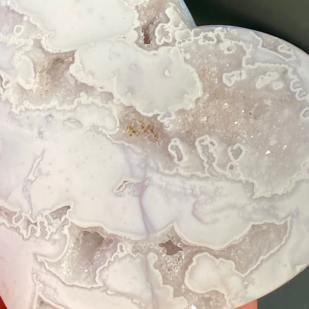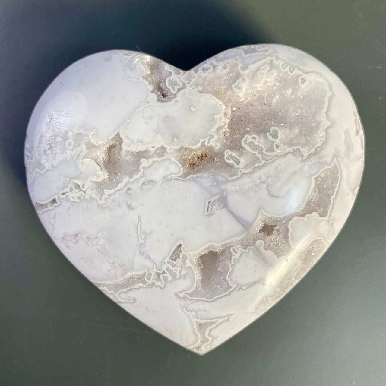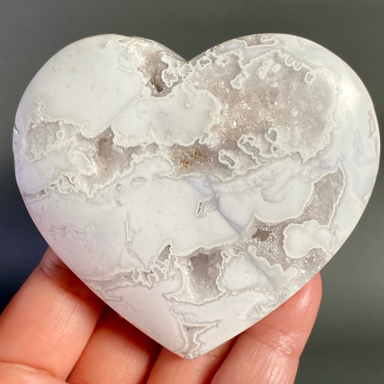 白い石のキャビティから覗く、キラキラの光沢を放つ、砂糖菓子の様な白いドゥルージーが非常に美しく魅力的なハートです。非常に美しく、店主お勧めの子です。