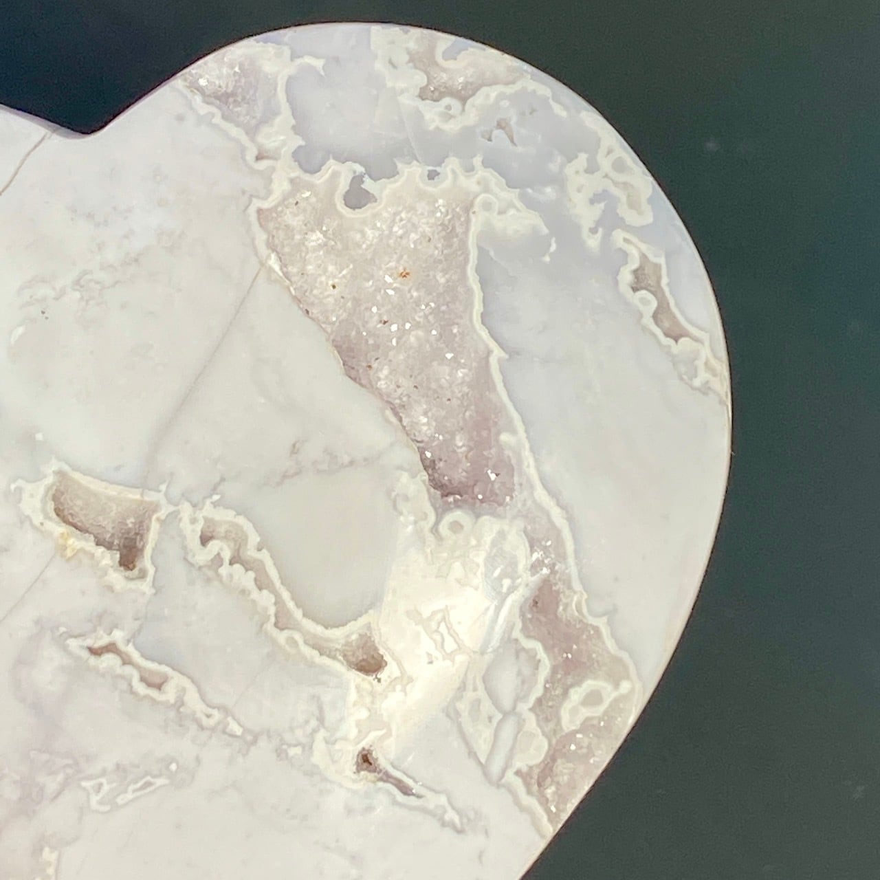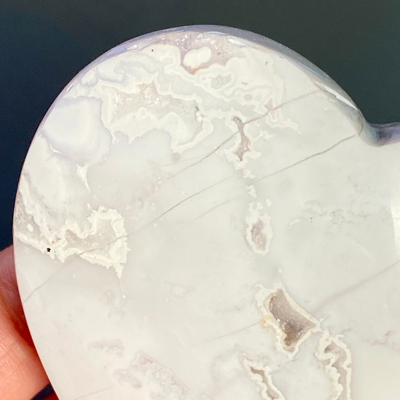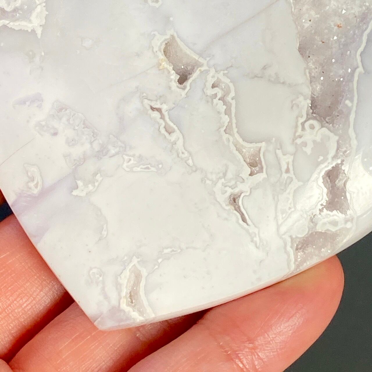 白い石のキャビティから覗く、キラキラの光沢を放つ、砂糖菓子の様な白いドゥルージーが非常に美しく魅力的なハートです。非常に美しく、店主お勧めの子です。
