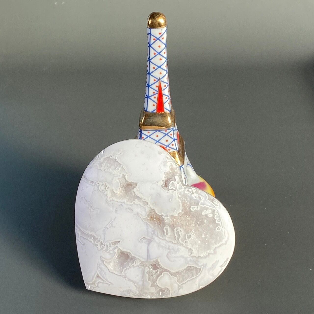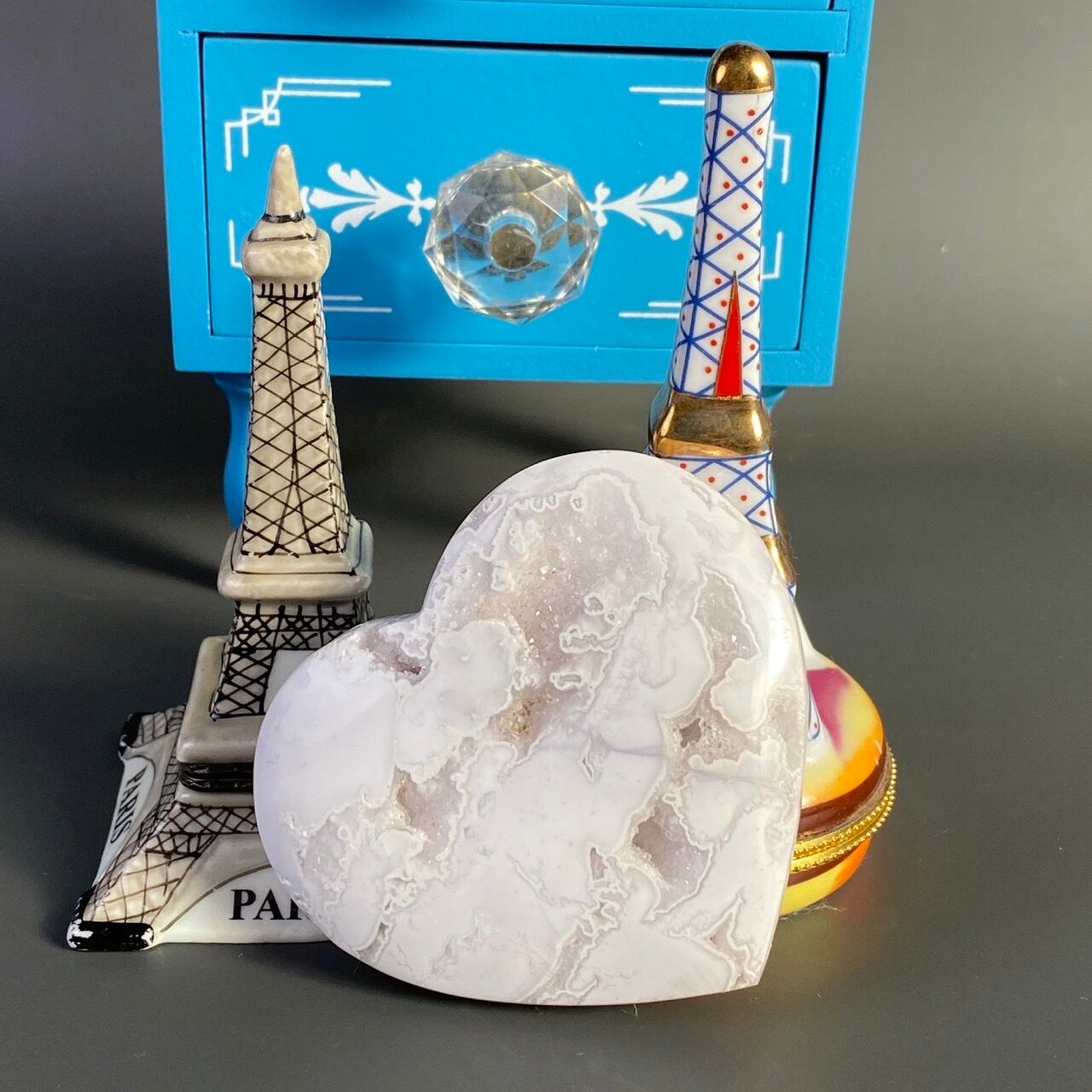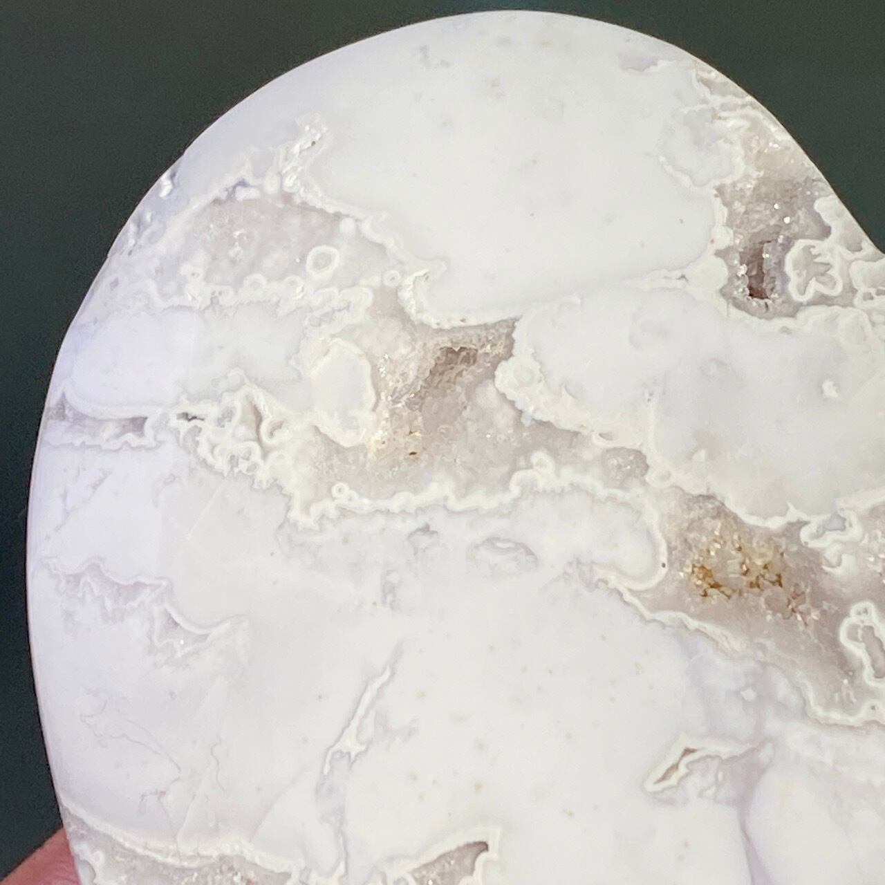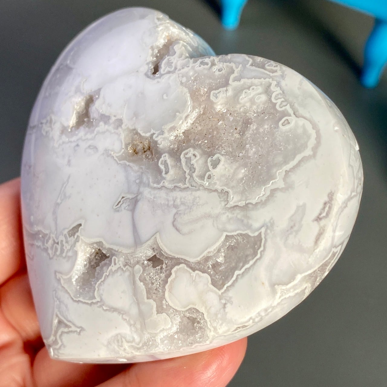 白い石のキャビティから覗く、キラキラの光沢を放つ、砂糖菓子の様な白いドゥルージーが非常に美しく魅力的なハートです。非常に美しく、店主お勧めの子です。