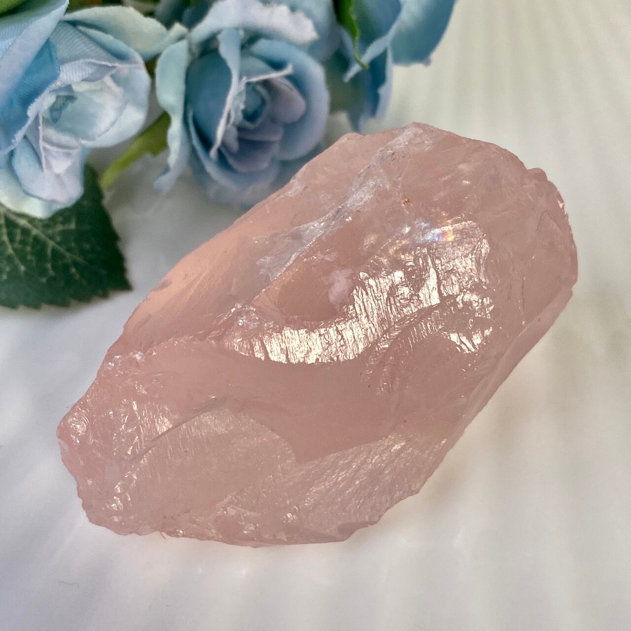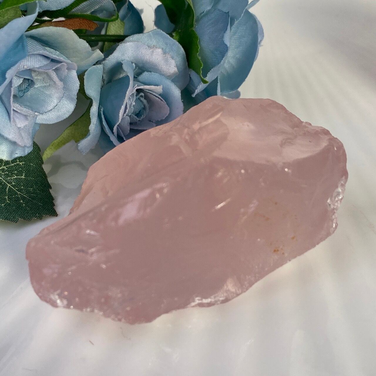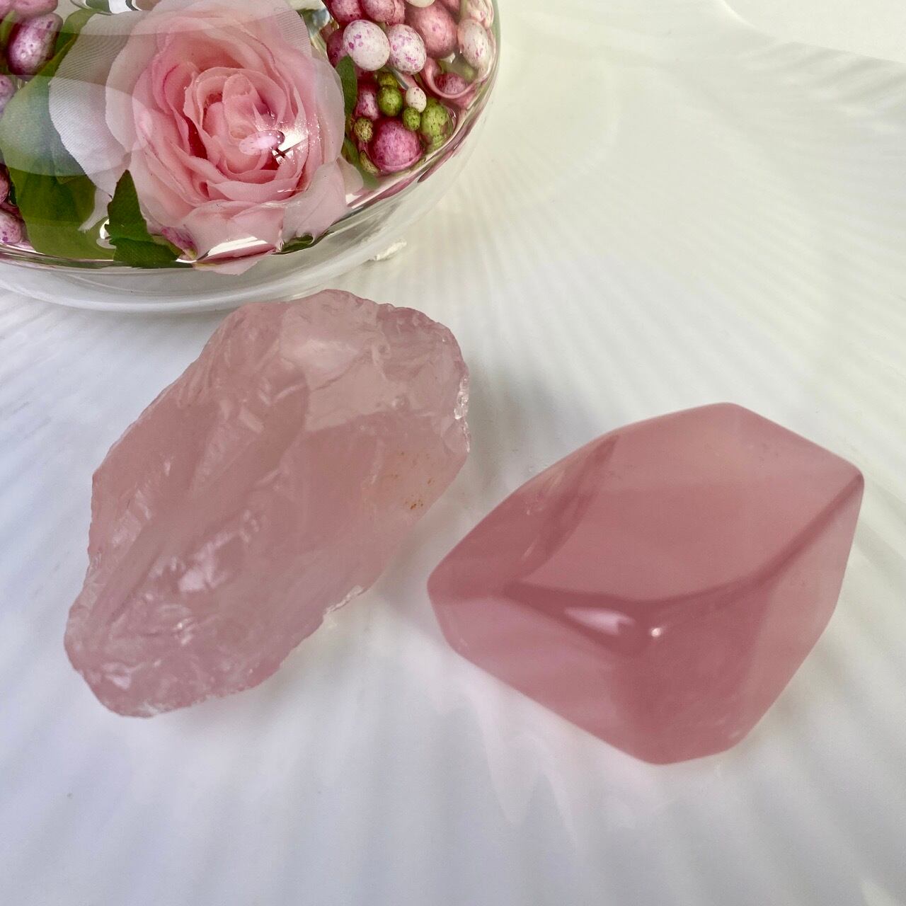 マダガスカル産のローズクォーツのフリーフォーム1個とモザンビーク産ラフカット(かち割り)1個のセットになります。フリーカットはハイクオリティのローズ色の濃い可憐な子で、一方ラフカットの方はミルキーな癒し系の子になります。