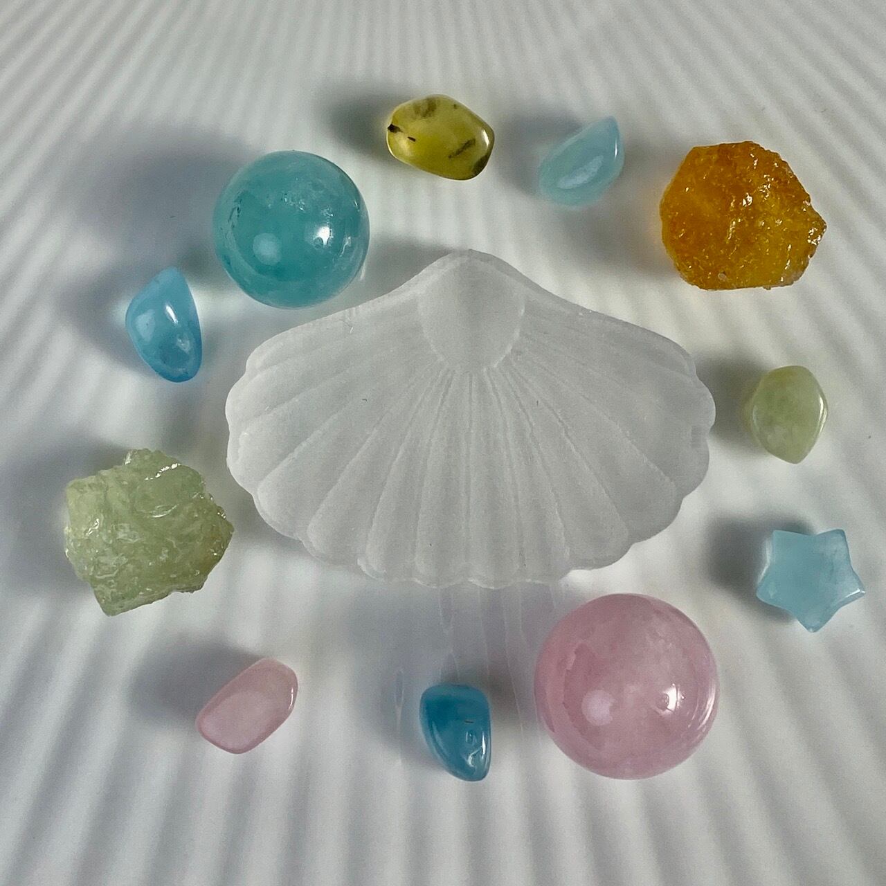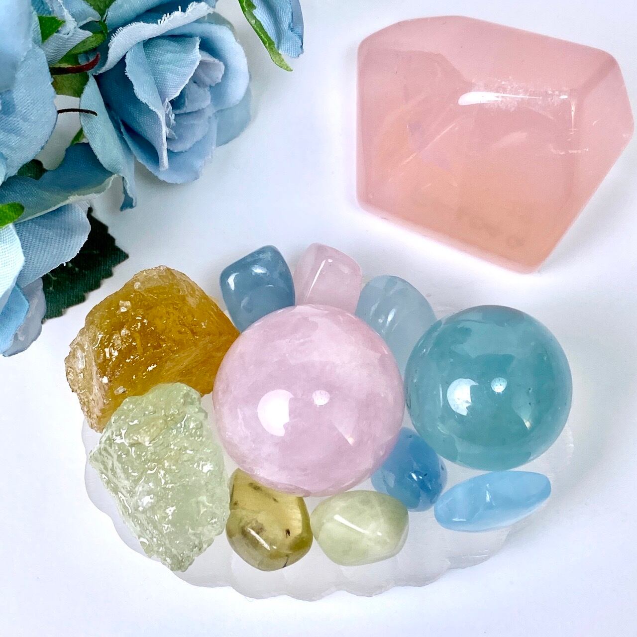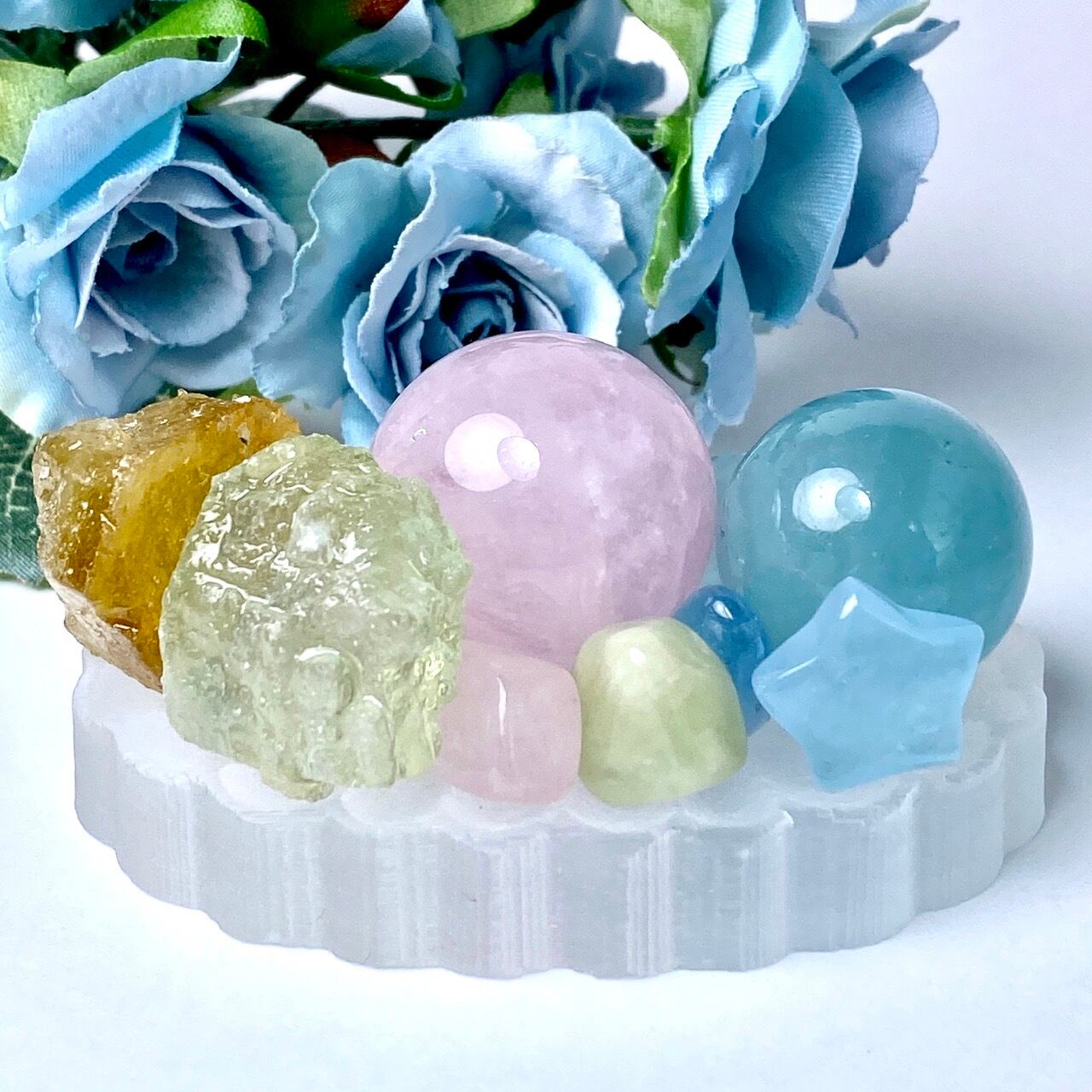今回、色々な形状から成る、色とりどりの宝石のようなセットをご準備しました。画像に掲載されたアソートのベリルをセレナイトのシェルプレートともにお届けします。どのセットも違って可愛く、乙女心に拍車をかける様なドリーミーな子達です。