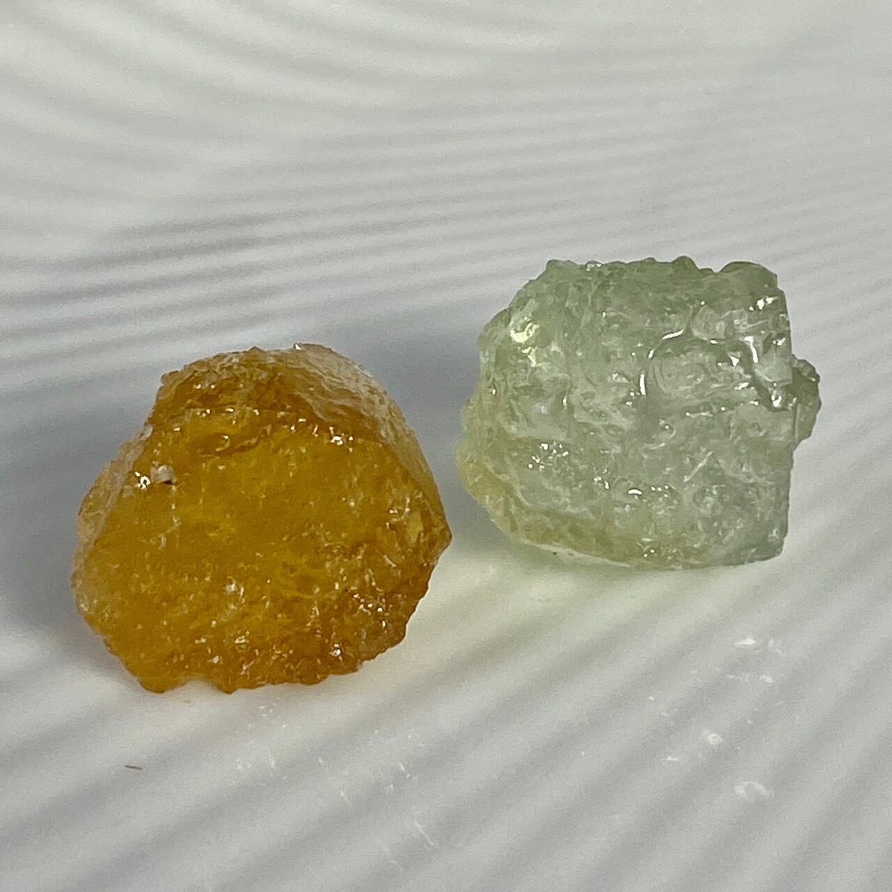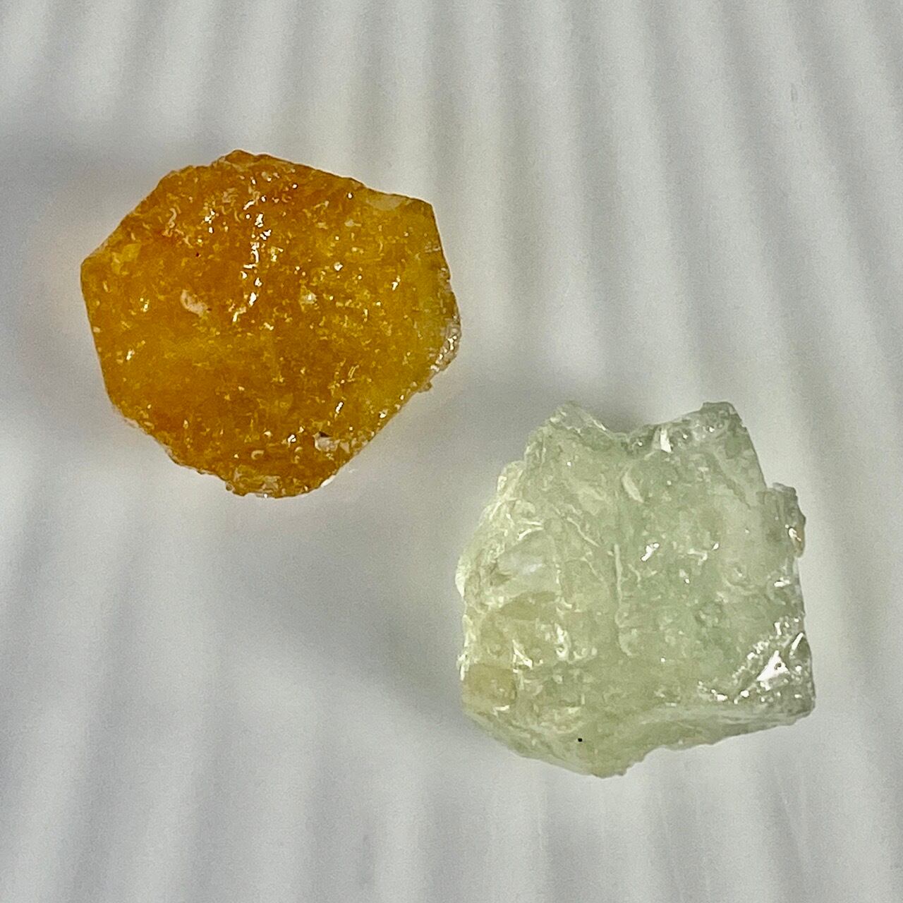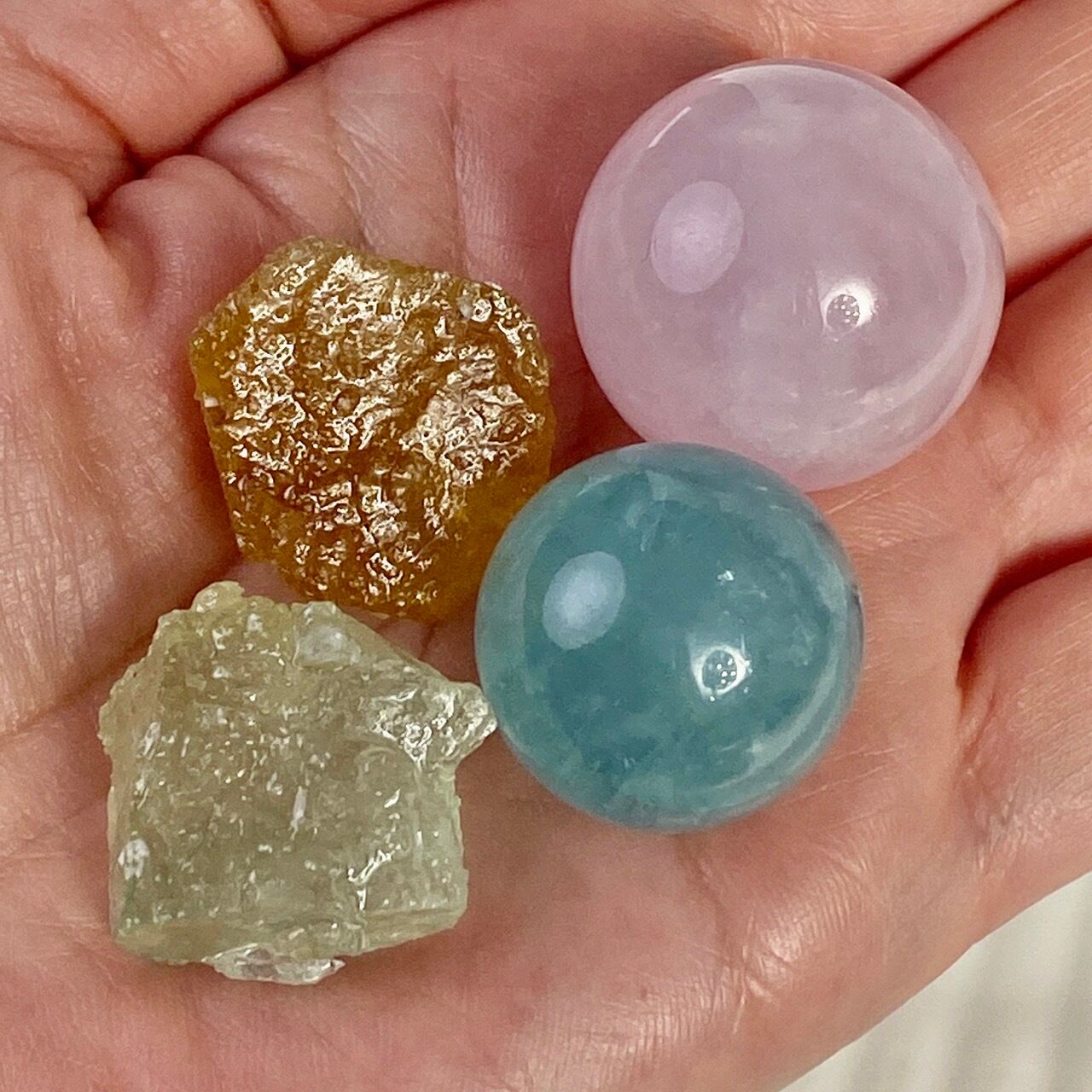 今回、色々な形状から成る、色とりどりの宝石のようなセットをご準備しました。画像に掲載されたアソートのベリルをセレナイトのシェルプレートともにお届けします。どのセットも違って可愛く、乙女心に拍車をかける様なドリーミーな子達です。