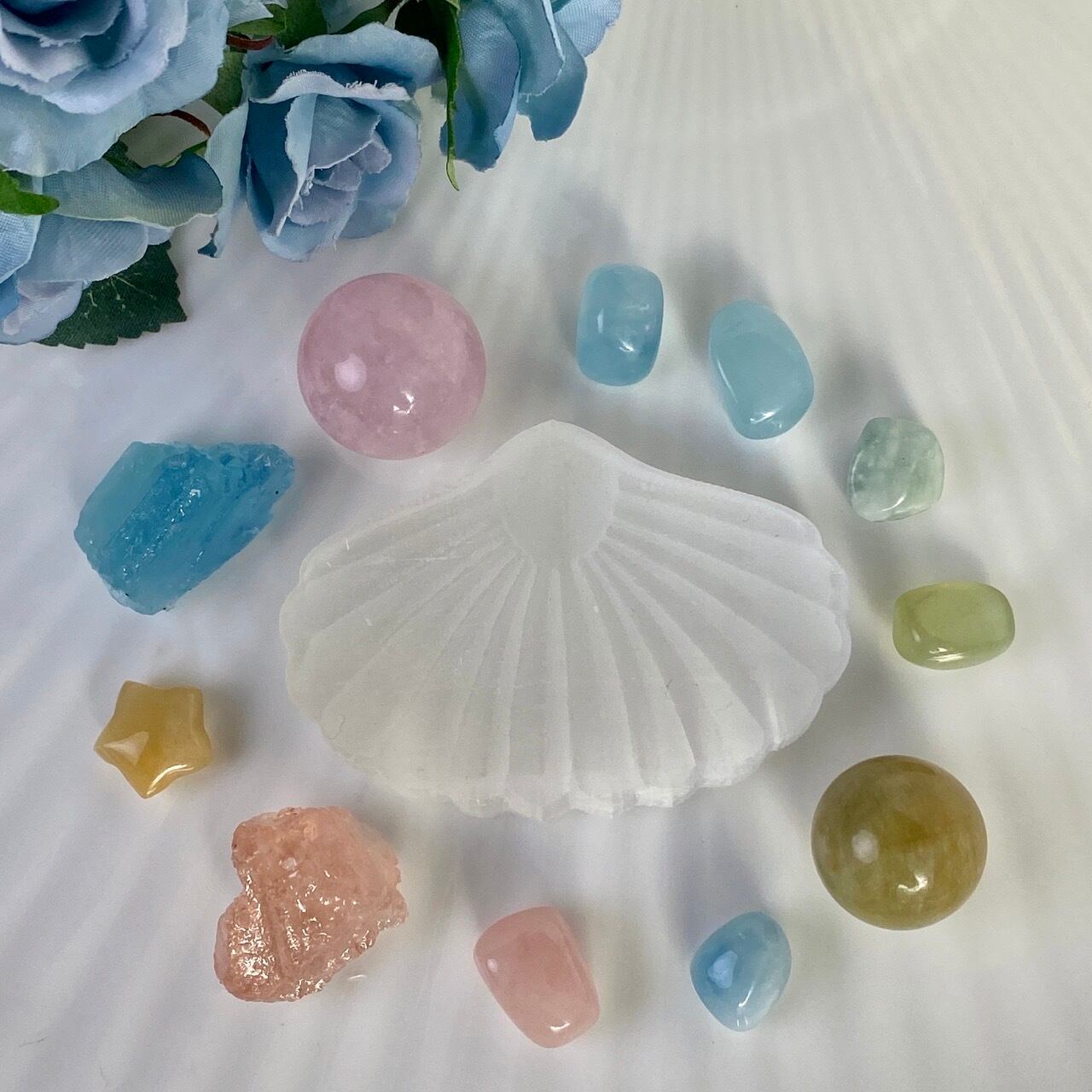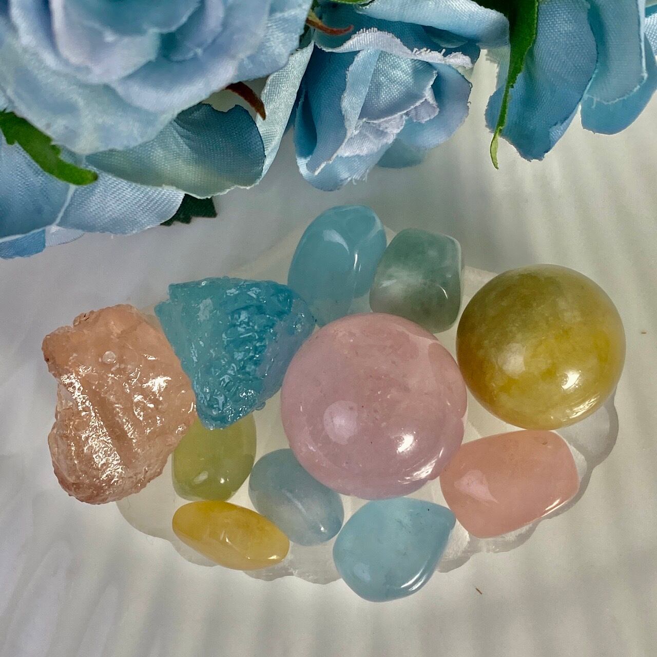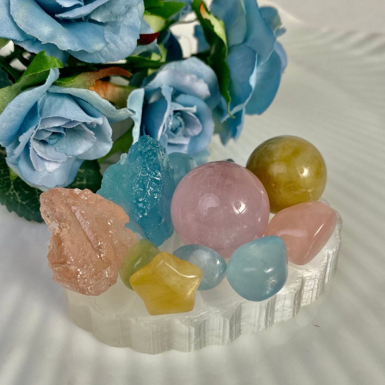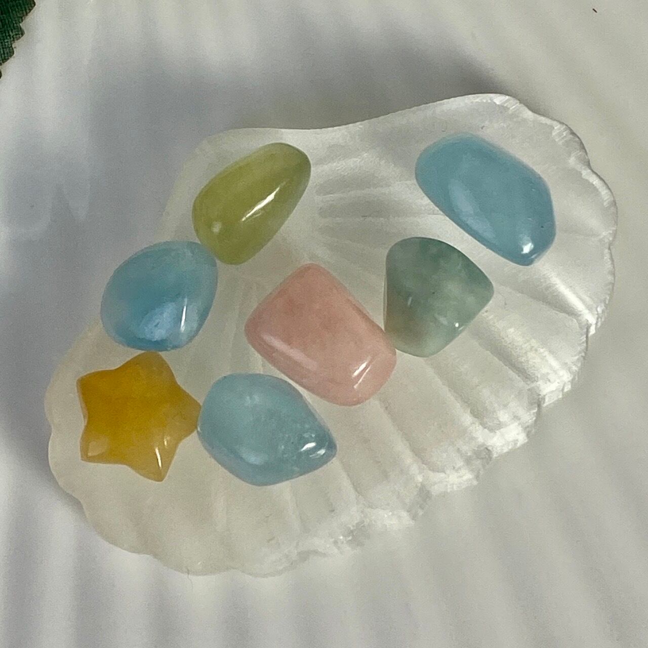 今回、色々な形状から成る、色とりどりの宝石のようなベリルセットをご準備しました。画像に掲載されたアソートのベリルをセレナイトのシェルプレートともにお届けします。どのセットも違って可愛く、乙女心に拍車をかける様なドリーミーな子達です。
