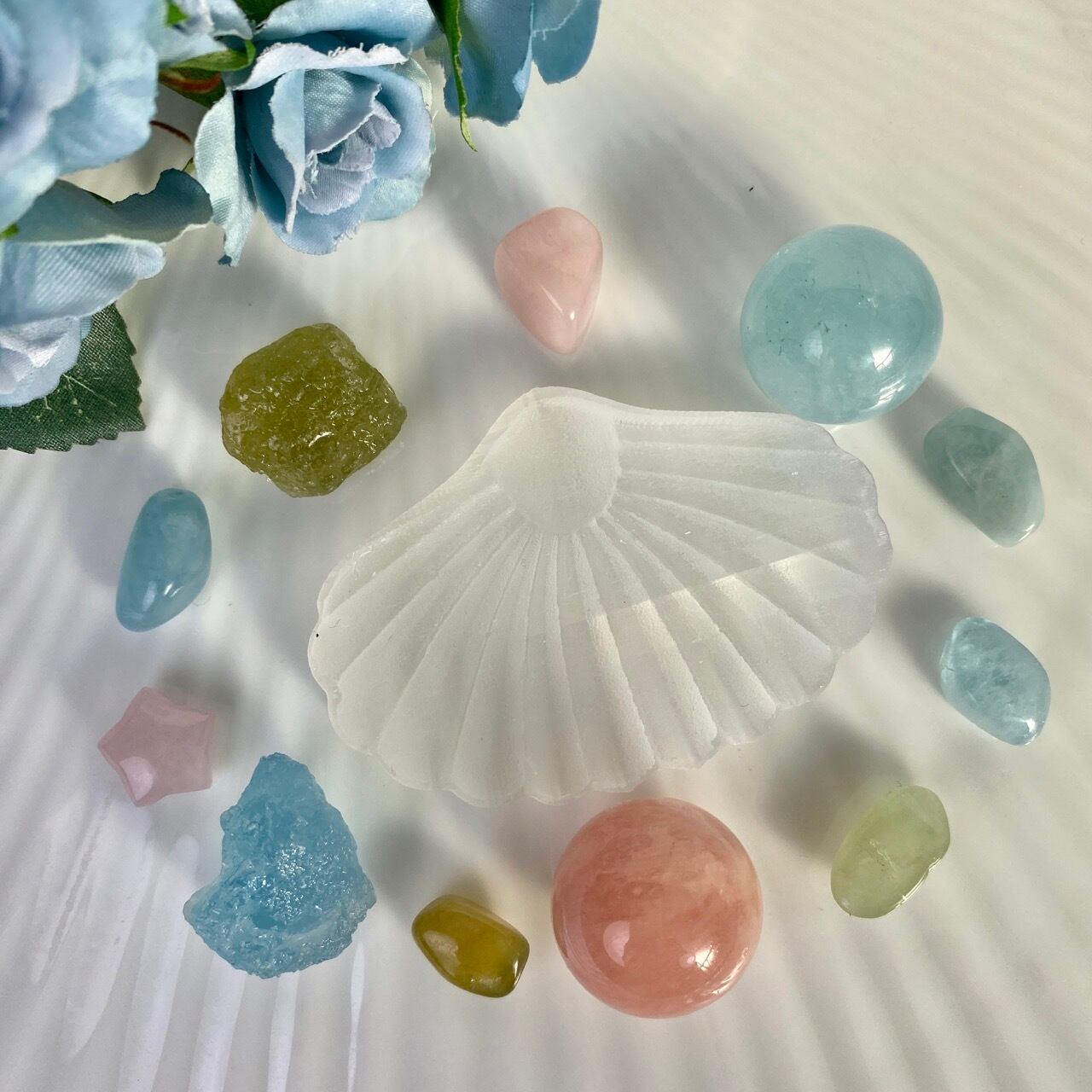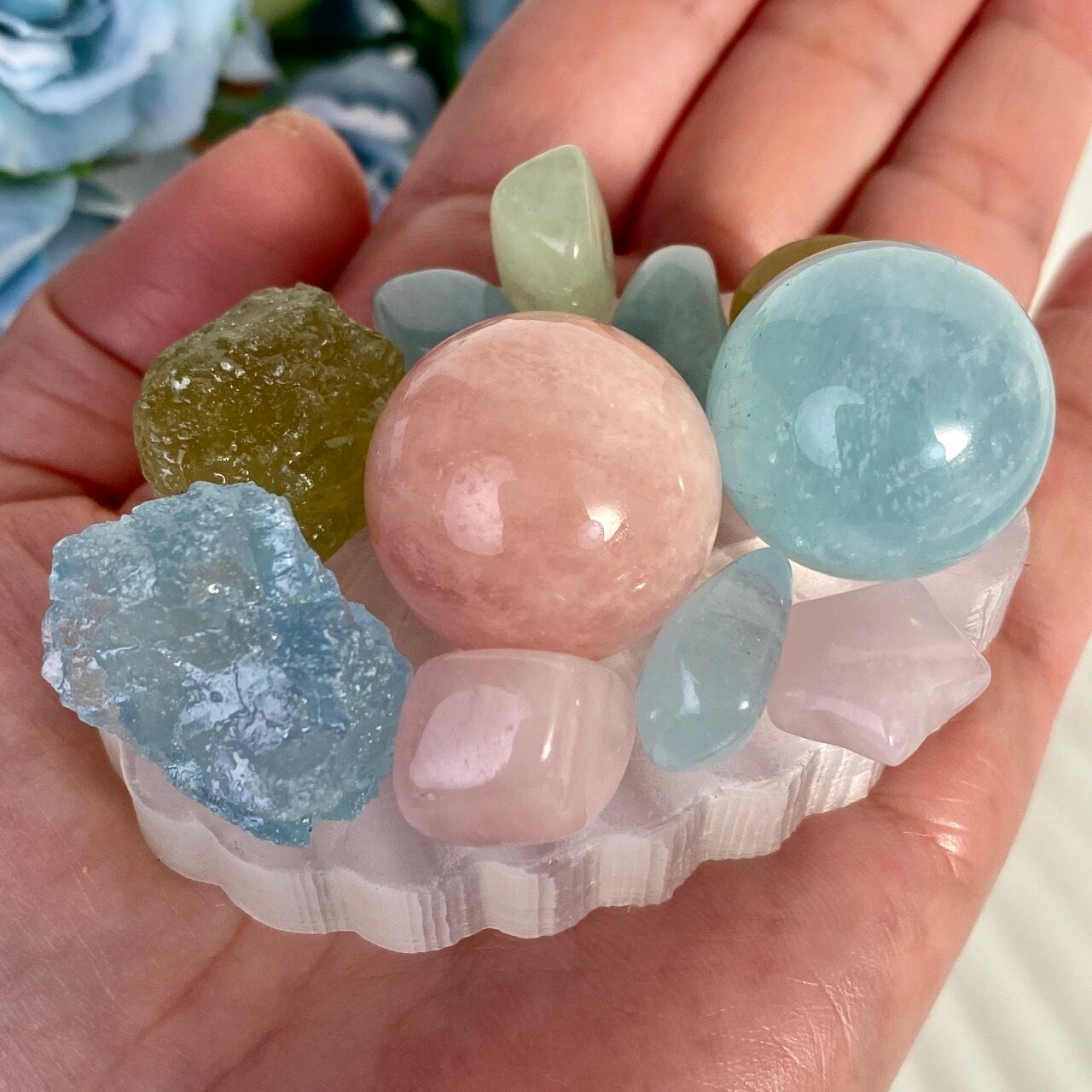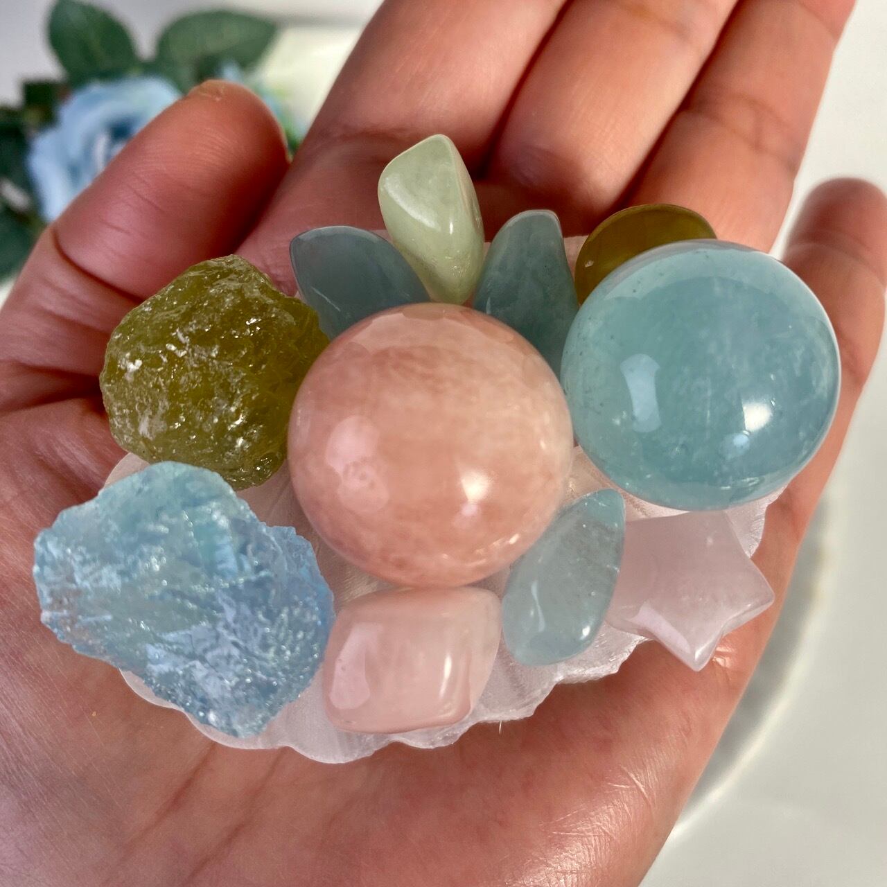 今回、色々な形状から成る、色とりどりの宝石のようなセットをご準備しました。画像に掲載されたアソートのベリルをセレナイトのシェルプレートともにお届けします。どのセットも違って可愛く、乙女心に拍車をかける様なドリーミーな子達です。
