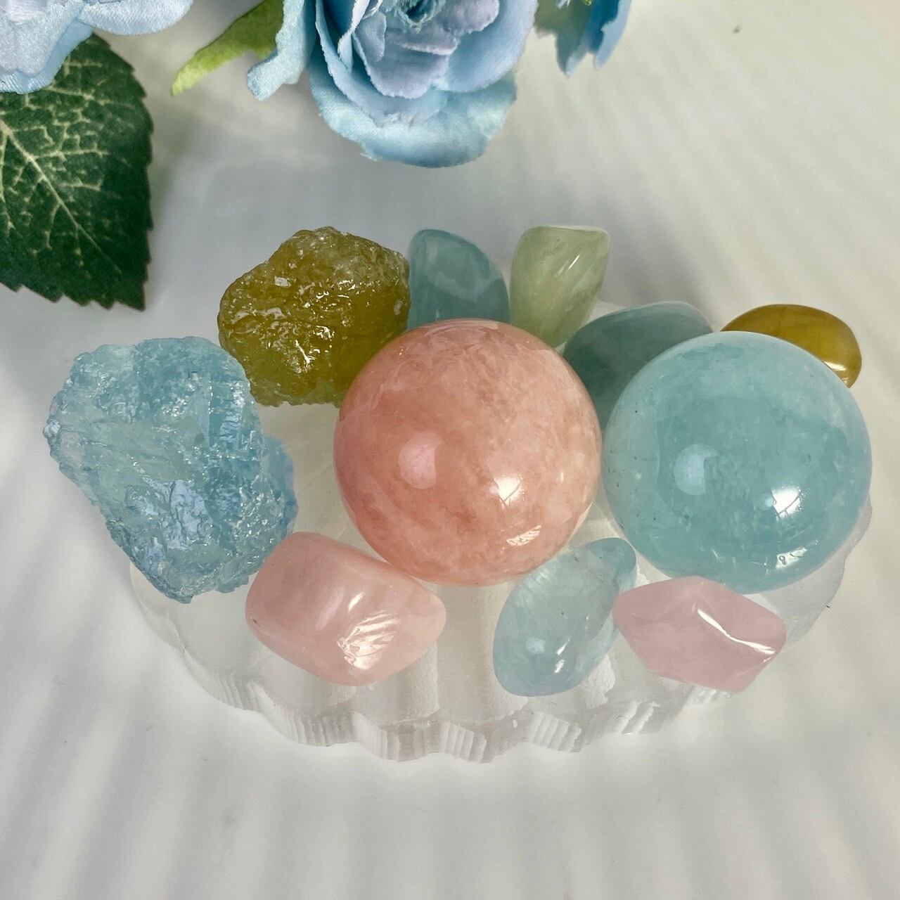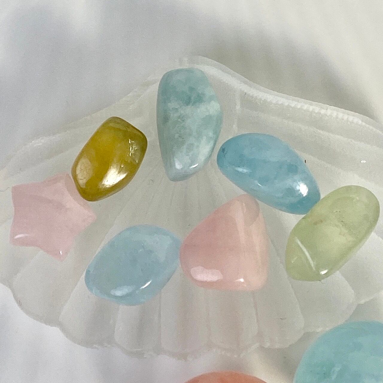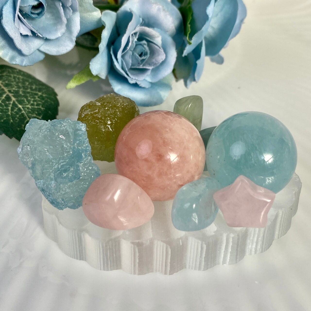 今回、色々な形状から成る、色とりどりの宝石のようなセットをご準備しました。画像に掲載されたアソートのベリルをセレナイトのシェルプレートともにお届けします。どのセットも違って可愛く、乙女心に拍車をかける様なドリーミーな子達です。