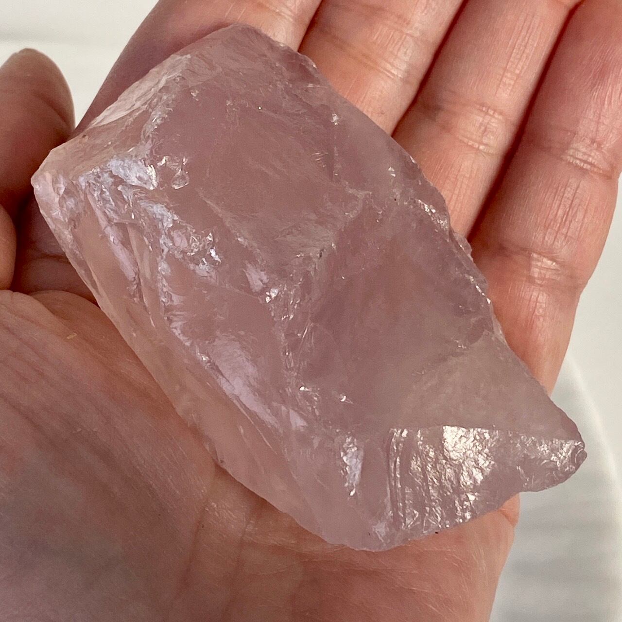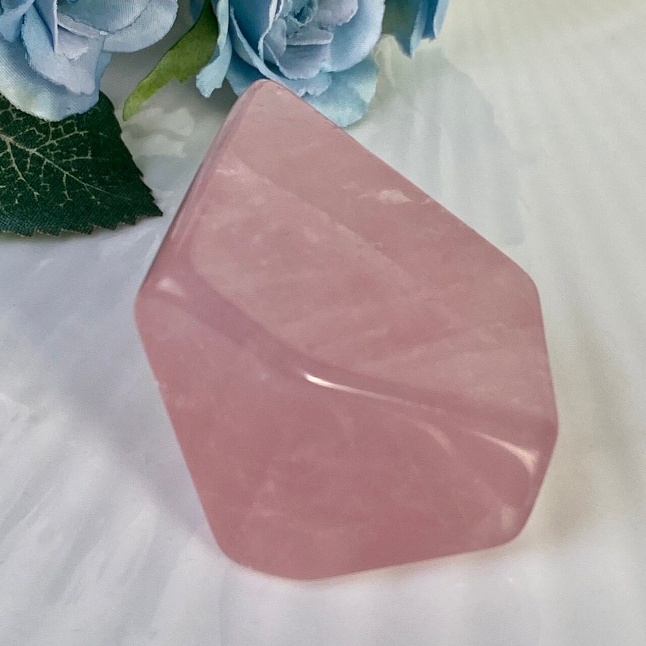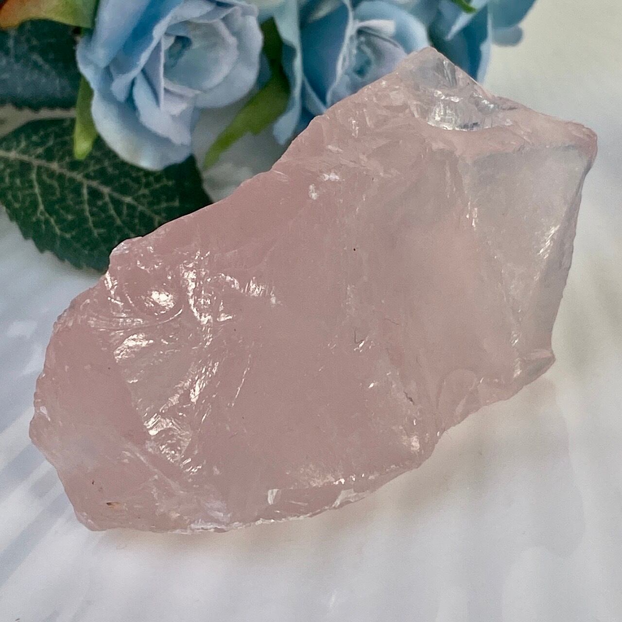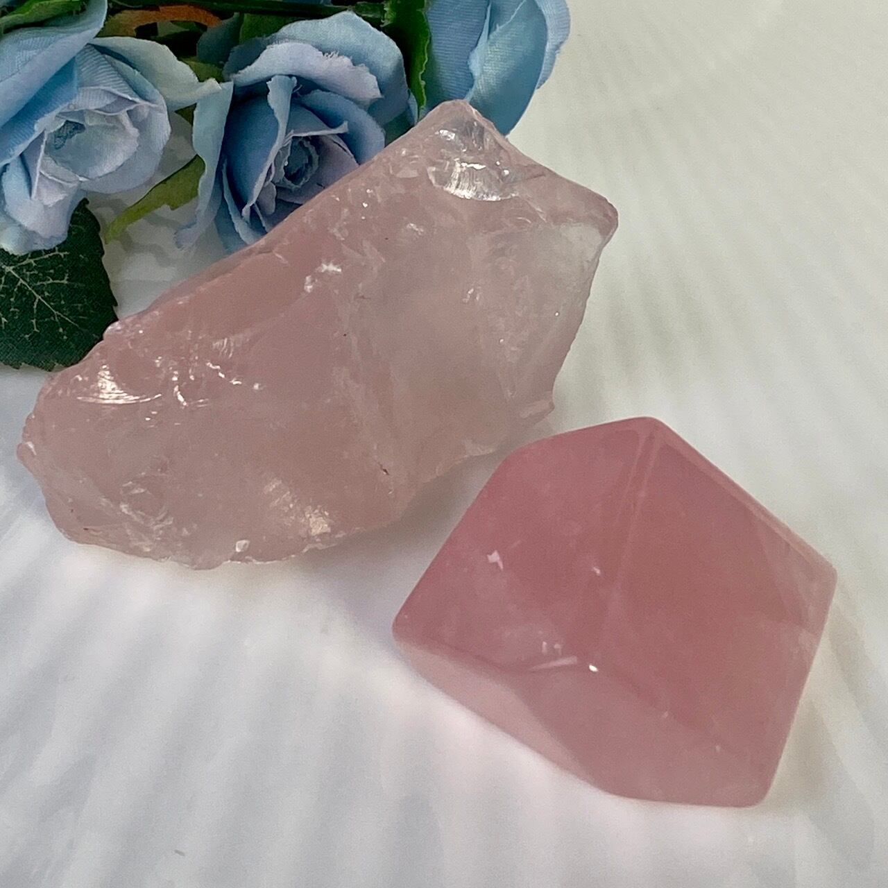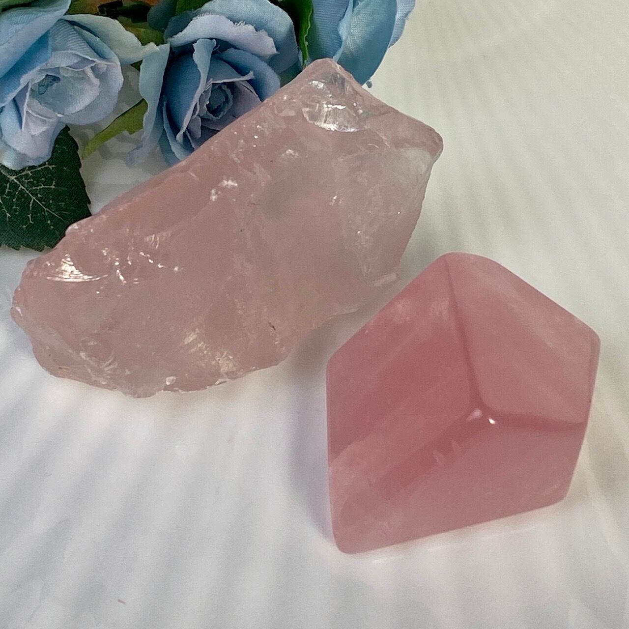 マダガスカル産のローズクォーツのフリーフォーム1個とモザンビーク産ラフカット(かち割り)1個のセットになります。フリーカットはハイクオリティのローズ色の濃い可憐な子で、一方ラフカットの方はミルキーな癒し系の子になります。
