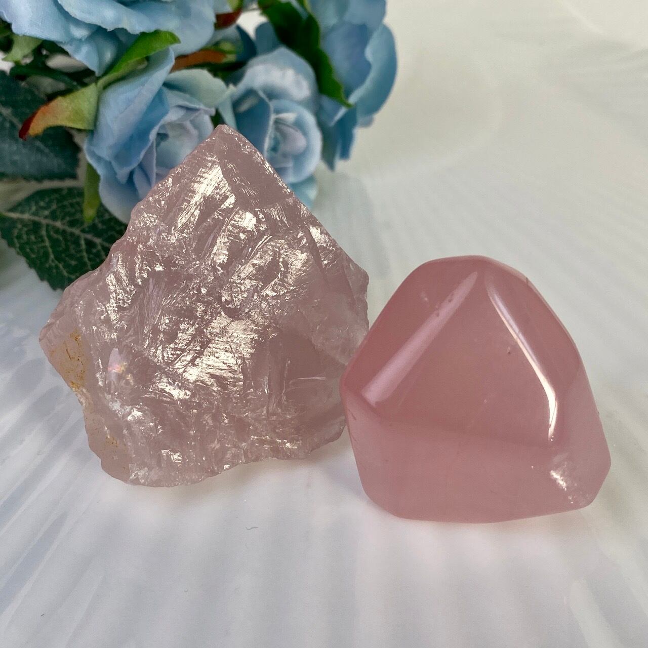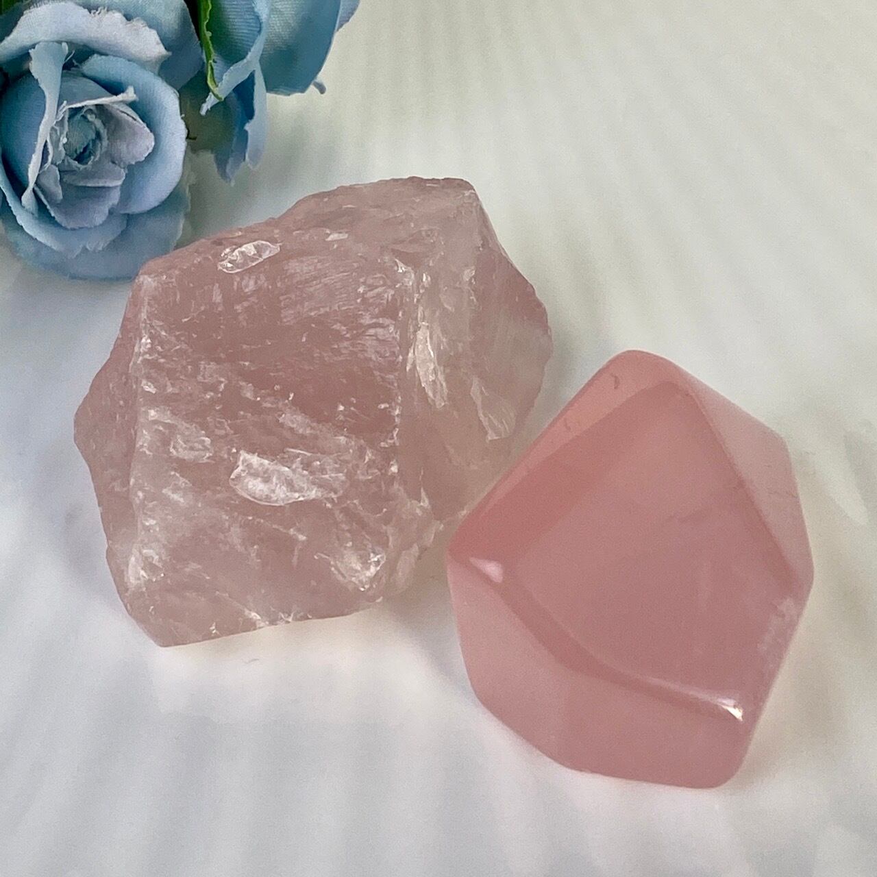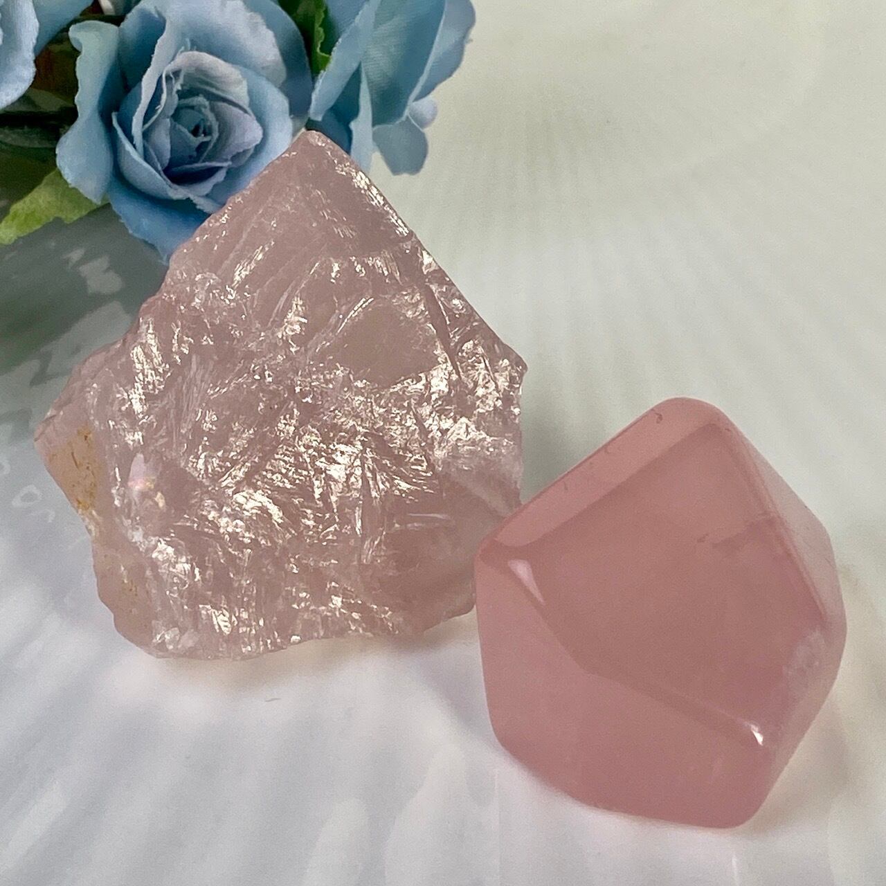 マダガスカル産のローズクォーツのフリーフォーム1個とモザンビーク産ラフカット(かち割り)1個のセットになります。フリーカットはハイクオリティのローズ色の濃い可憐な子で、一方ラフカットの方はミルキーな癒し系の子になります。