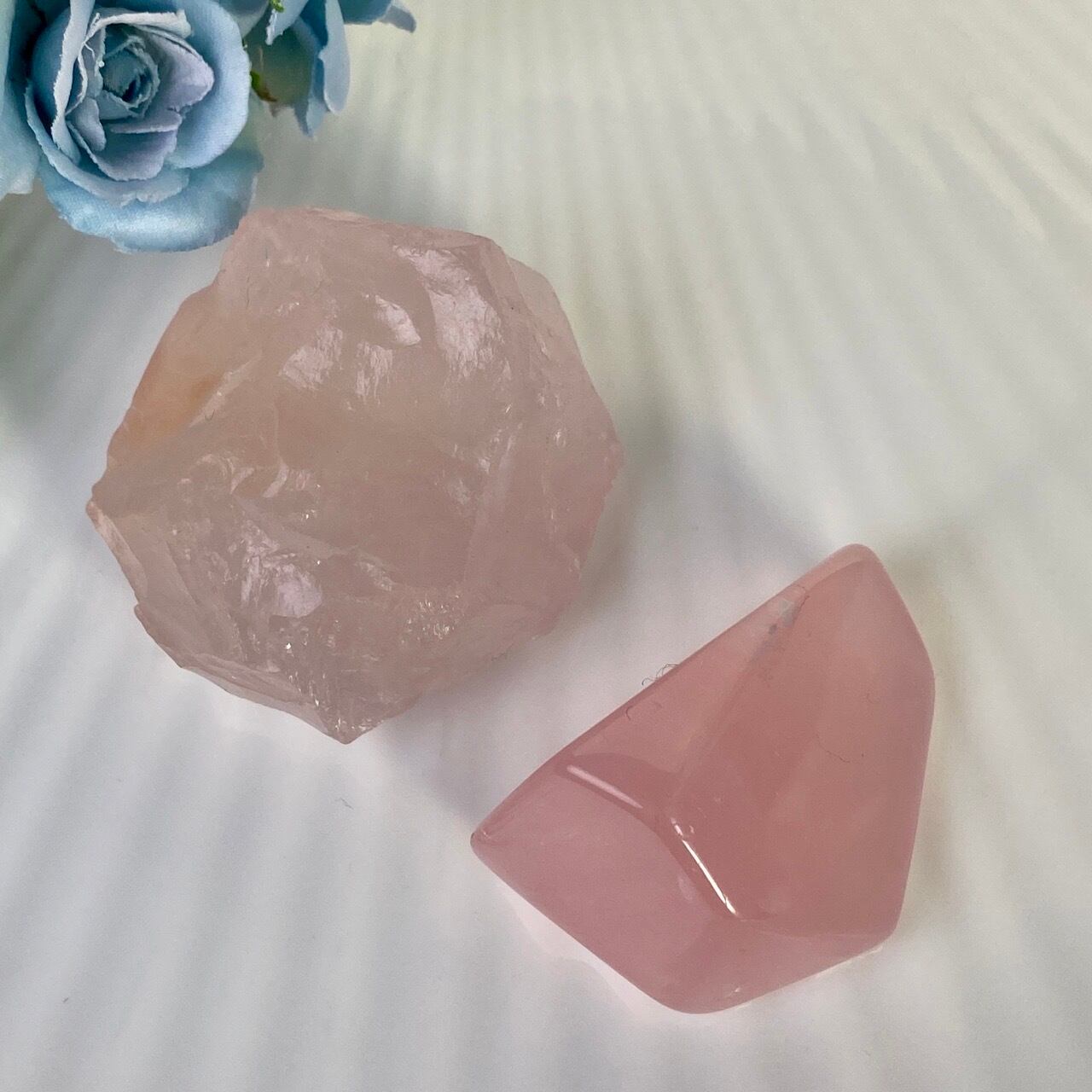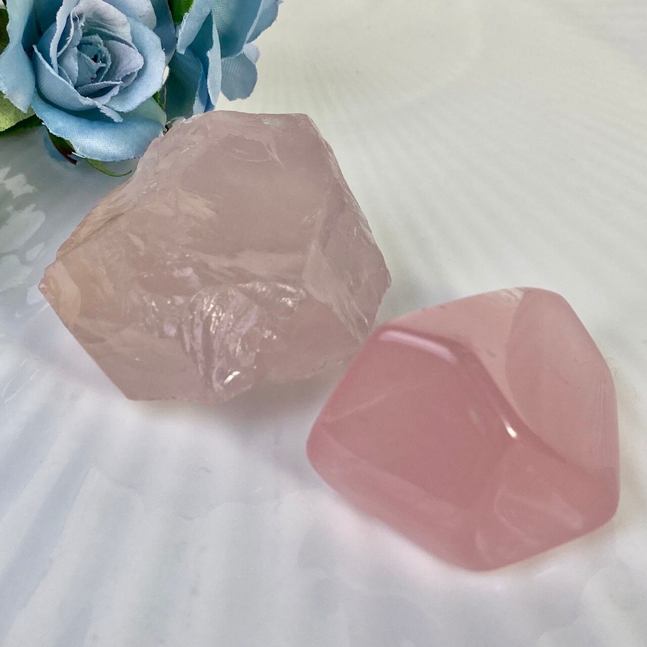 マダガスカル産のローズクォーツのフリーフォーム1個とモザンビーク産ラフカット(かち割り)1個のセットになります。フリーカットはハイクオリティのローズ色の濃い可憐な子で、一方ラフカットの方はミルキーな癒し系の子になります。