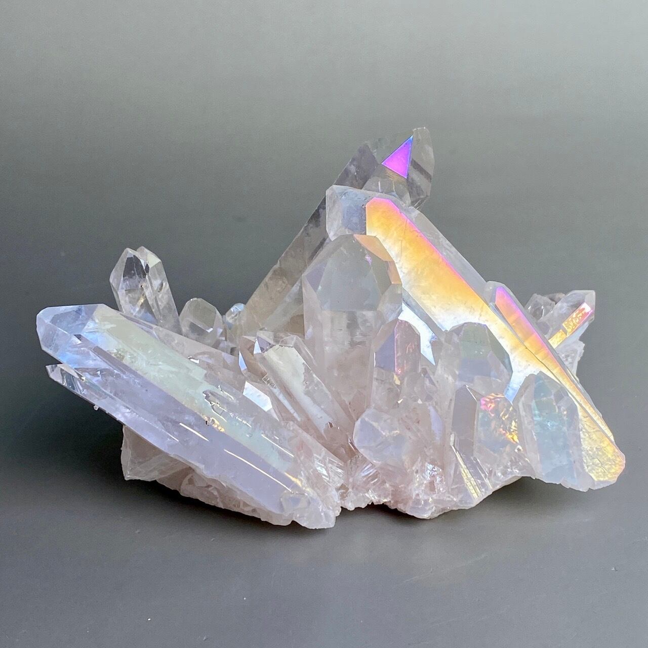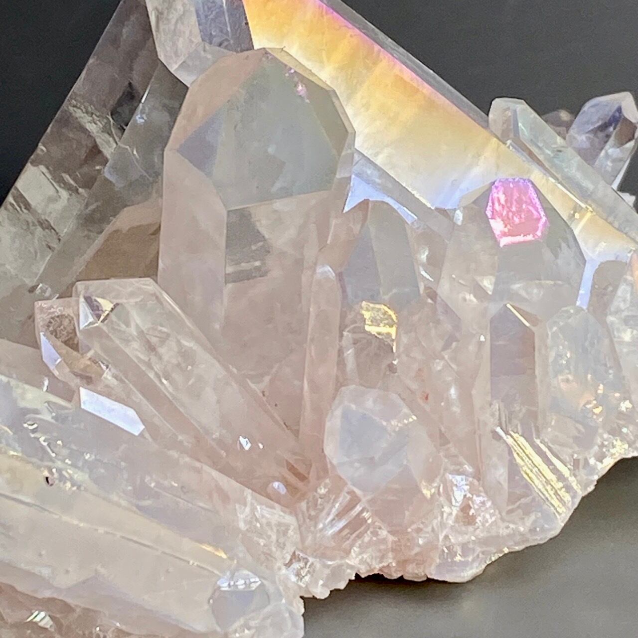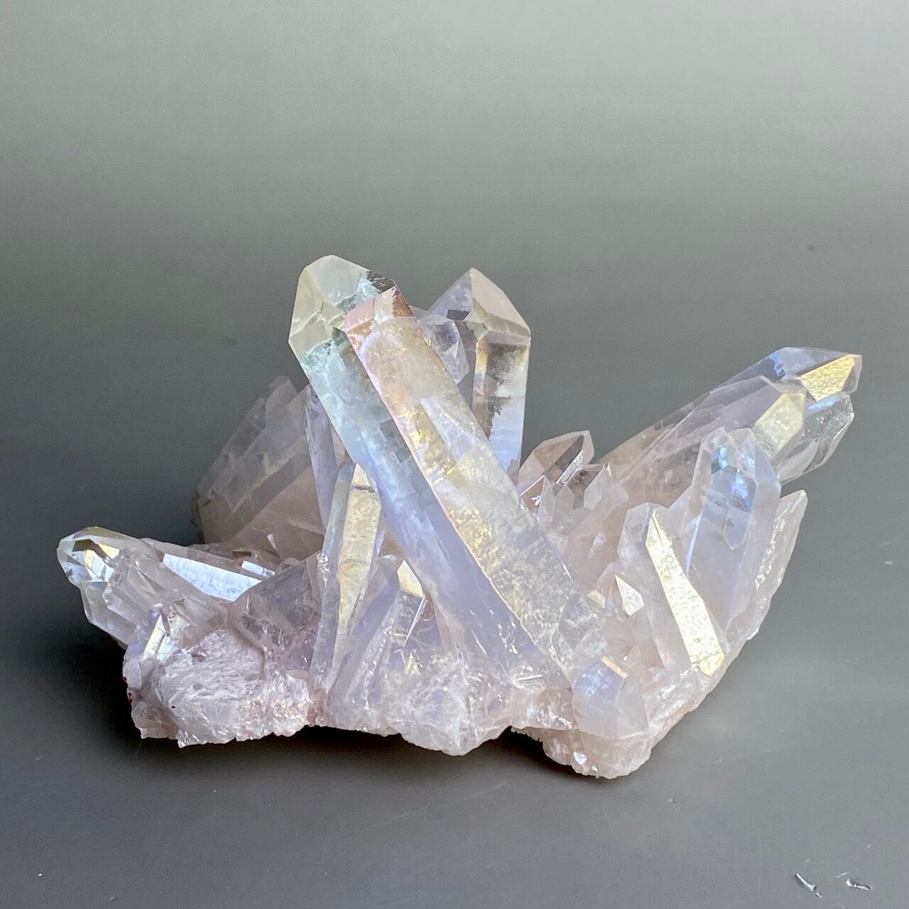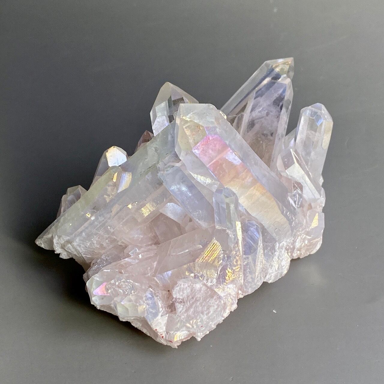 オーラ加工がどぎつくなく控えめなため、見る角度によって部分的にピンクやイエロー、そしてブルーに優しく煌めく子です。ポイントがお互いを支え合っているようなフォーメーションで、人間の縮図の様な感じです。