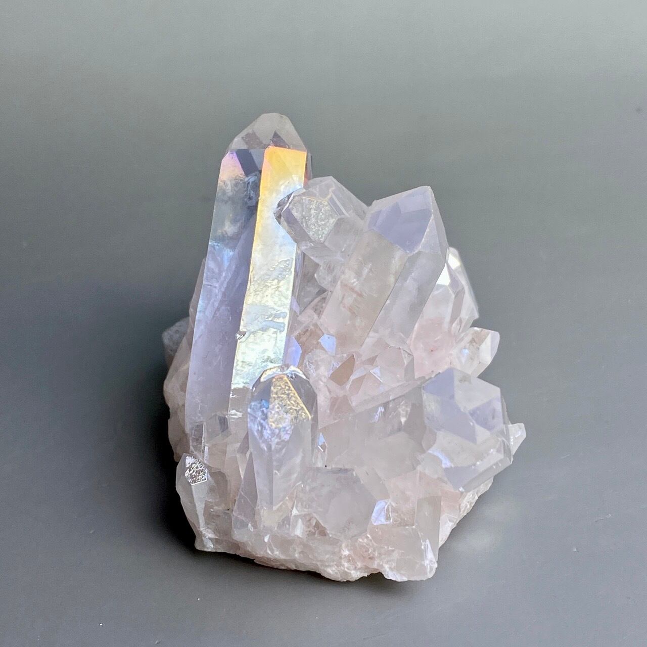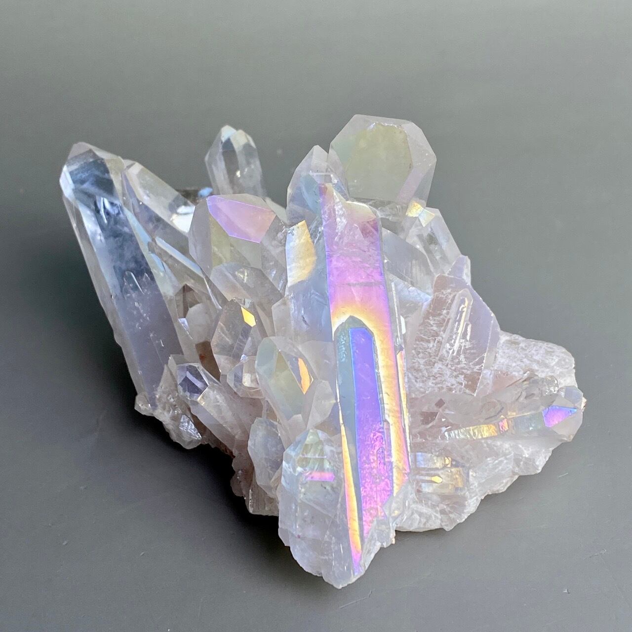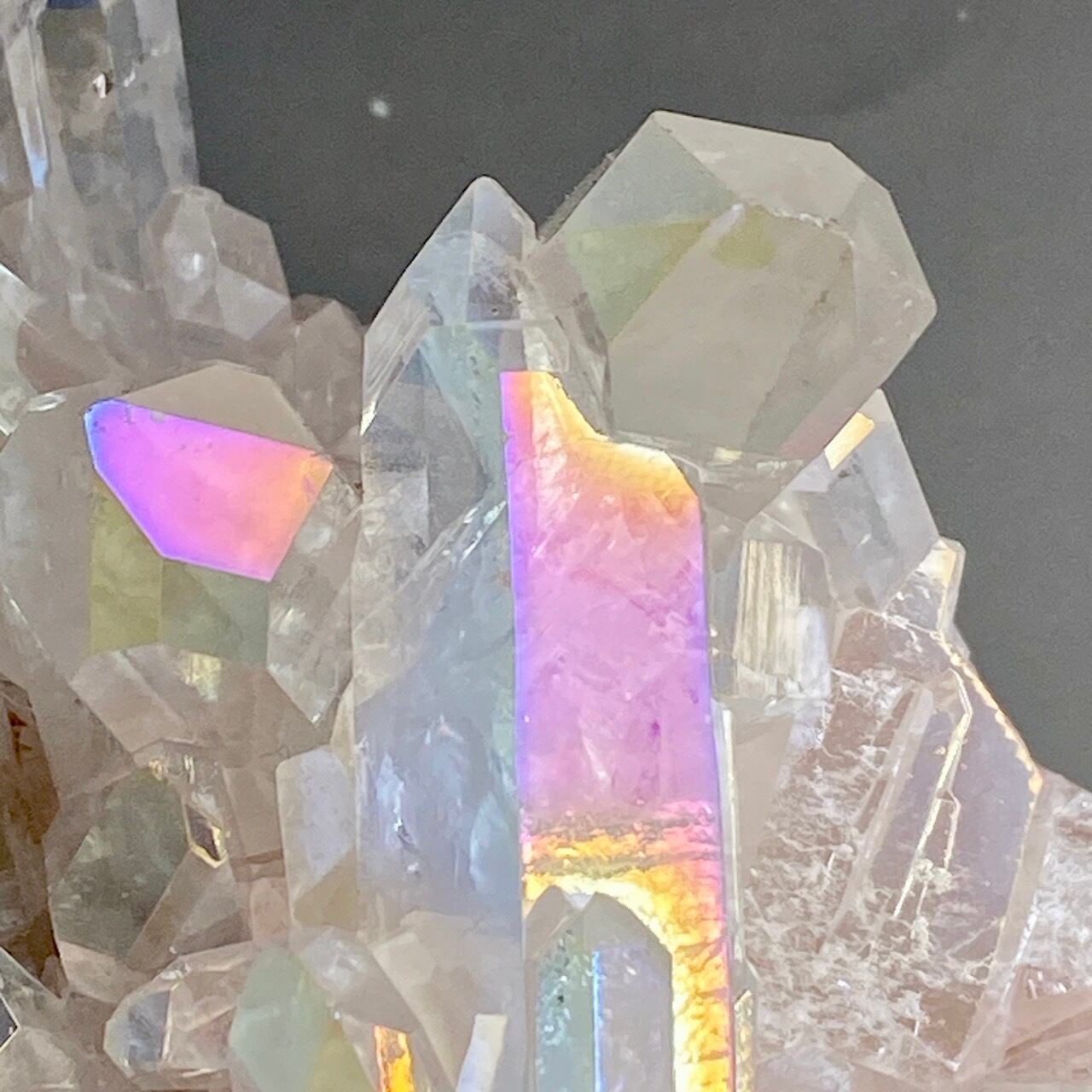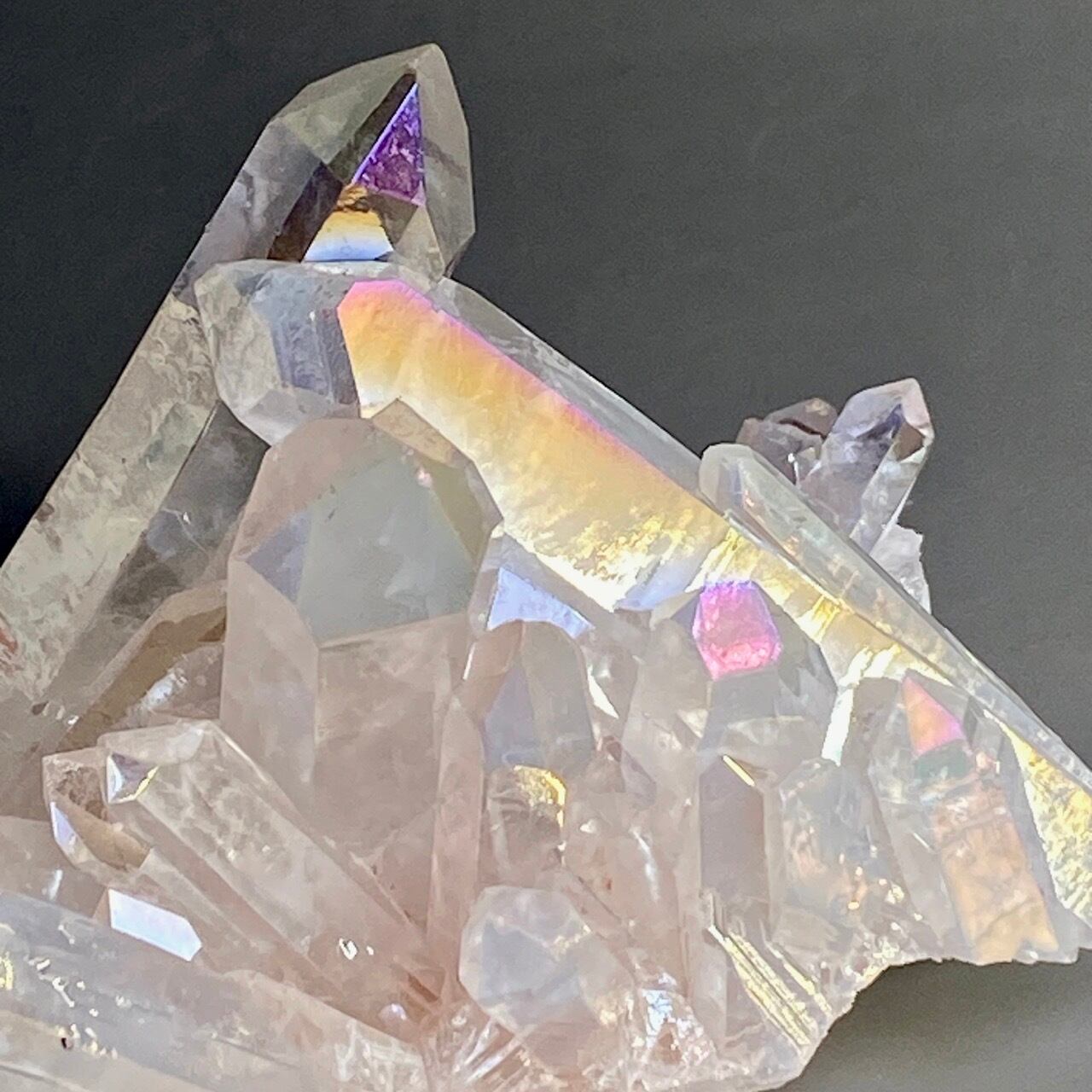 オーラ加工がどぎつくなく控えめなため、見る角度によって部分的にピンクやイエロー、そしてブルーに優しく煌めく子です。ポイントがお互いを支え合っているようなフォーメーションで、人間の縮図の様な感じです。