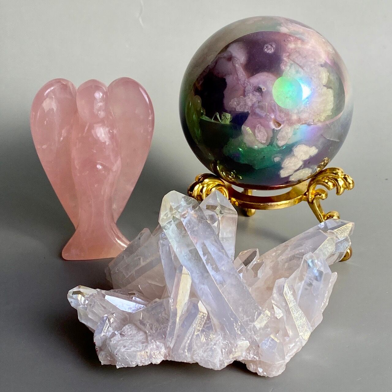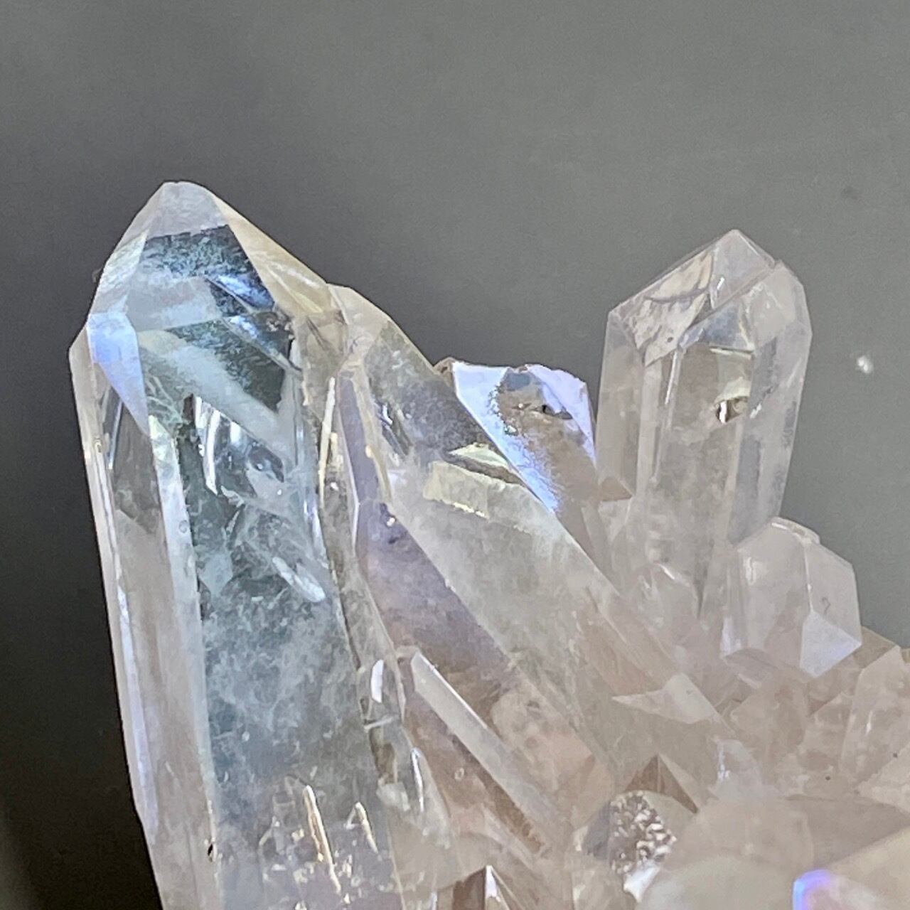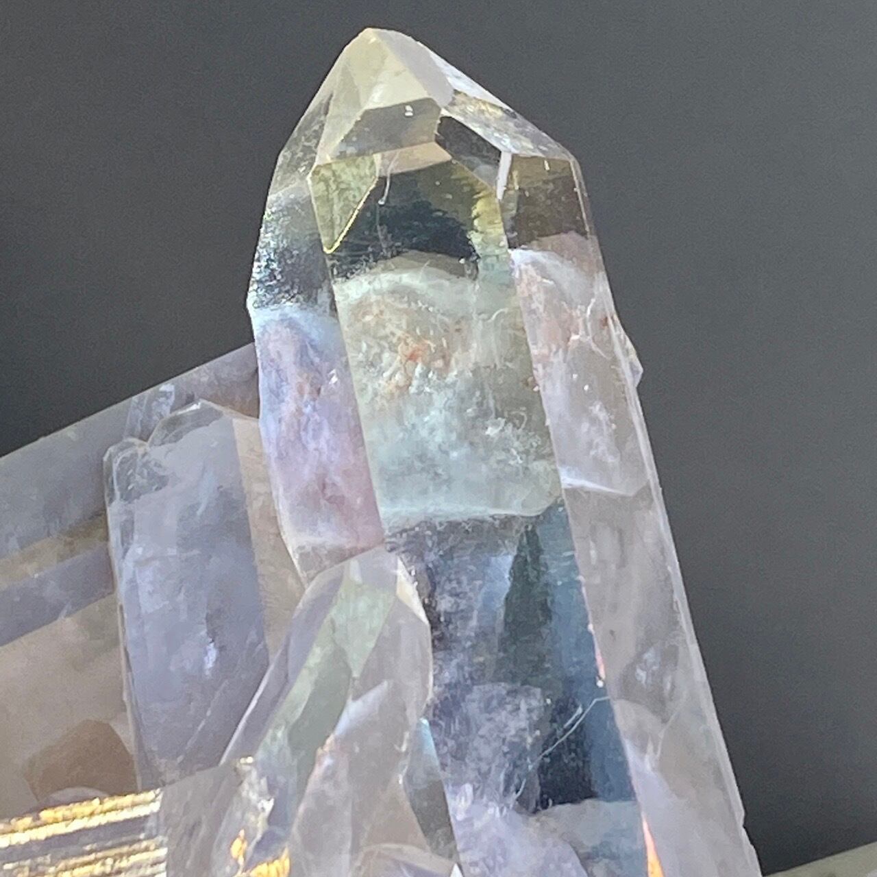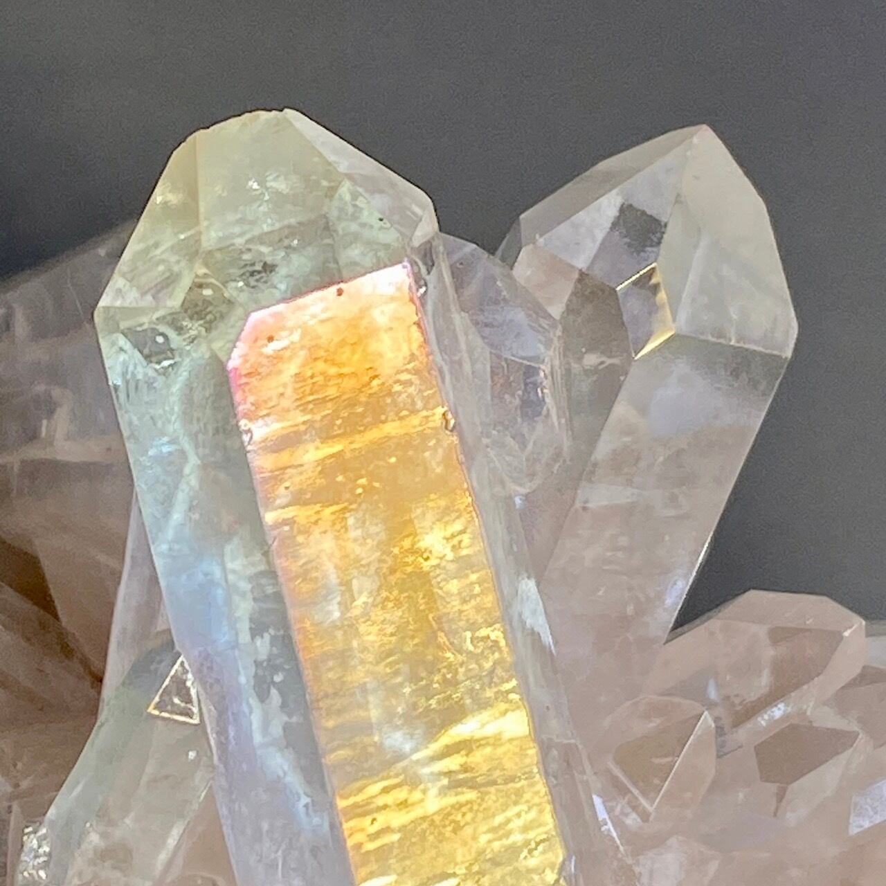 オーラ加工がどぎつくなく控えめなため、見る角度によって部分的にピンクやイエロー、そしてブルーに優しく煌めく子です。ポイントがお互いを支え合っているようなフォーメーションで、人間の縮図の様な感じです。