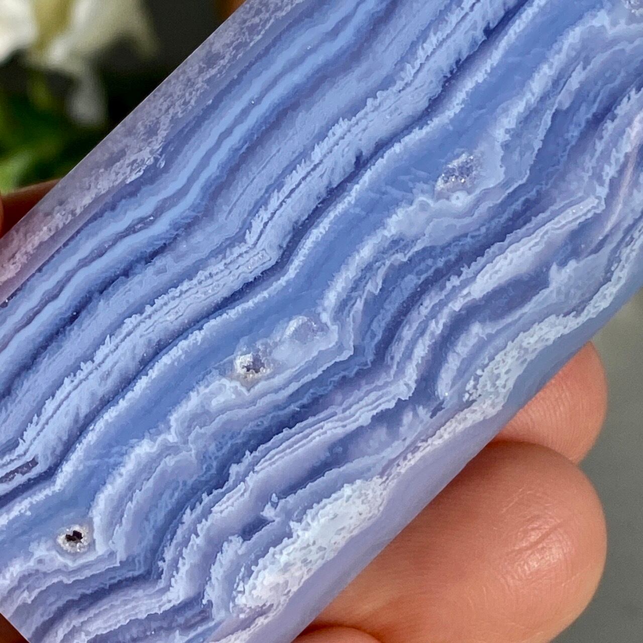 ブルーレースアゲート(和名:空色縞瑪瑙)のポイントになります。その洗練されたレース模様の美しさと、心を穏やかにさせてくれる澄んだ青と水色が非常に優しく、このため息が出てしまう程麗しく、美しい姿をしています。アゲートの中でも算出量が少なく、世界中に愛好家がいるため、高値で取引されています。