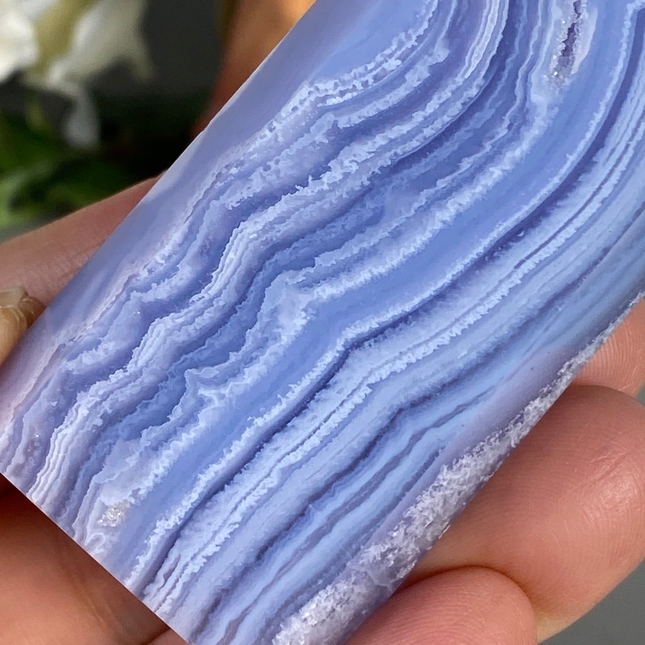 アゲートの中で淡青色で美しいレース模様の縞目が見られる石をブルーレースアゲートと言います。高いヒーリングパワーと鎮静力を持ち、穏やかで平和なエネルギーで包み込んでくれて、ストレスや感情の乱れを取り除き、リラックスさせてくれる効果があると言われています。