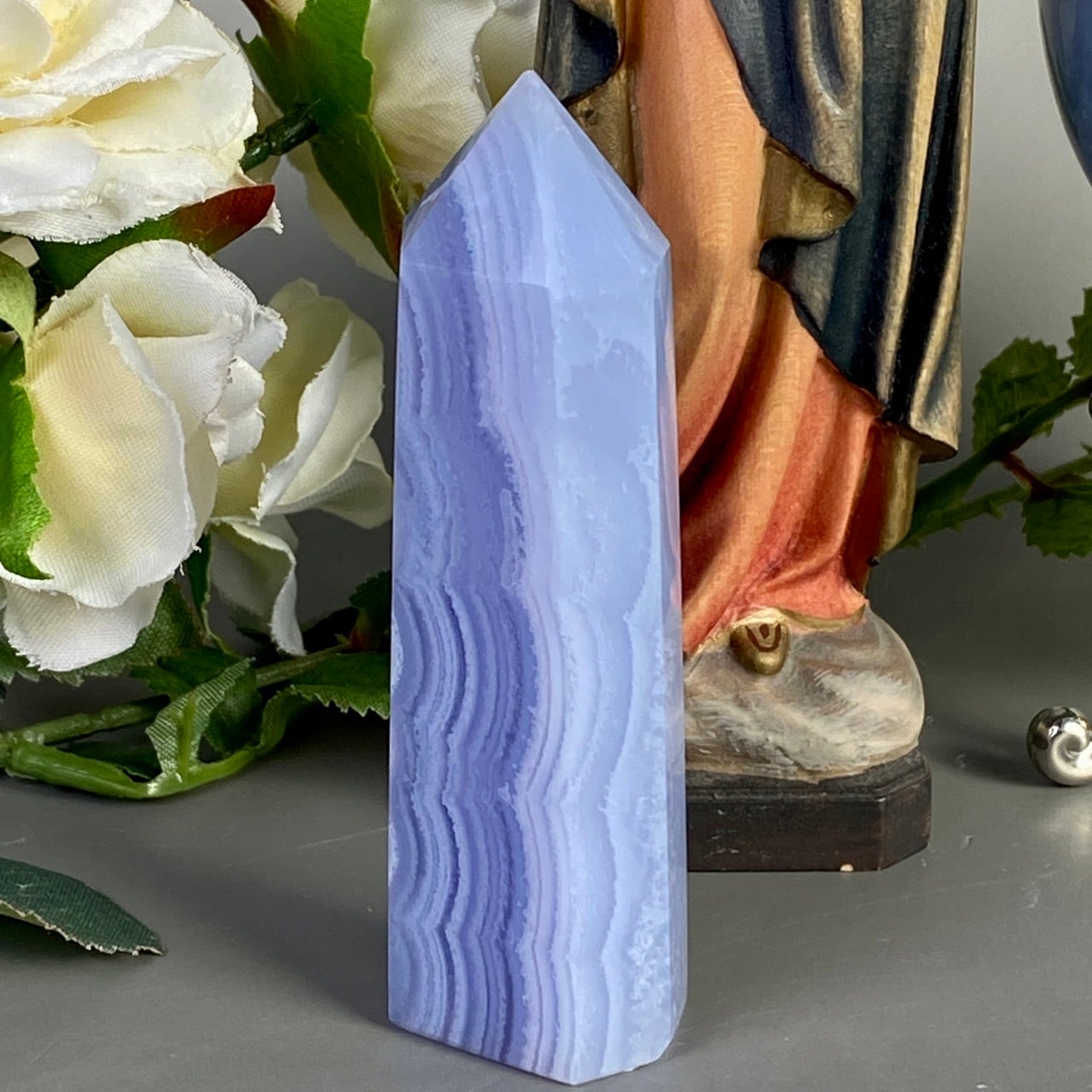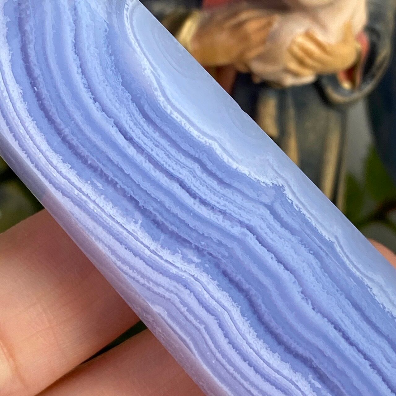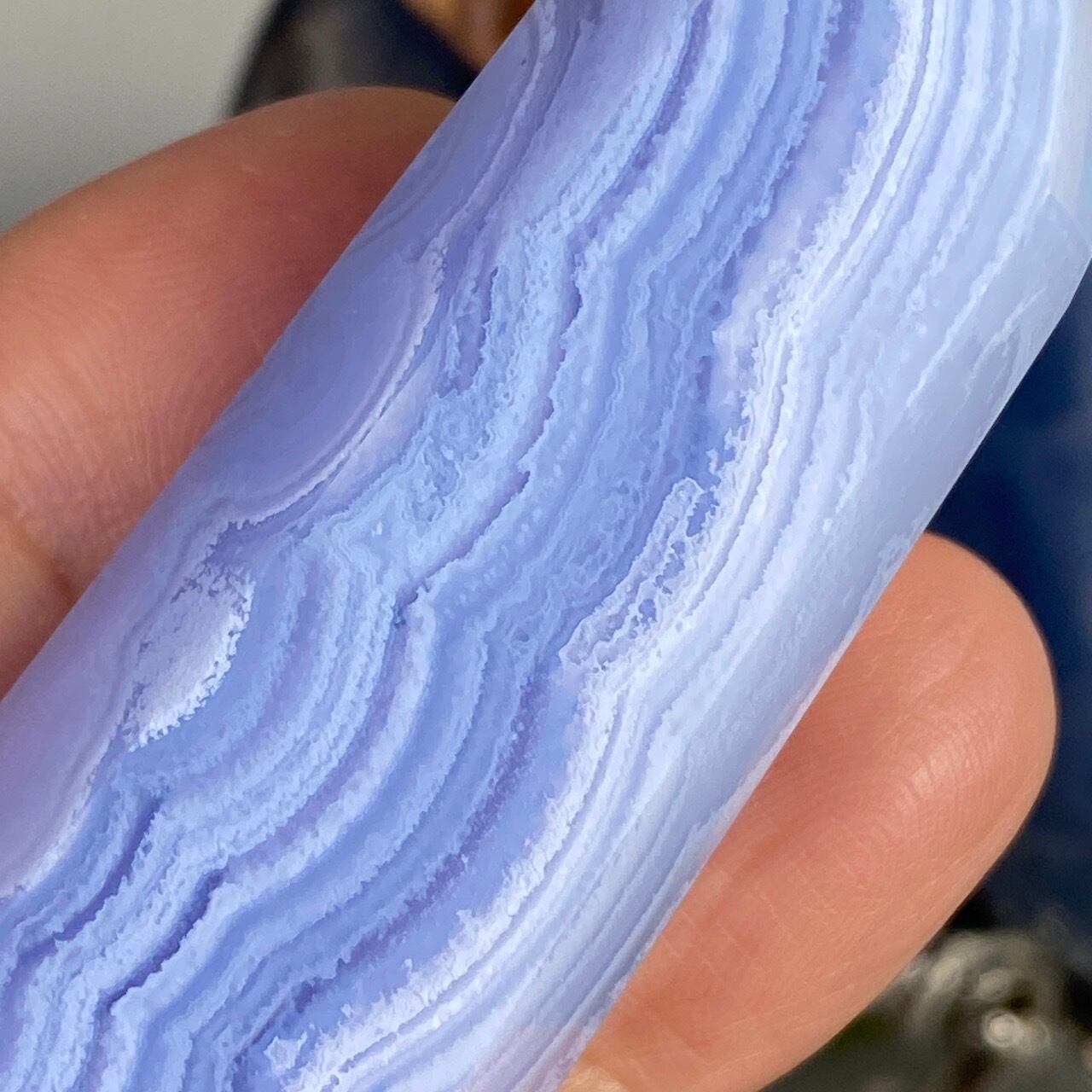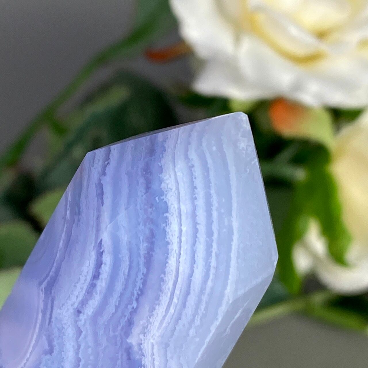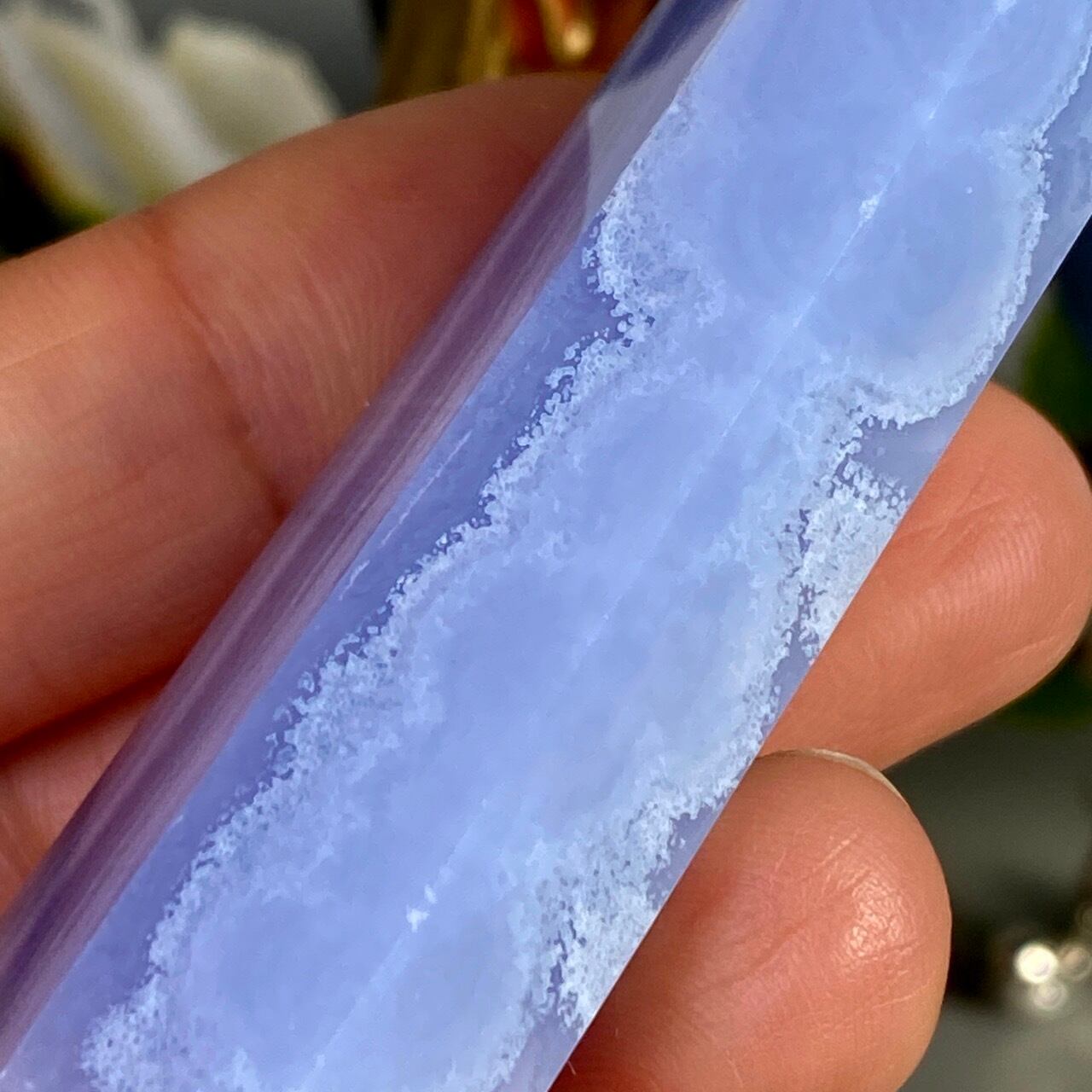 ブルーレースアゲート(和名:空色縞瑪瑙)のポイントになります。その洗練されたレース模様の美しさと、心を穏やかにさせてくれる澄んだ青と水色が非常に優しく、麗しい姿をしています。透けている部分と不透明な部分から成り、それも美しさにアクセントを添えています。