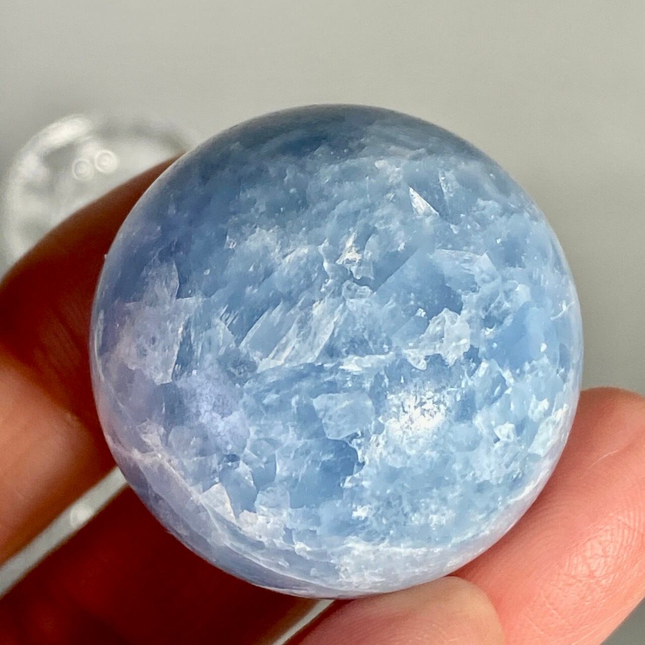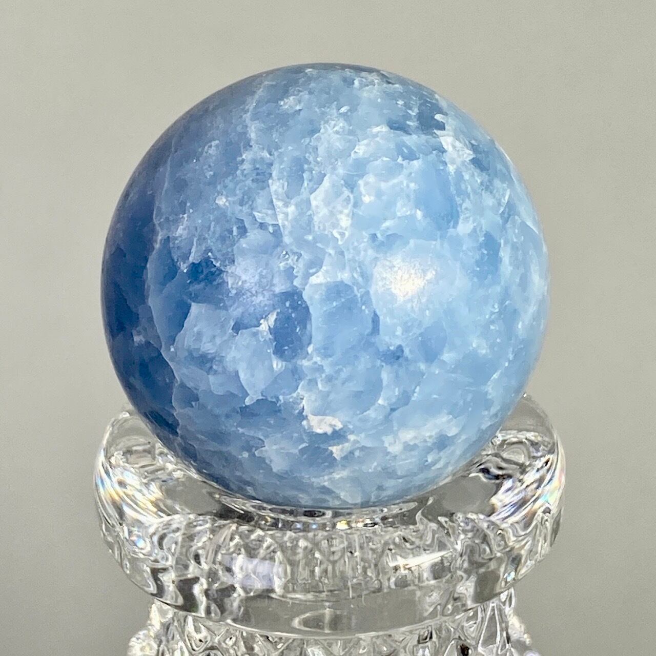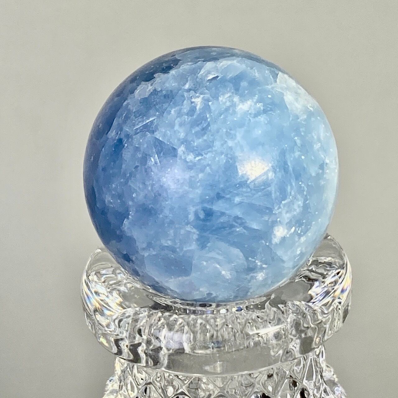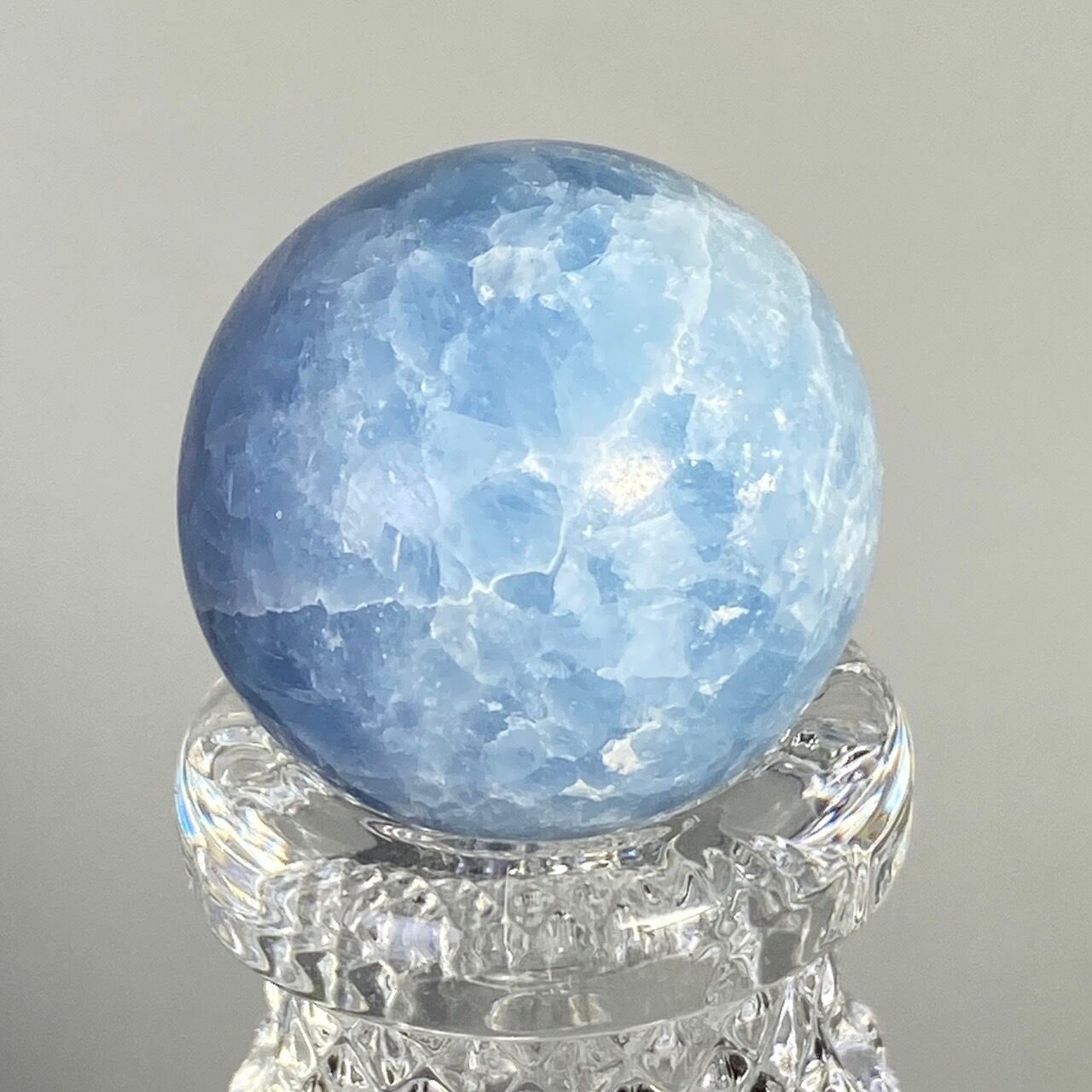 和名『天青石』の通り、晴れ渡る空を思わせる爽やかな青色が美しい、セレスタイトのスフィアになります。ところどころ煌めきがあり、優しい色合いと水色の濃淡が形成する模様に癒される感じがします(個人の感想です)。