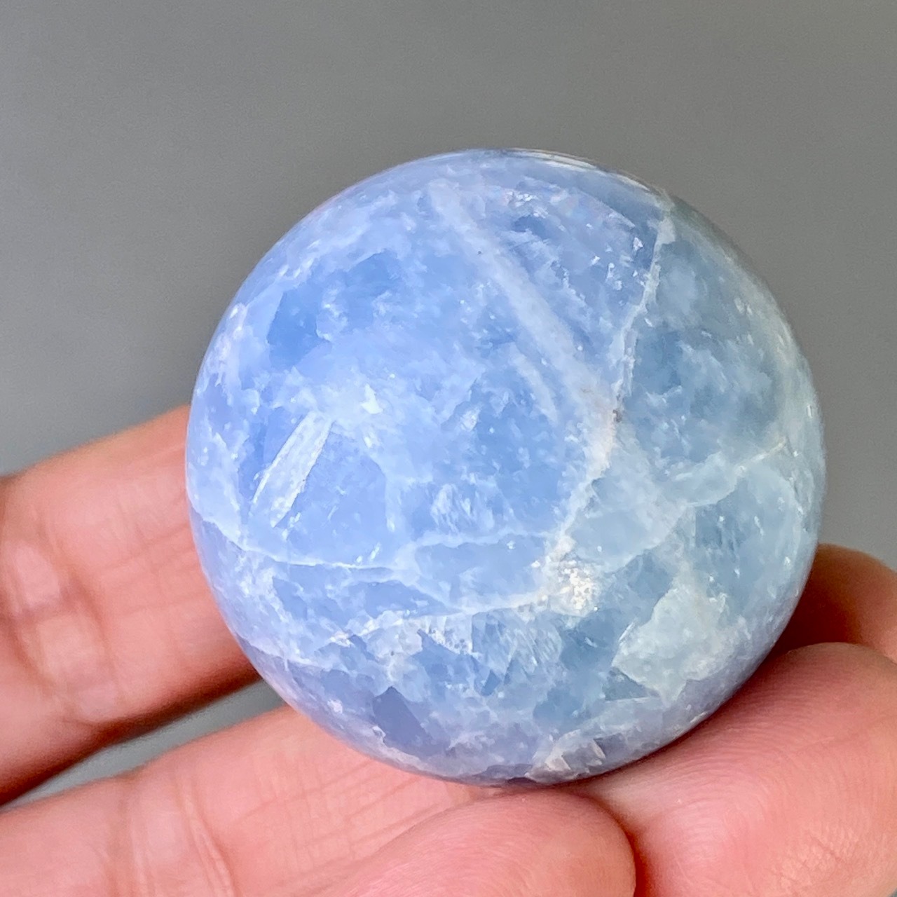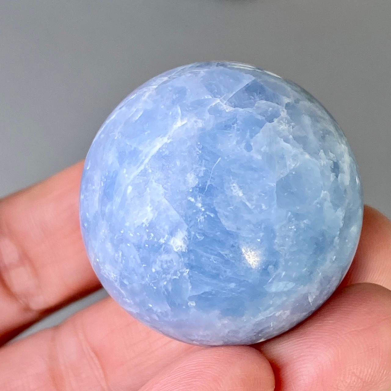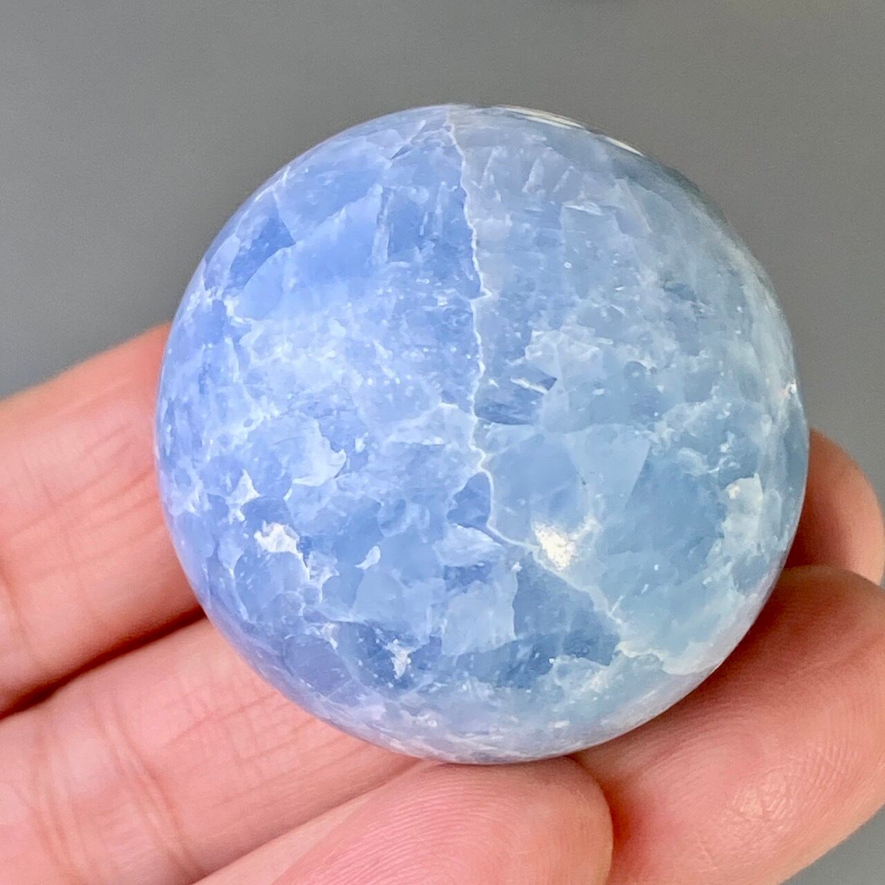 和名『天青石』の通り、晴れ渡る空を思わせる爽やかな青色が美しい、セレスタイトのスフィアになります。ところどころ煌めきがあり、優しい色合いと水色の濃淡が形成する模様に癒される感じがします(個人の感想です)。