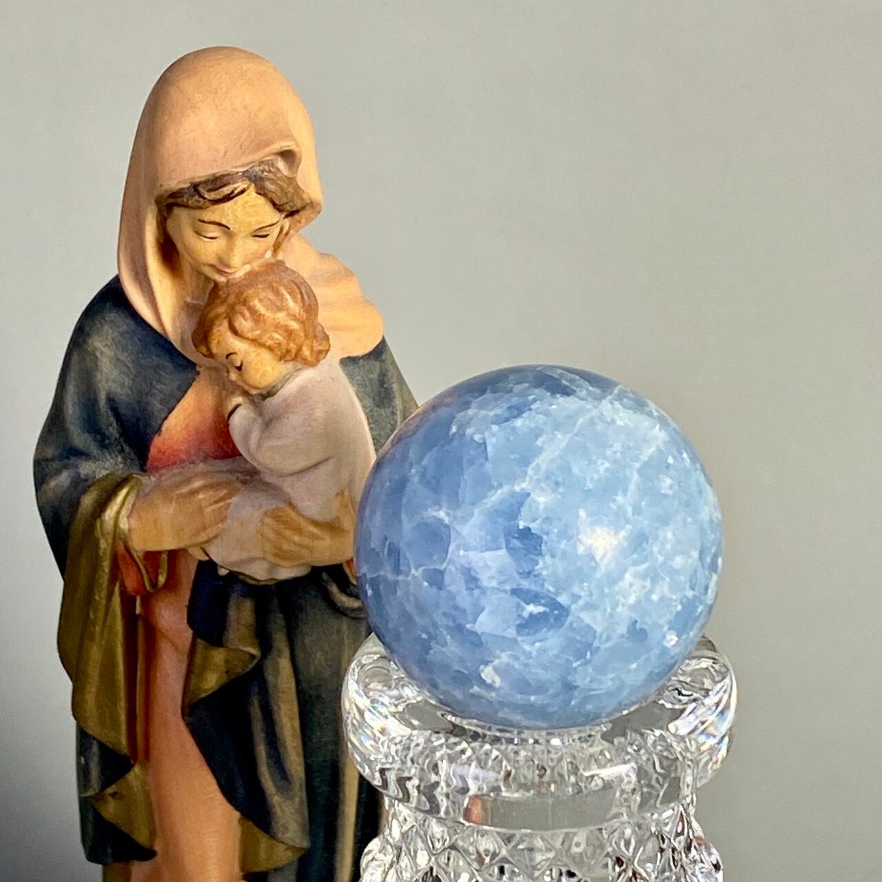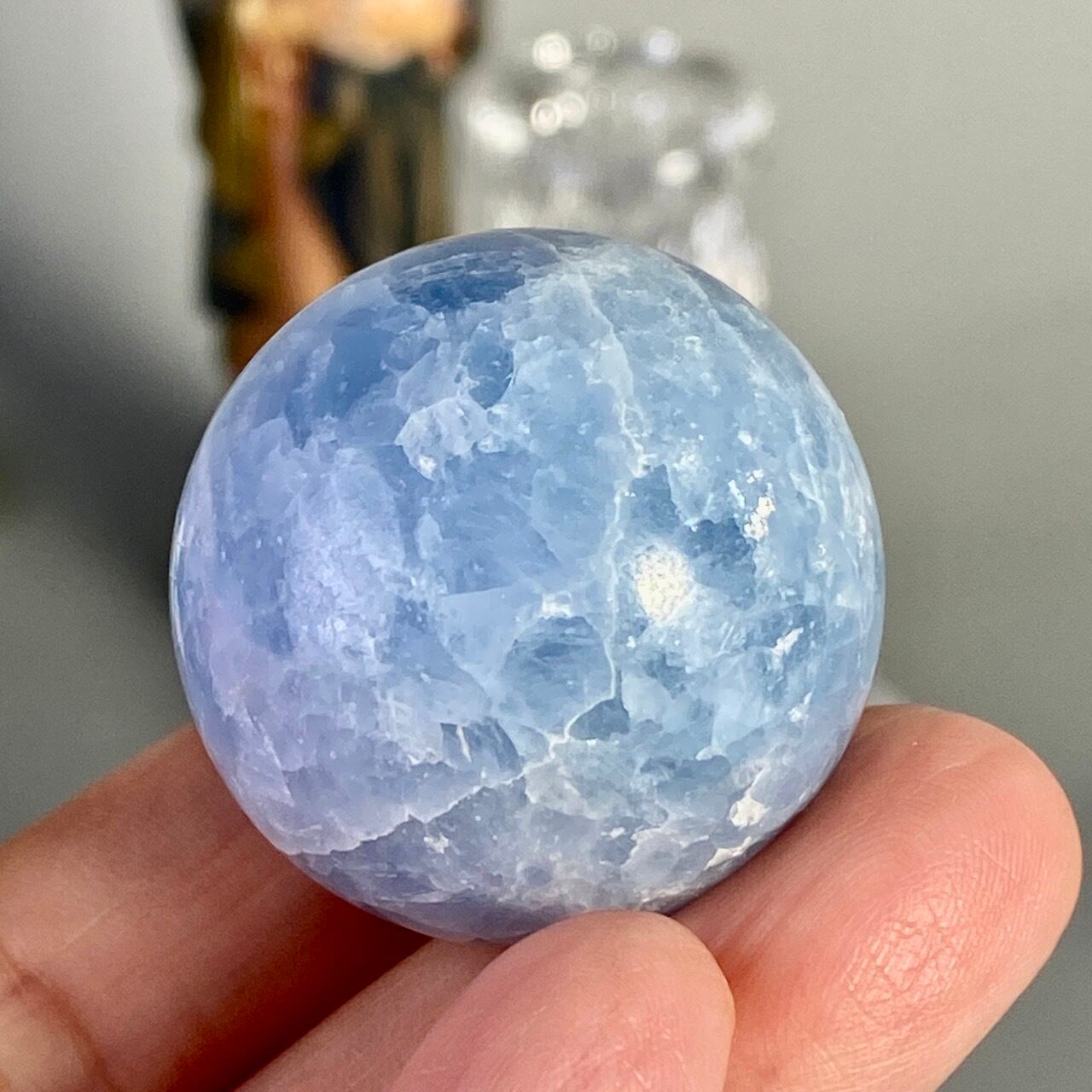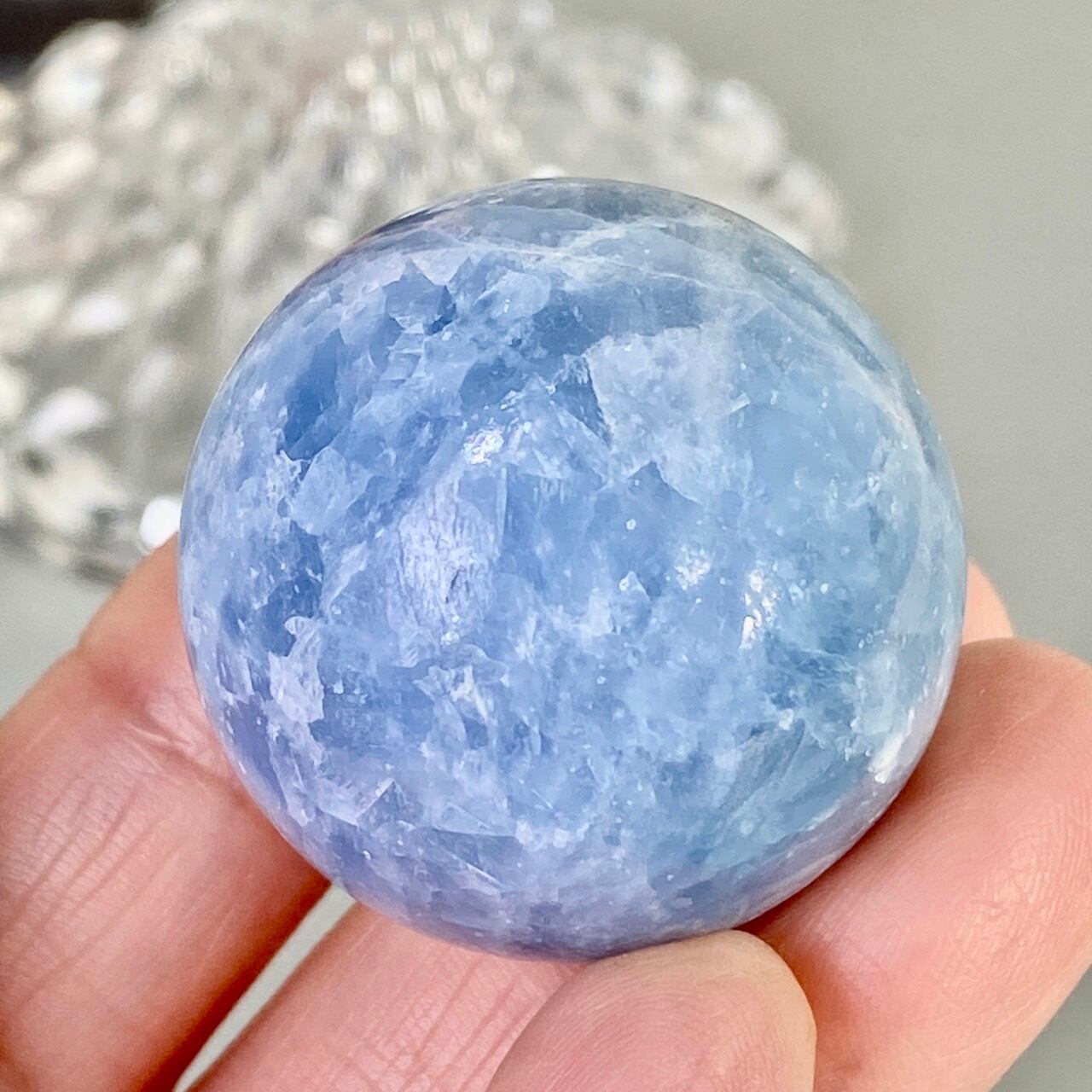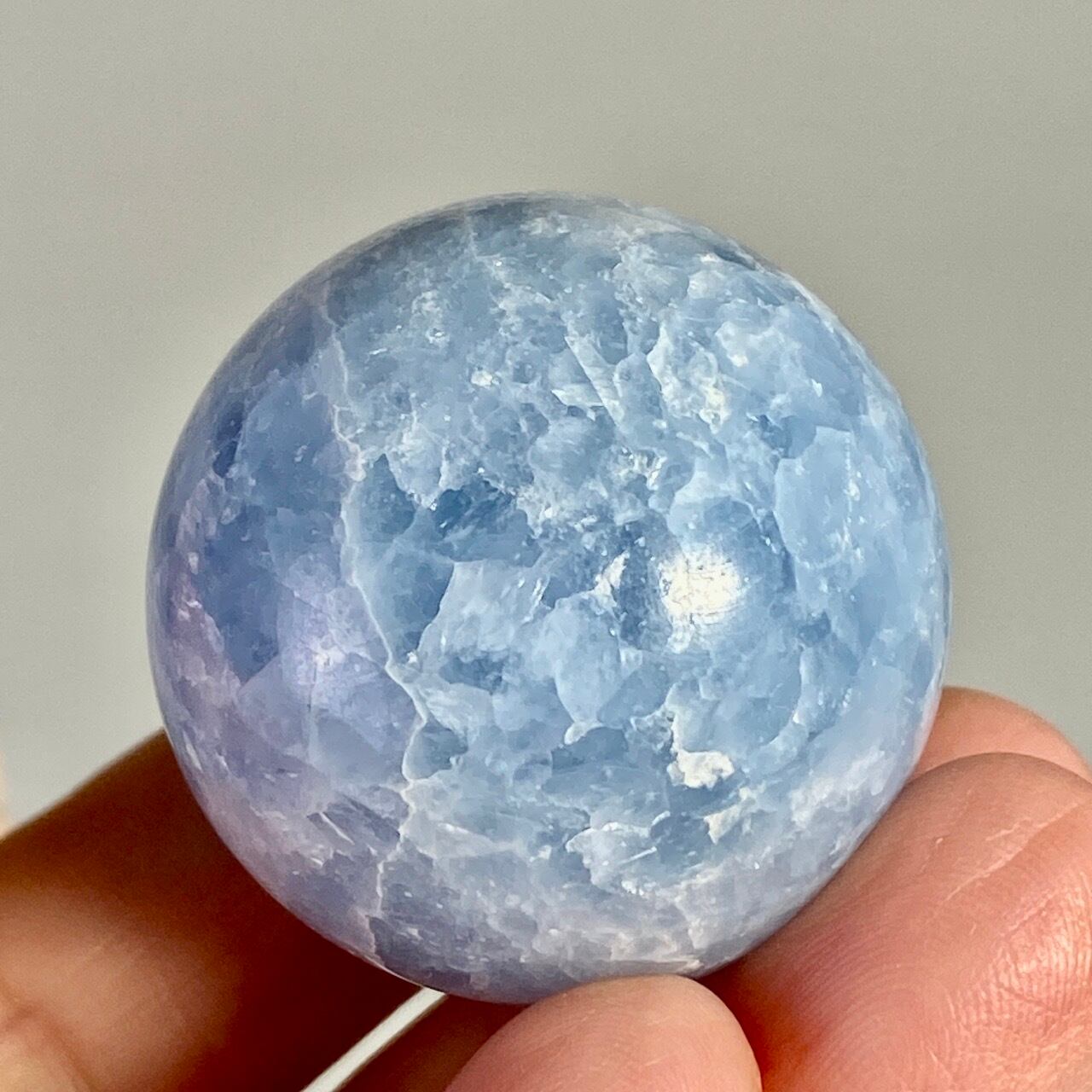 和名『天青石』の通り、晴れ渡る空を思わせる爽やかな青色が美しい、セレスタイトのスフィアになります。ところどころ煌めきがあり、優しい色合いと水色の濃淡が形成する模様に癒される感じがします(個人の感想です)。