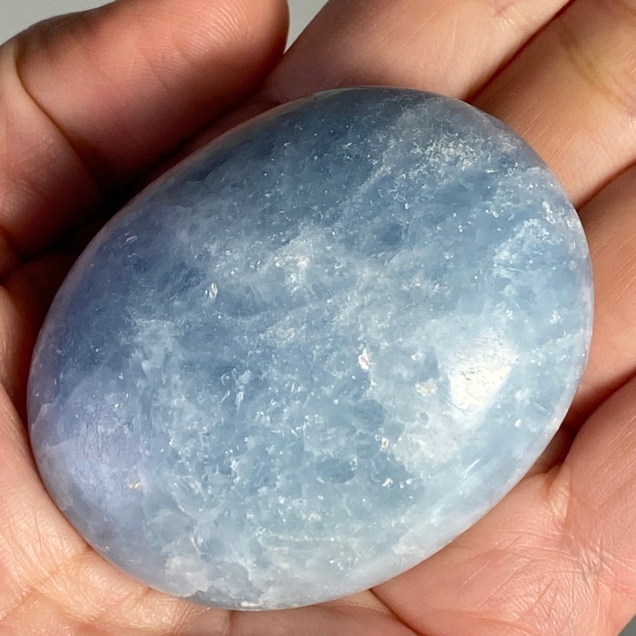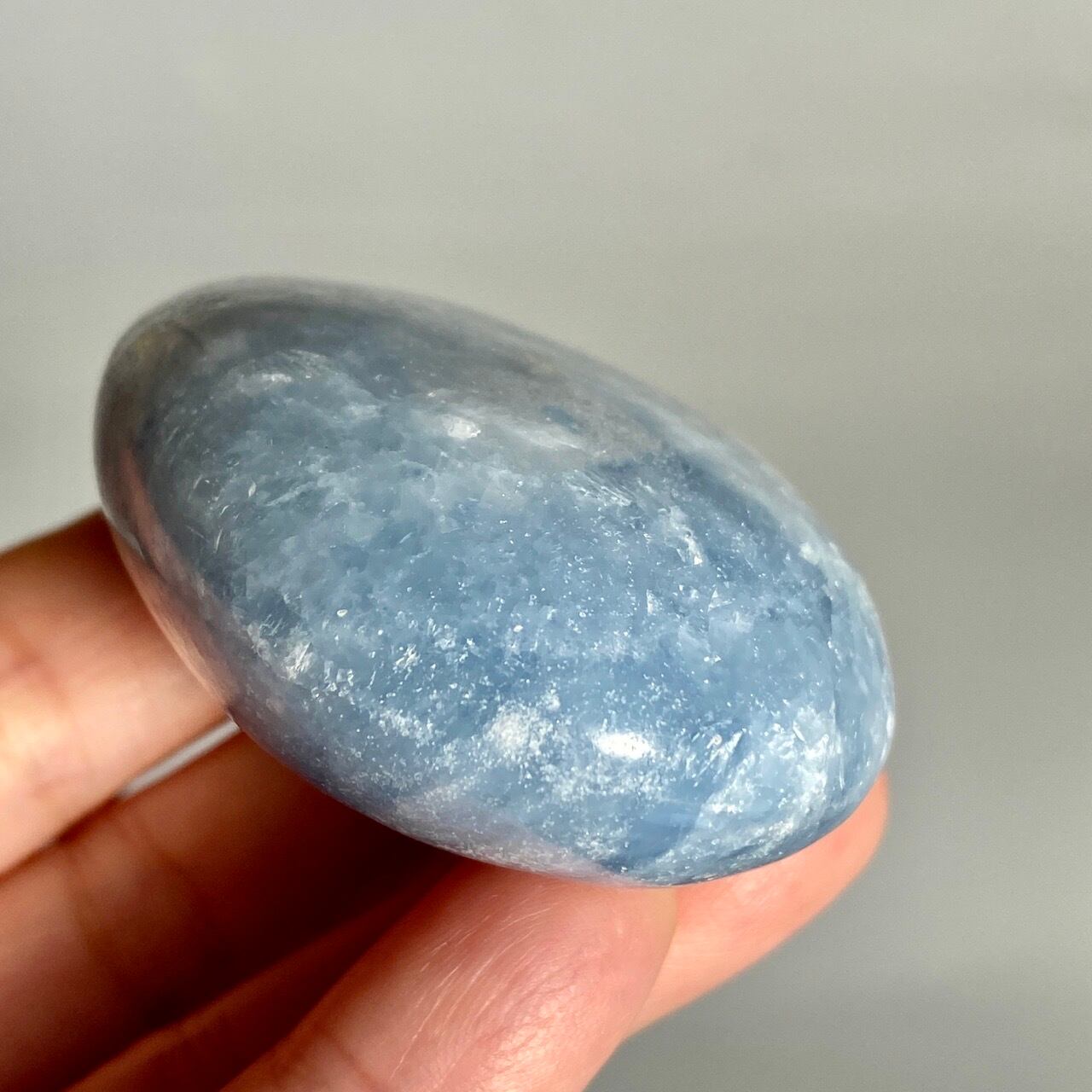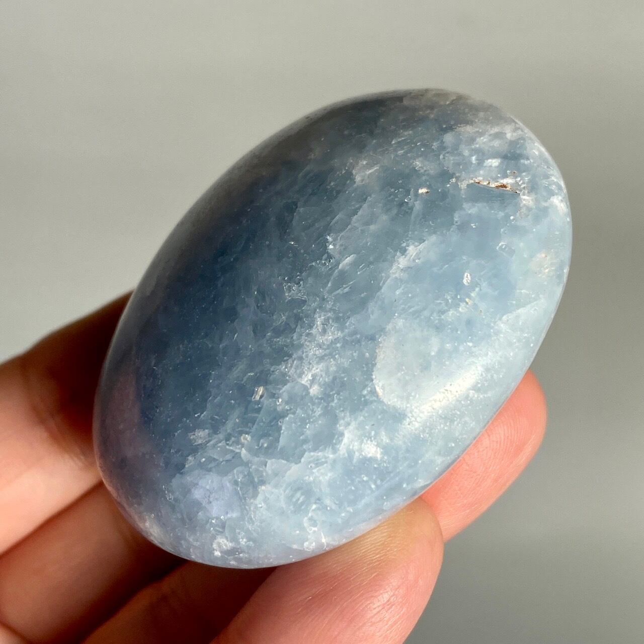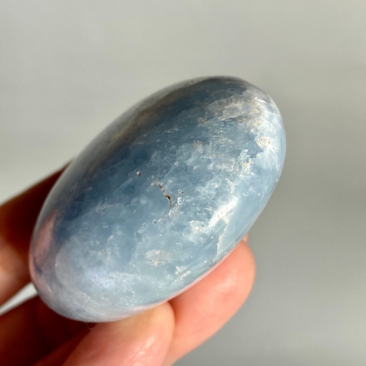 和名『天青石』の通り、晴れ渡る空を思わせる爽やかな青色が美しい、セレスタイトのパームストーンになります。優しい色合いと水色の濃淡が形成する模様に癒される感じがします(個人の感想です)。