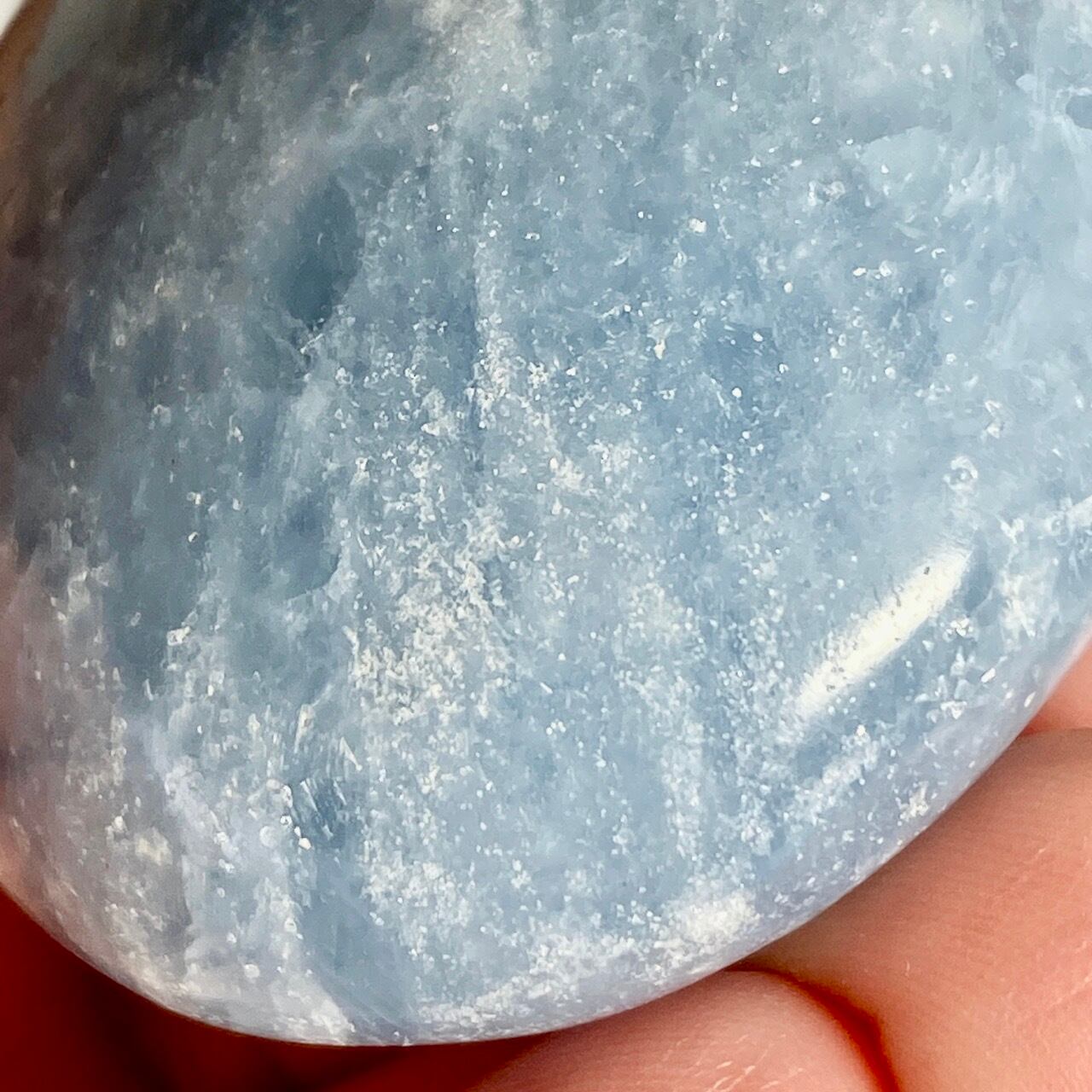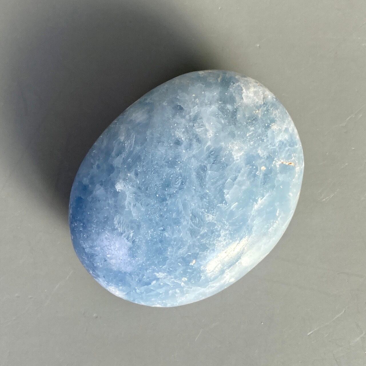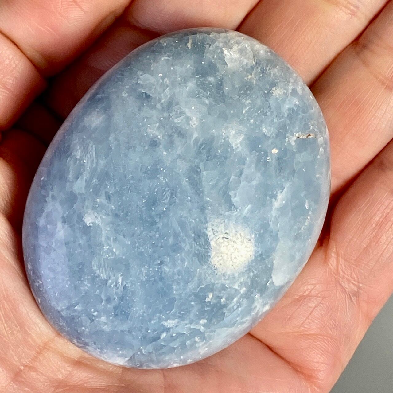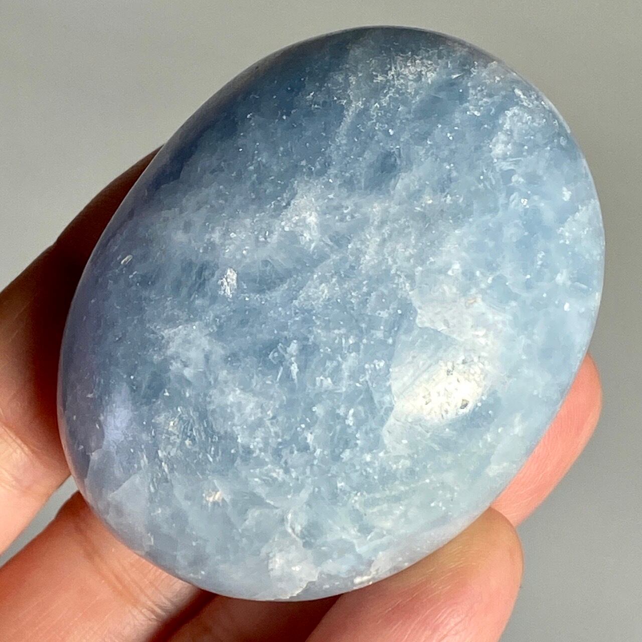 和名『天青石』の通り、晴れ渡る空を思わせる爽やかな青色が美しい、セレスタイトのパームストーンになります。優しい色合いと水色の濃淡が形成する模様に癒される感じがします(個人の感想です)。