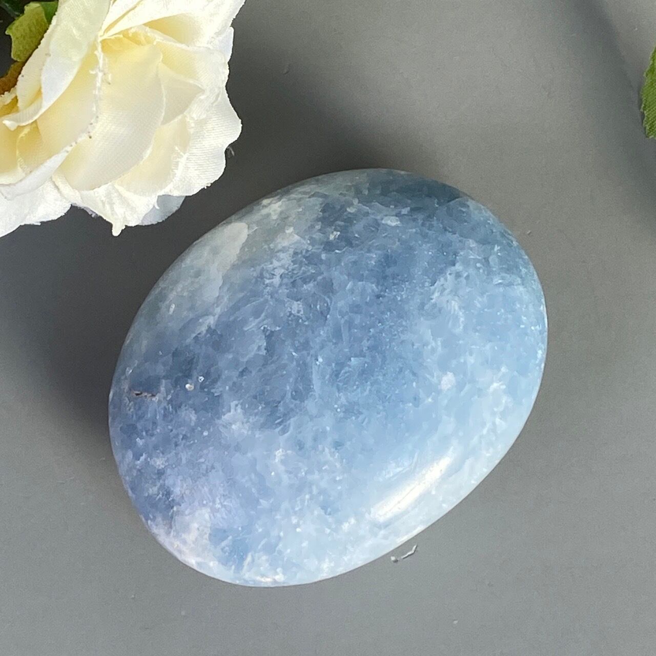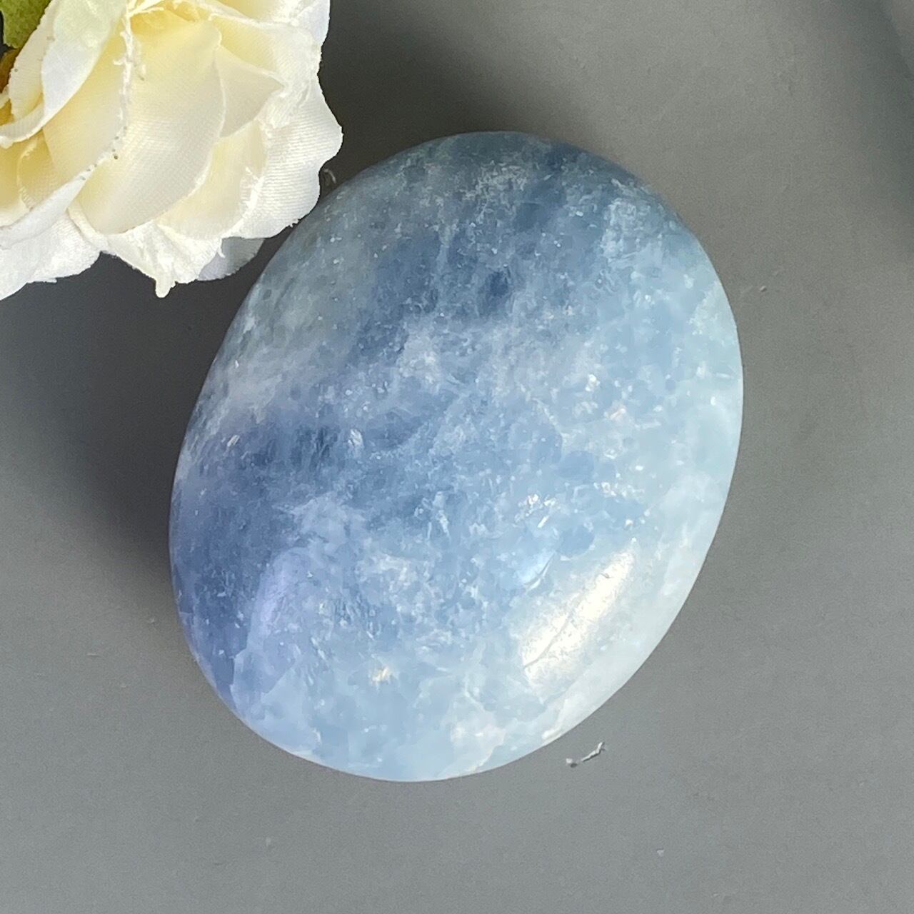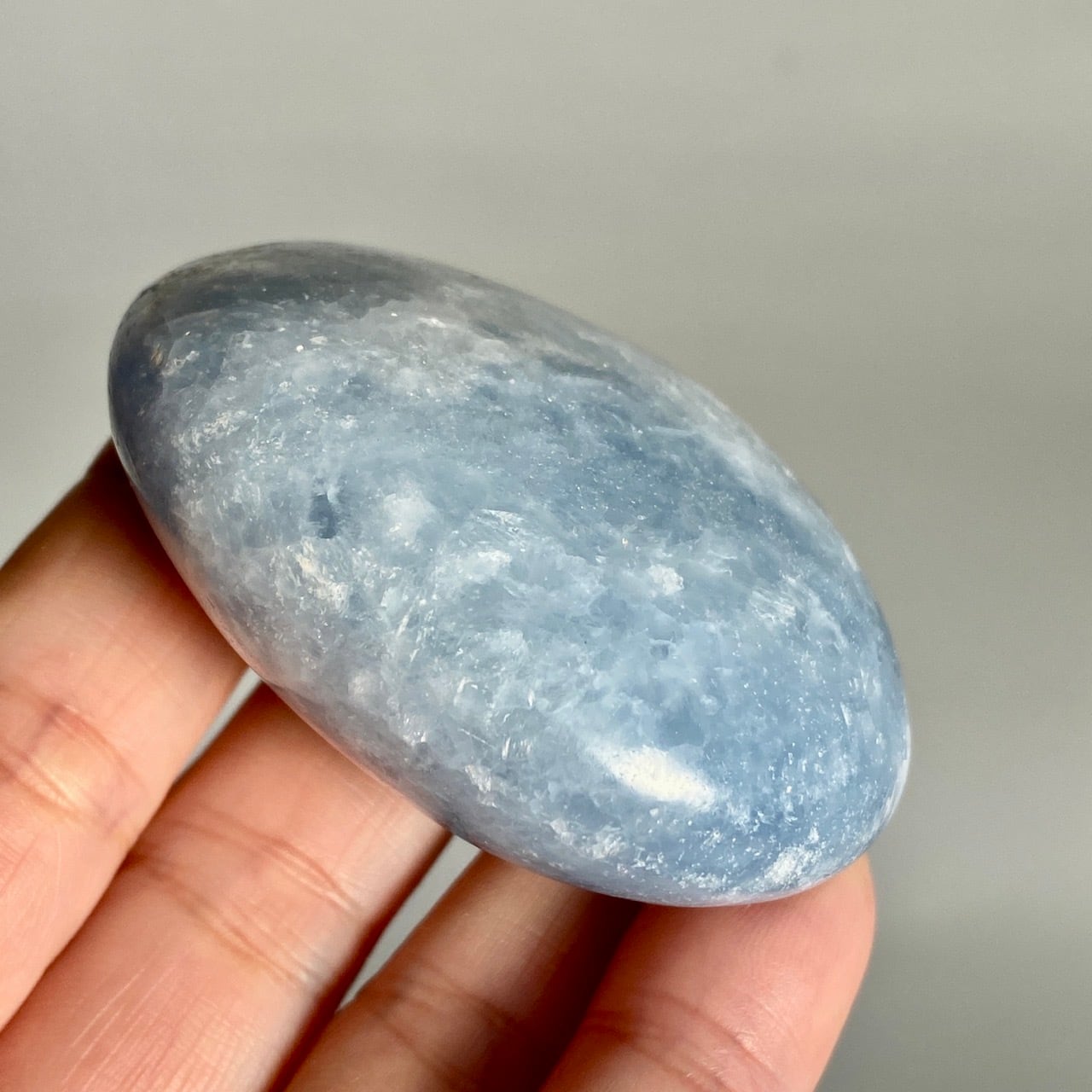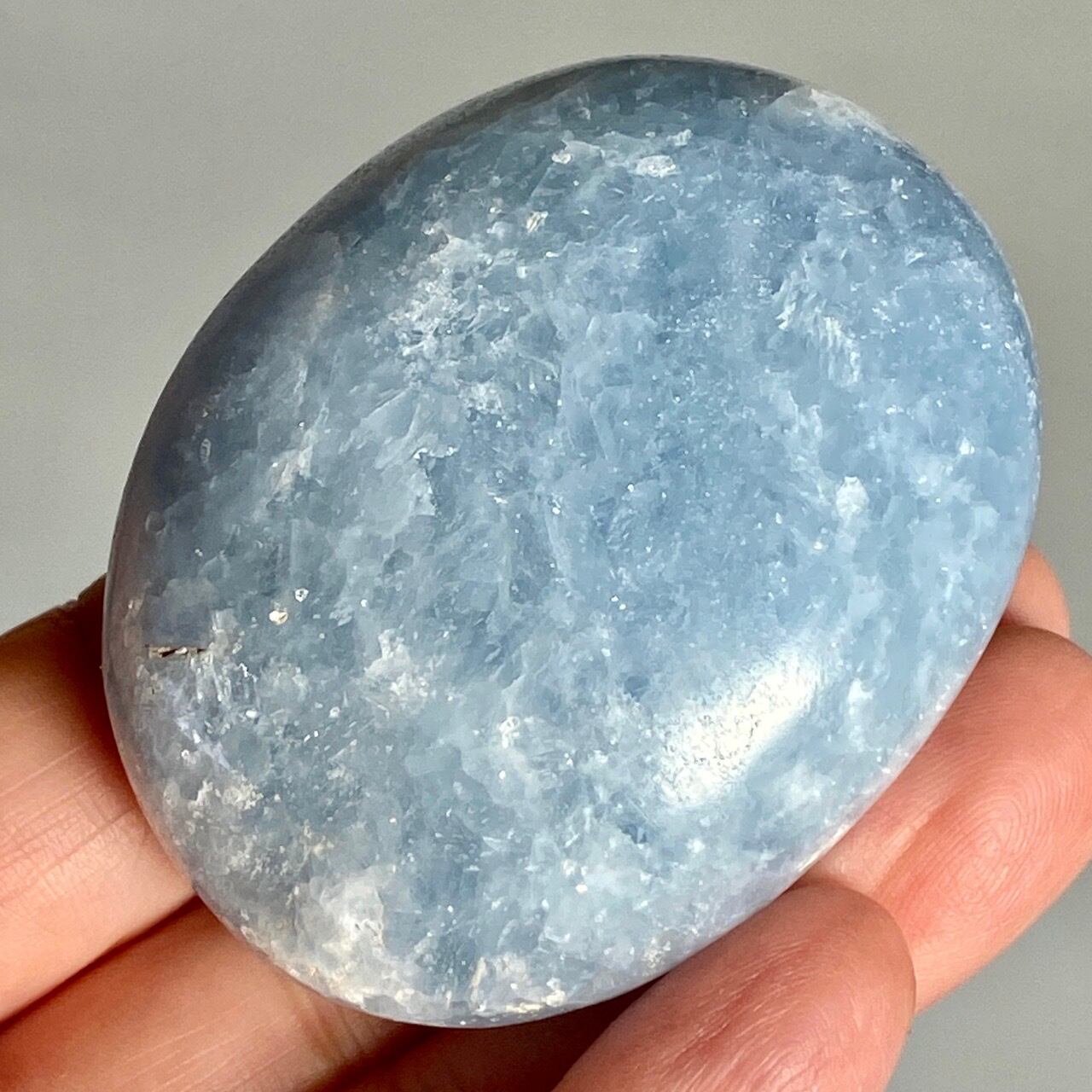 和名『天青石』の通り、晴れ渡る空を思わせる爽やかな青色が美しい、セレスタイトのパームストーンになります。優しい色合いと水色の濃淡が形成する模様に癒される感じがします(個人の感想です)。