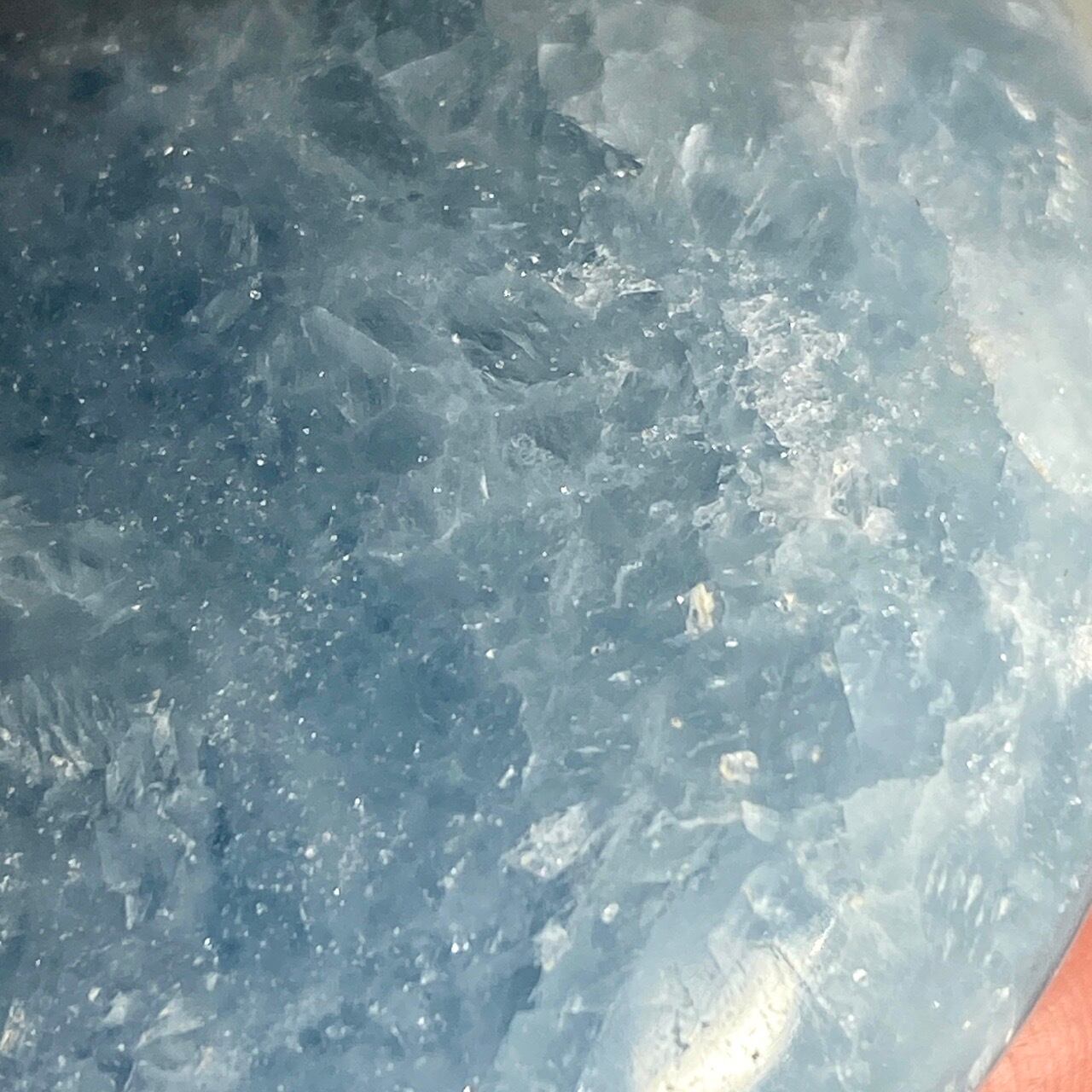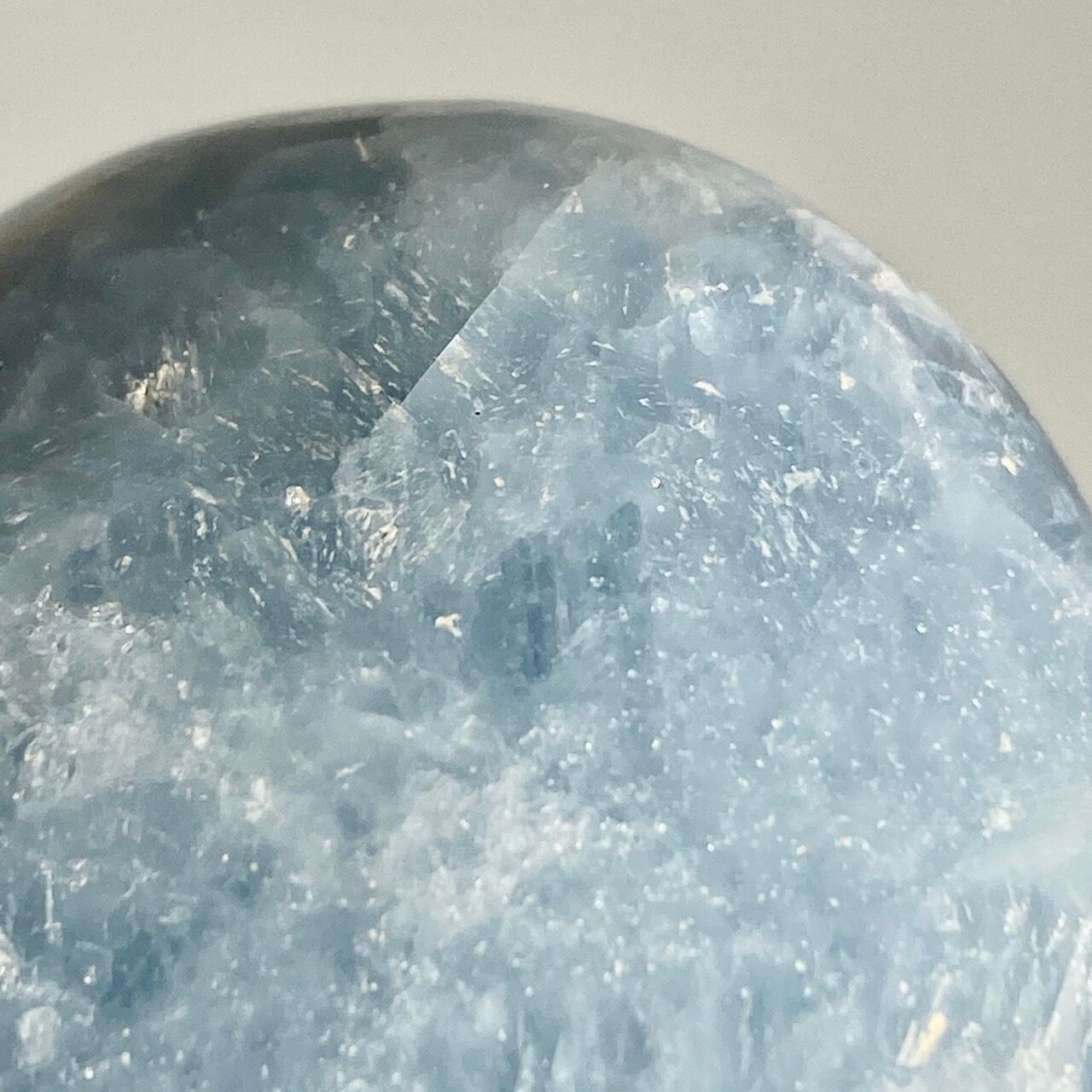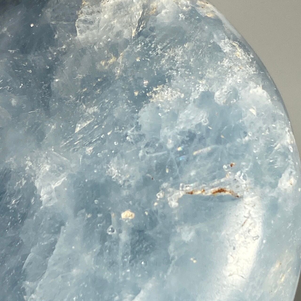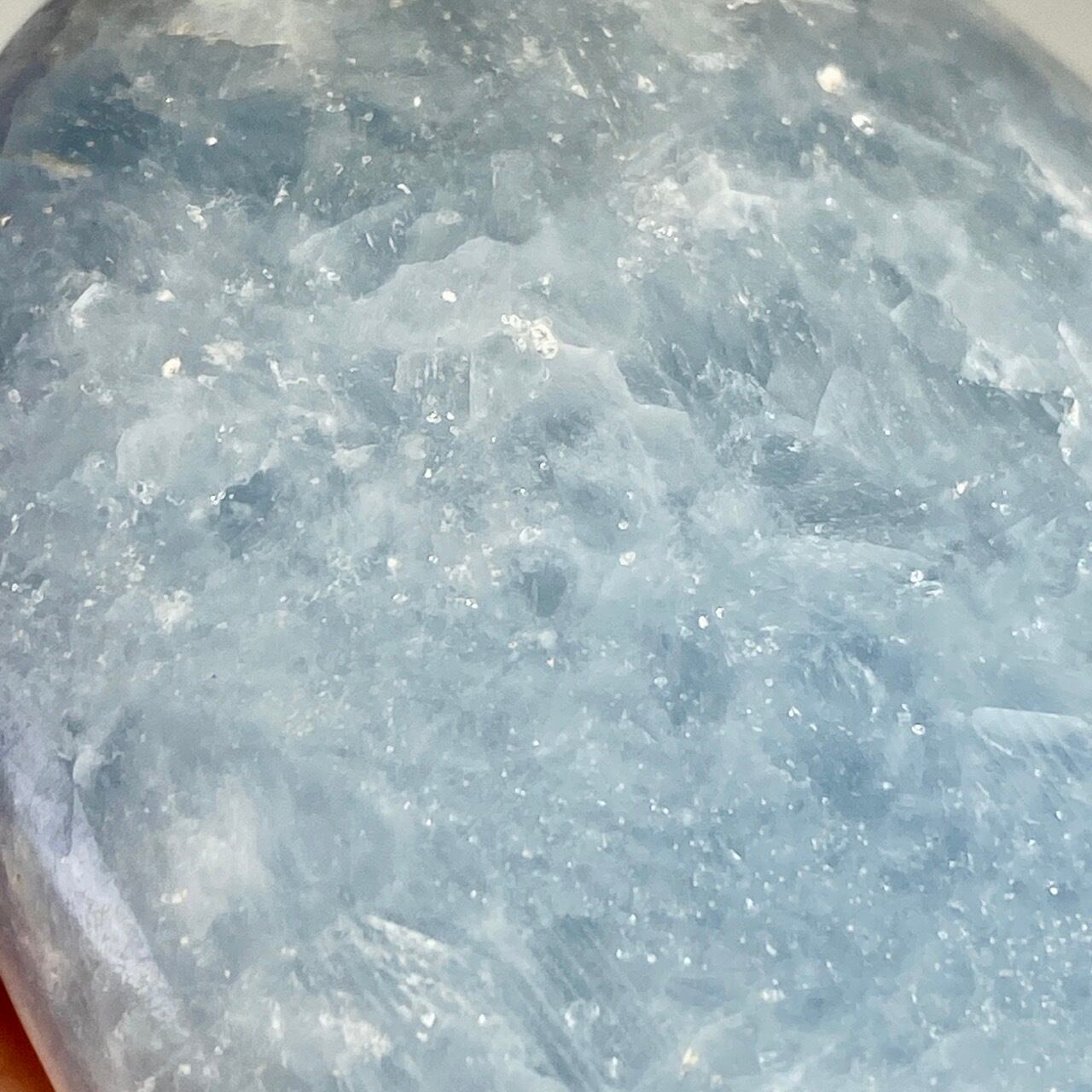 和名『天青石』の通り、晴れ渡る空を思わせる爽やかな青色が美しい、セレスタイトのパームストーンになります。優しい色合いと水色の濃淡が形成する模様に癒される感じがします(個人の感想です)。