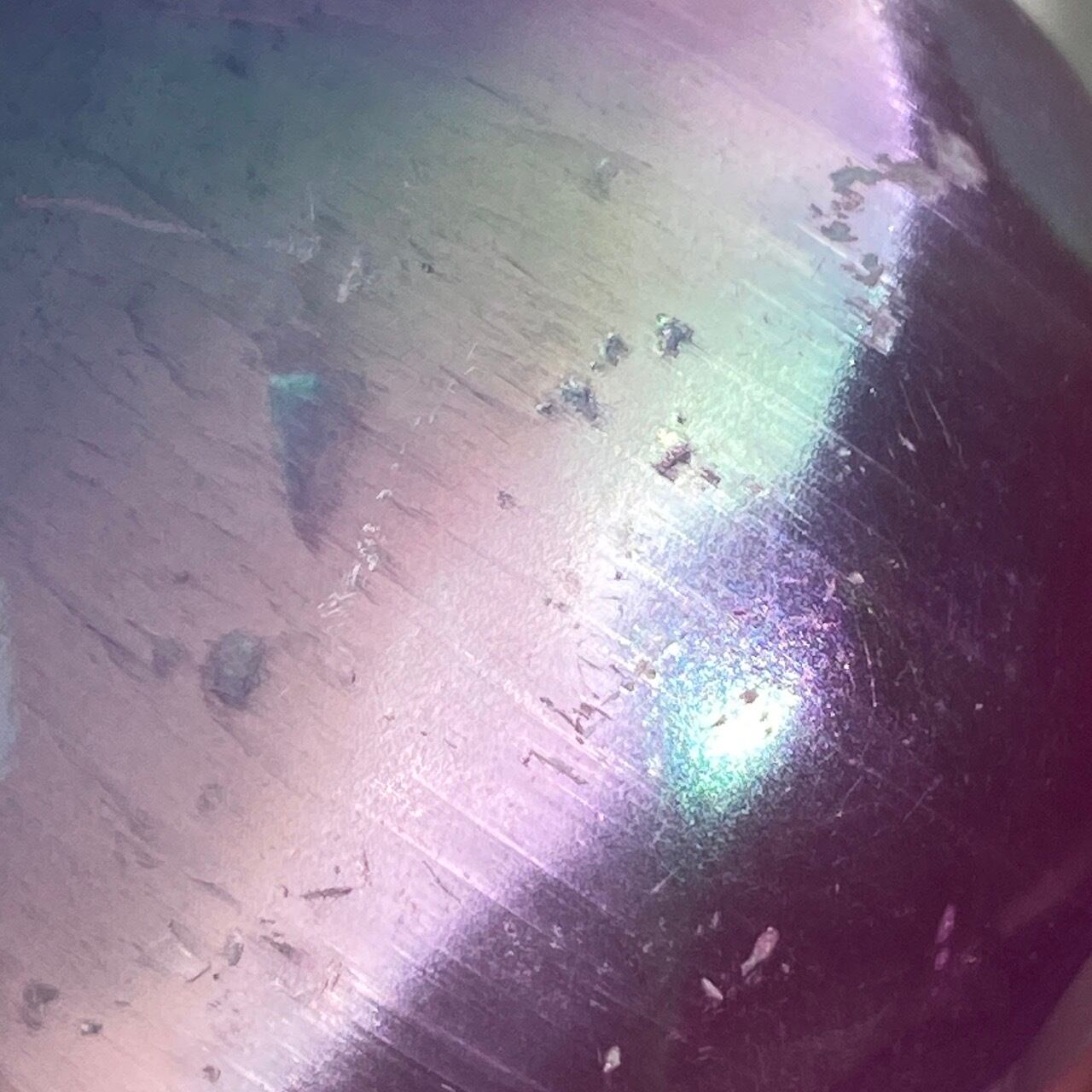 セレナイト自体にキズが点在していて、オーラ加工が施されているため浮かび上がります。また表面にチップやラックがあるのに加え、球体も多少凹凸があります。
