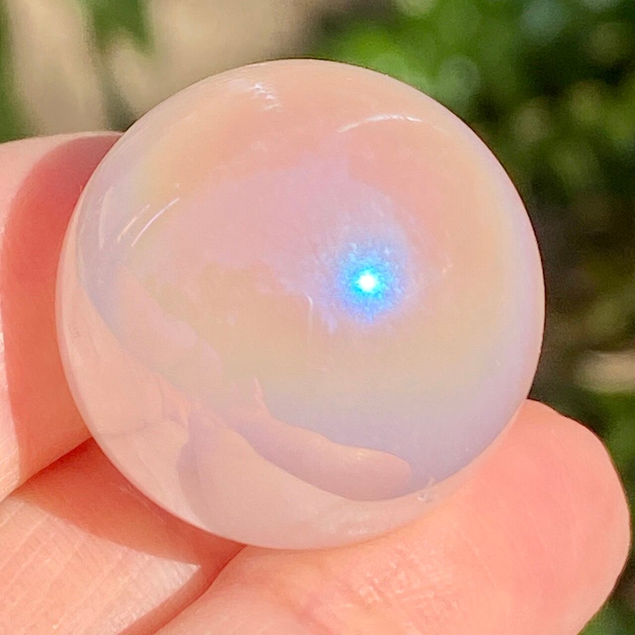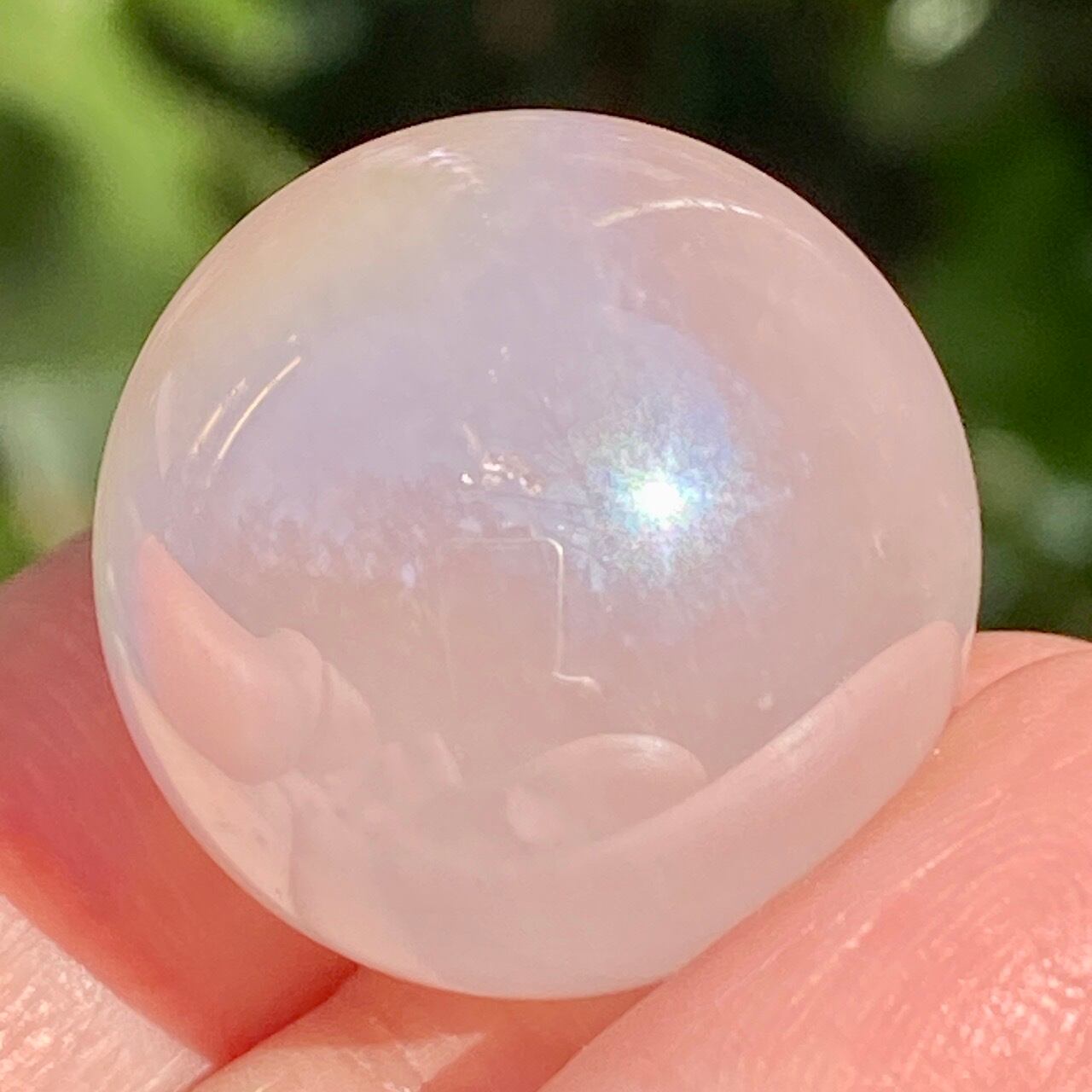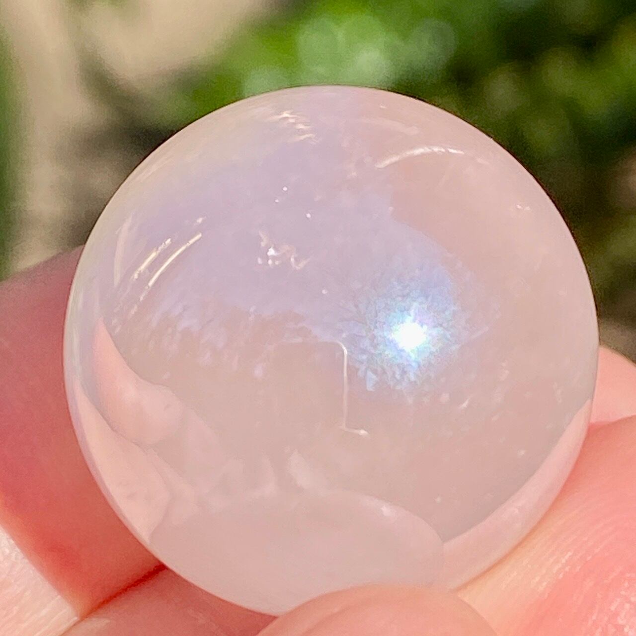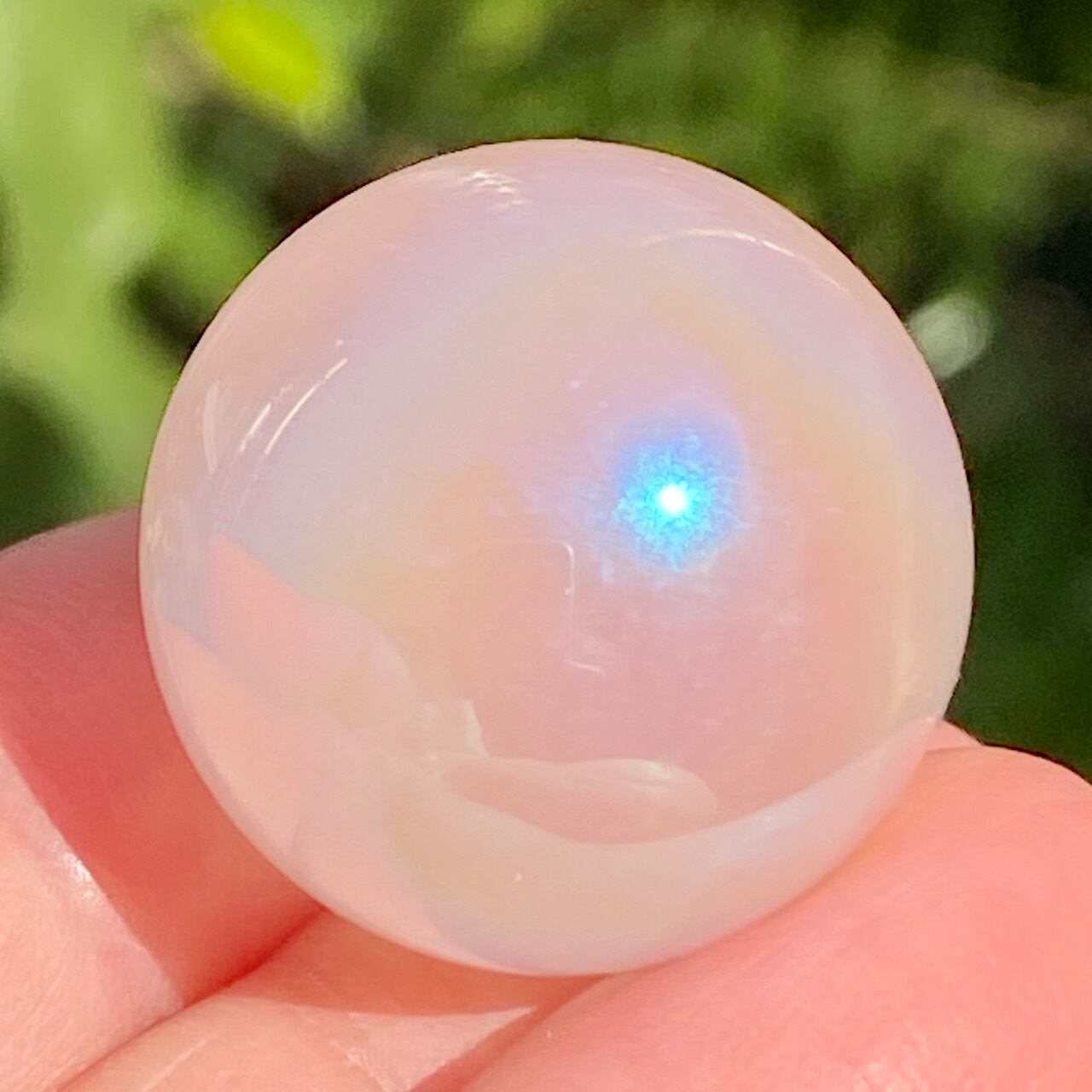 ローズクォーツにオーラ加工が施されると、可愛さ増し増しで、見ていると心がキュンキュンします。この子はミルキーな子でほんのりピンクに色づいています。