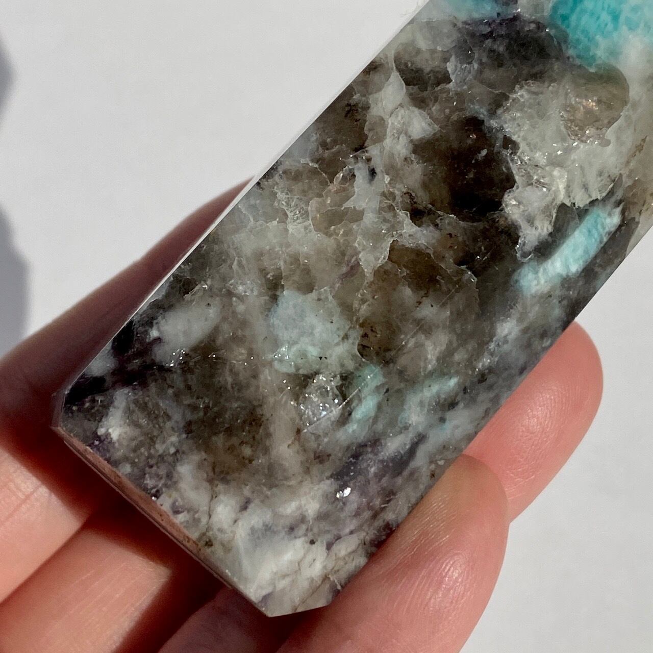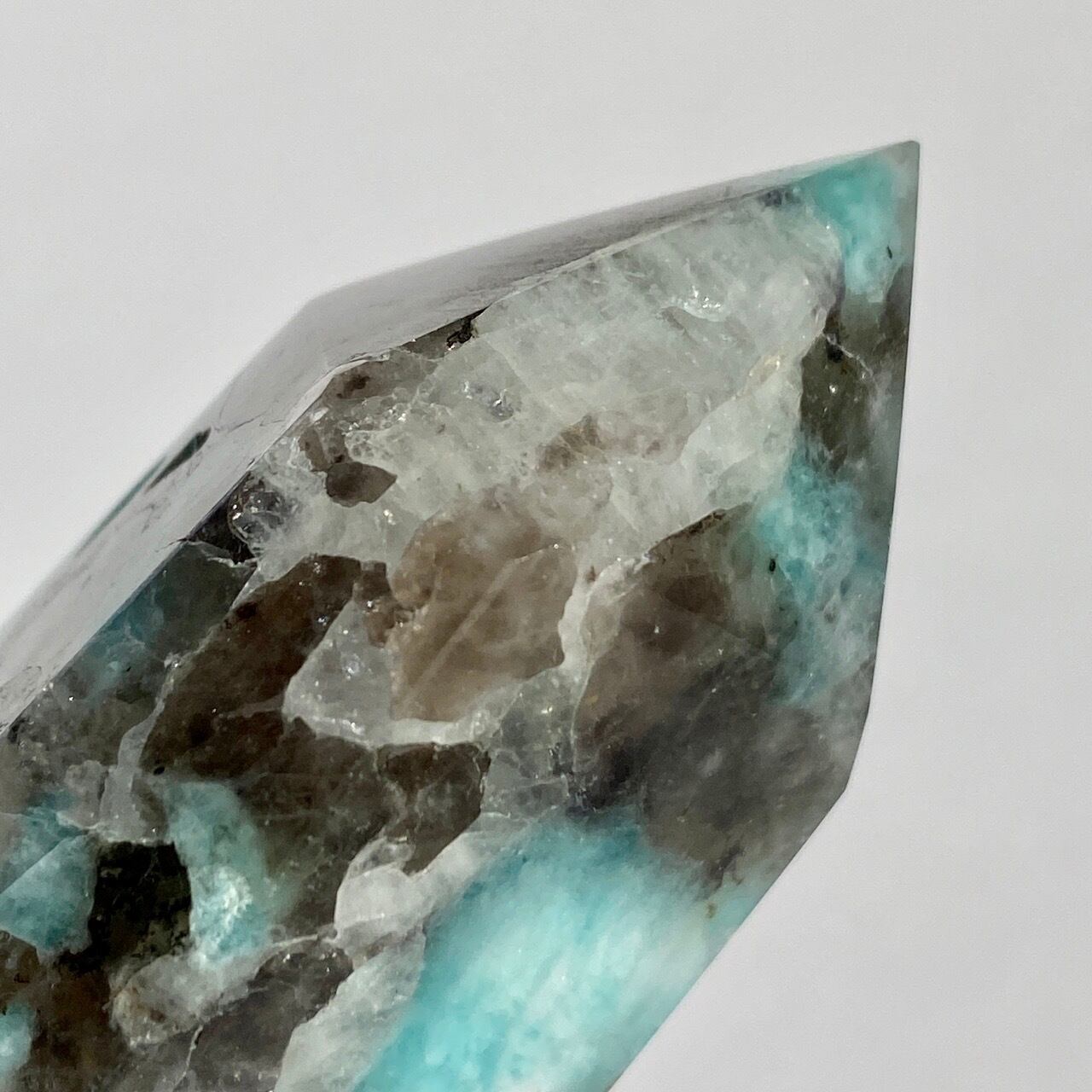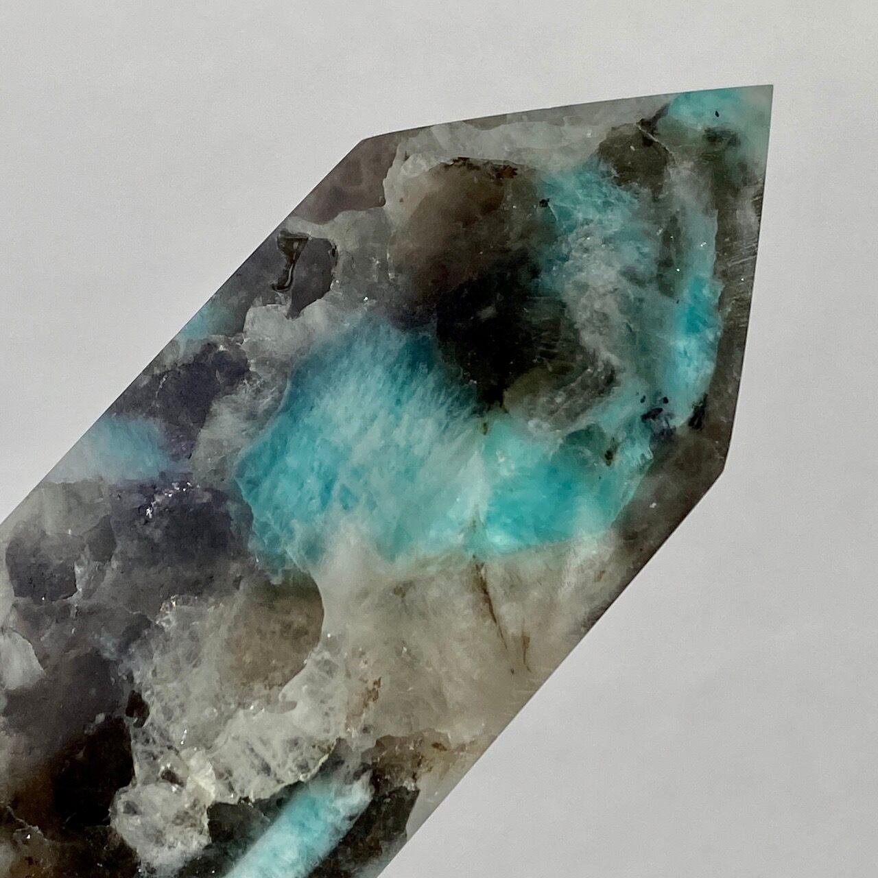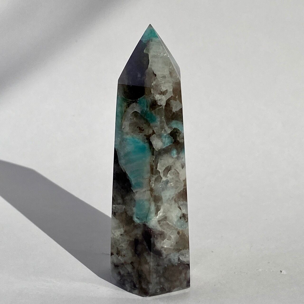 ブルーラグーンのような発色の美しいアマゾナイトが、濃淡の迷彩柄のようなスモーキークォーツの所々に配されている美しいタワーです。ダークなスモーキーの色味がアマゾナイトの鮮やかさを一段と引き立てている、素敵な組み合わせです。また、下部に少しマイカも入っているのが見受けられます。