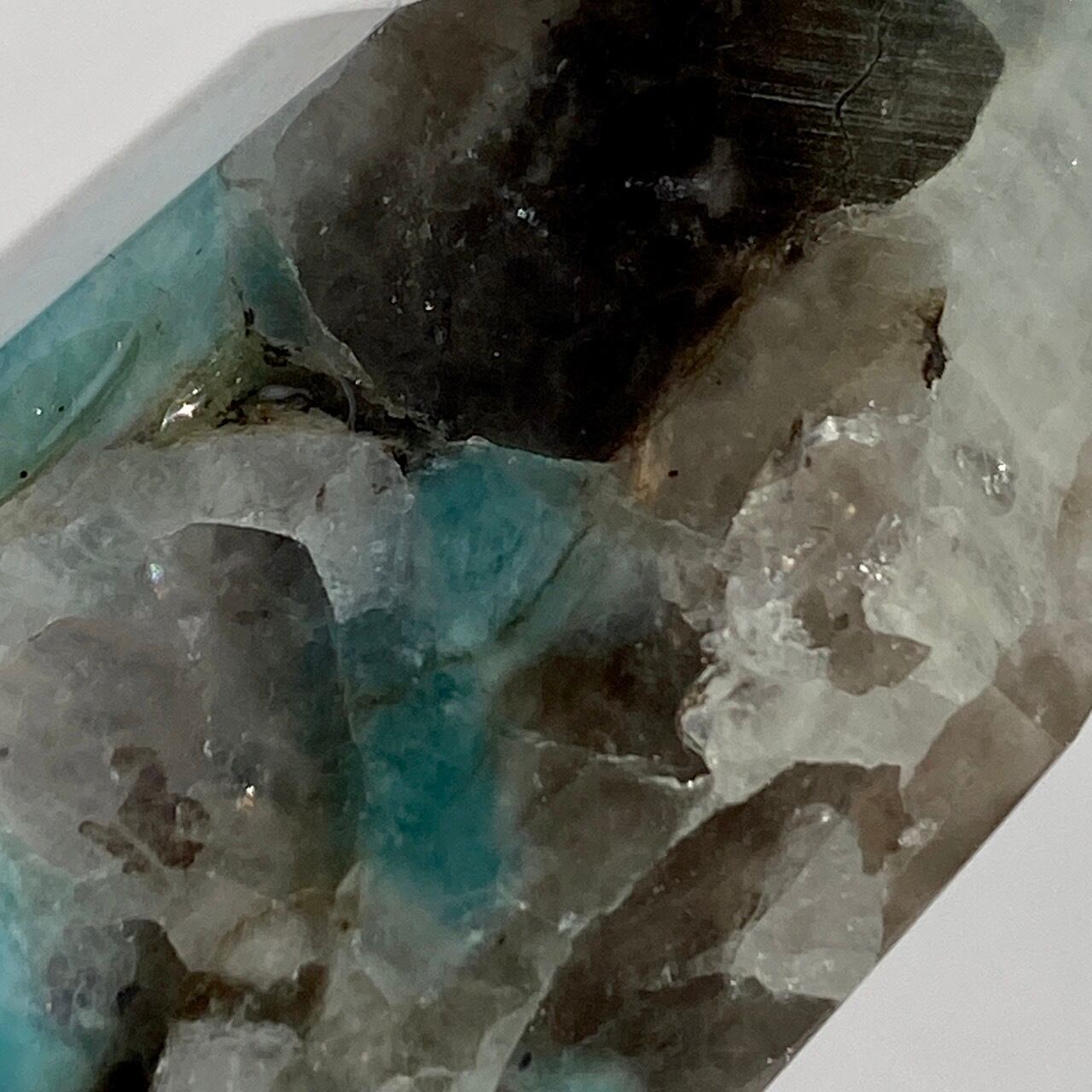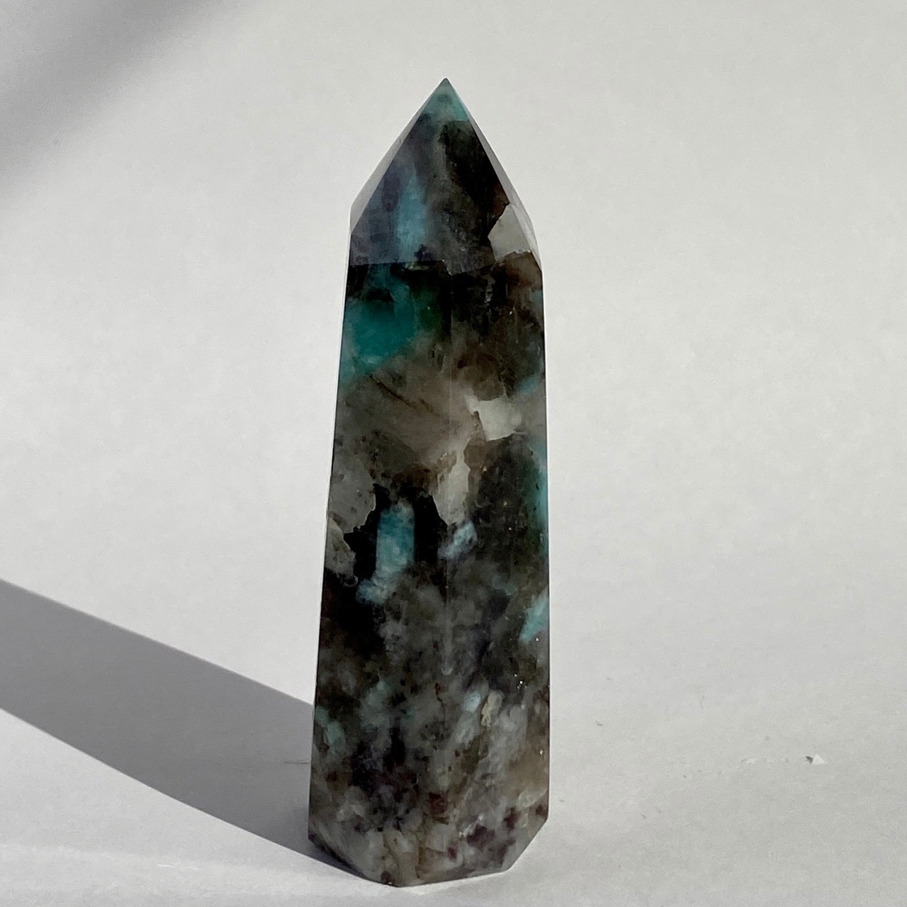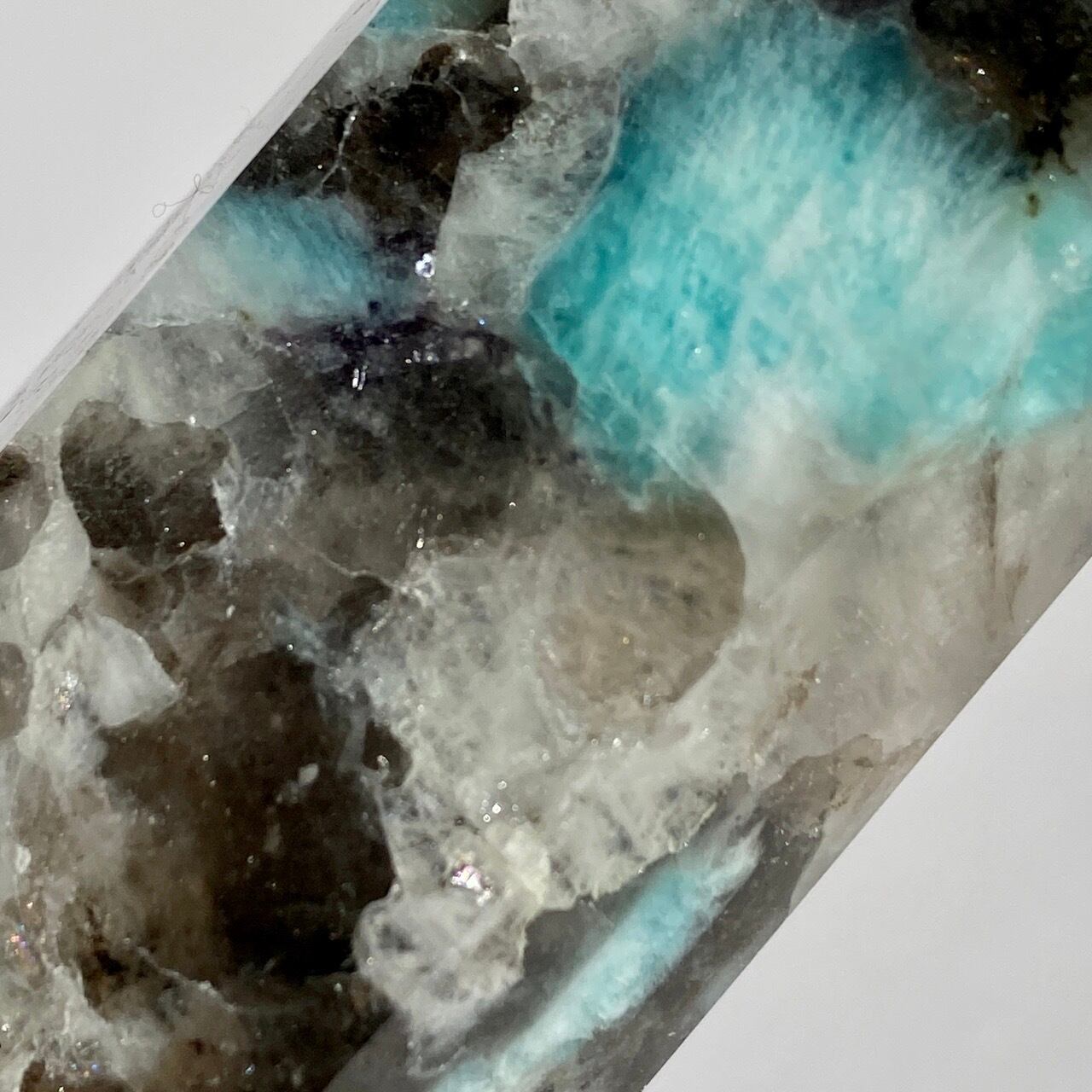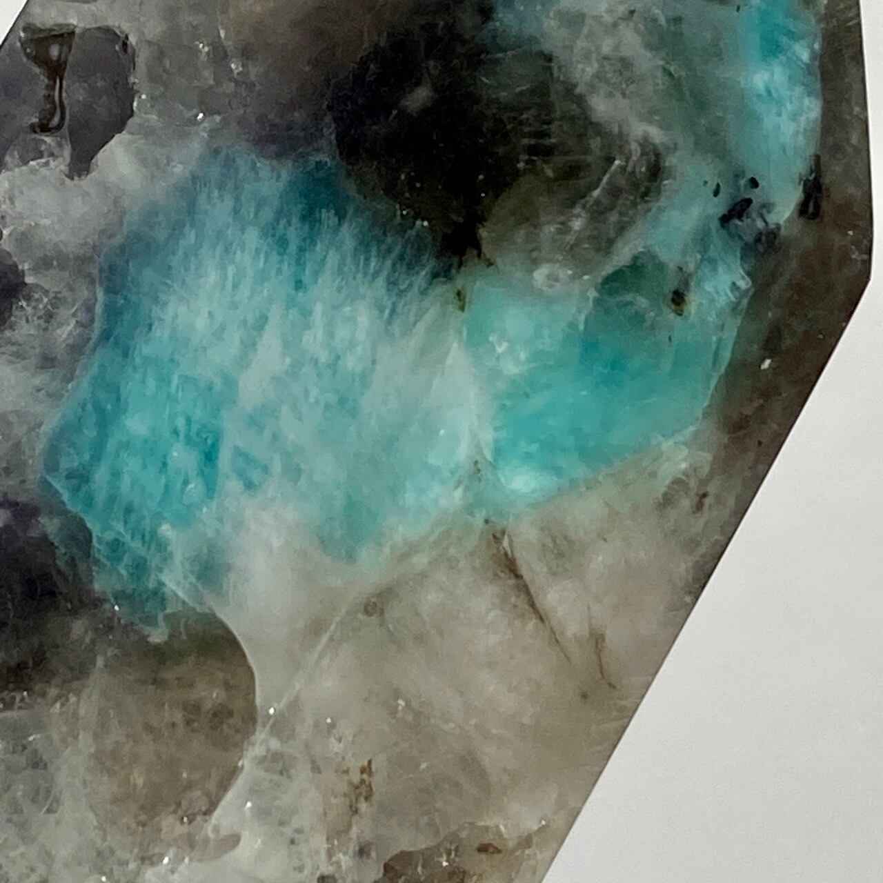 ブルーラグーンのような発色の美しいアマゾナイトが、濃淡の迷彩柄のようなスモーキークォーツの所々に配されている美しいタワーです。ダークなスモーキーの色味がアマゾナイトの鮮やかさを一段と引き立てている、素敵な組み合わせです。また、下部に少しマイカも入っているのが見受けられます。