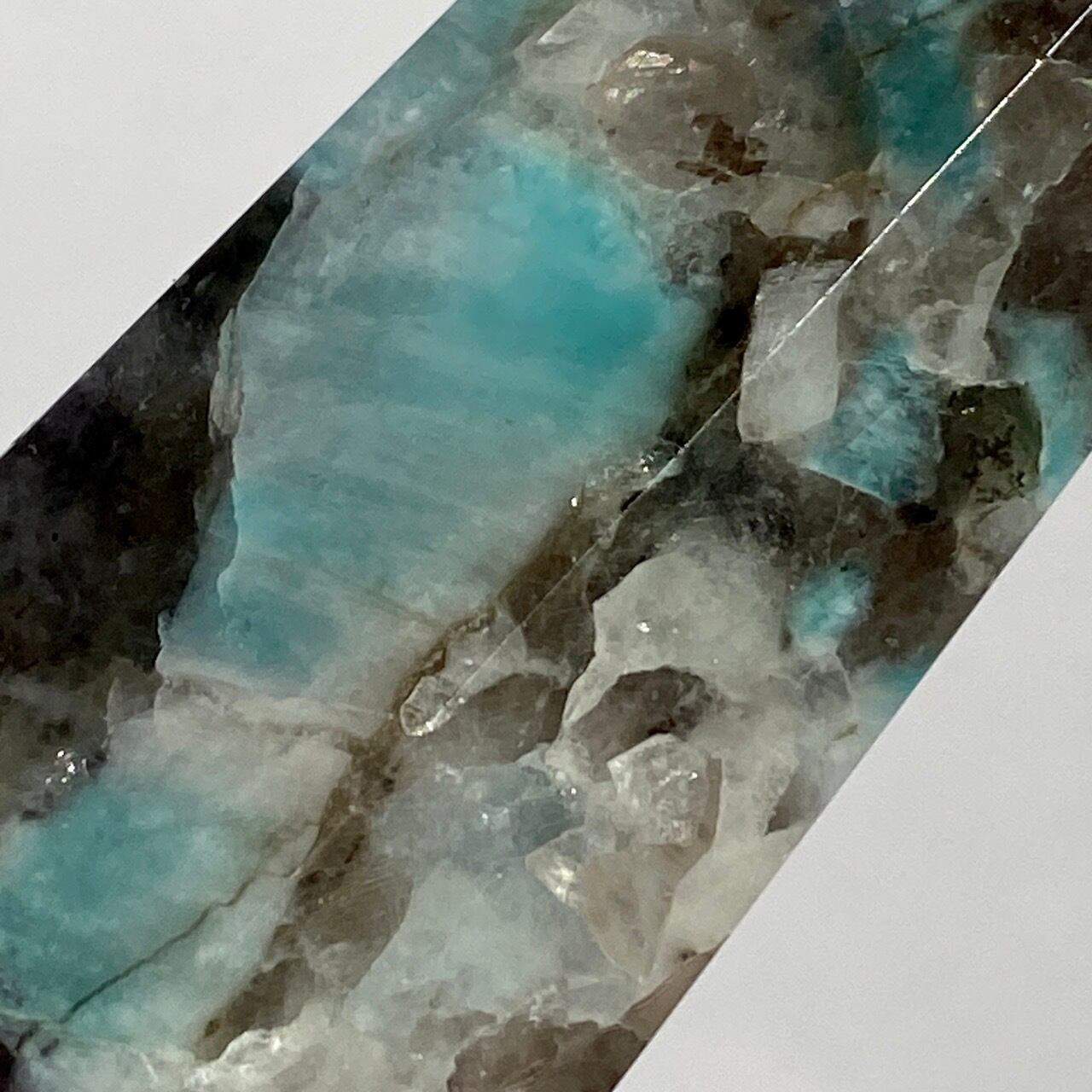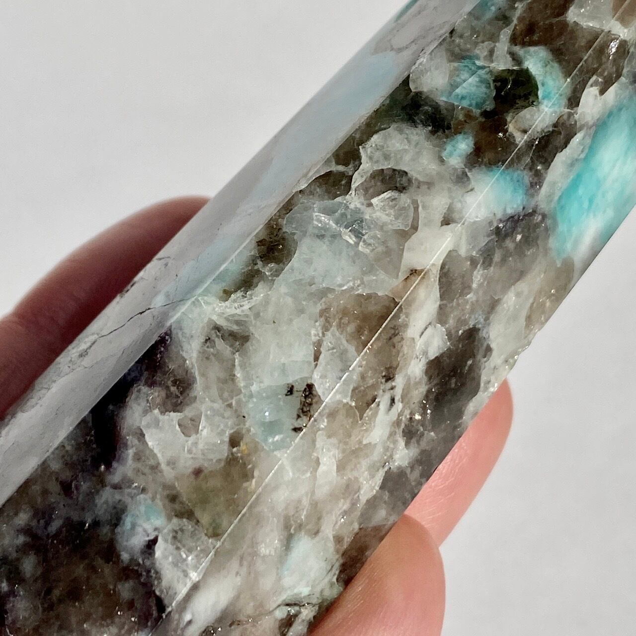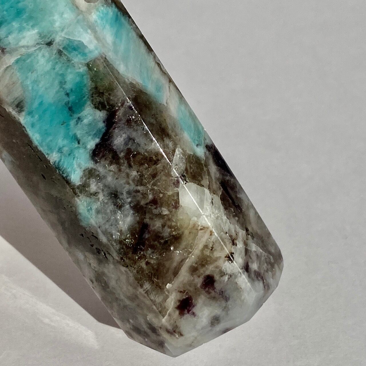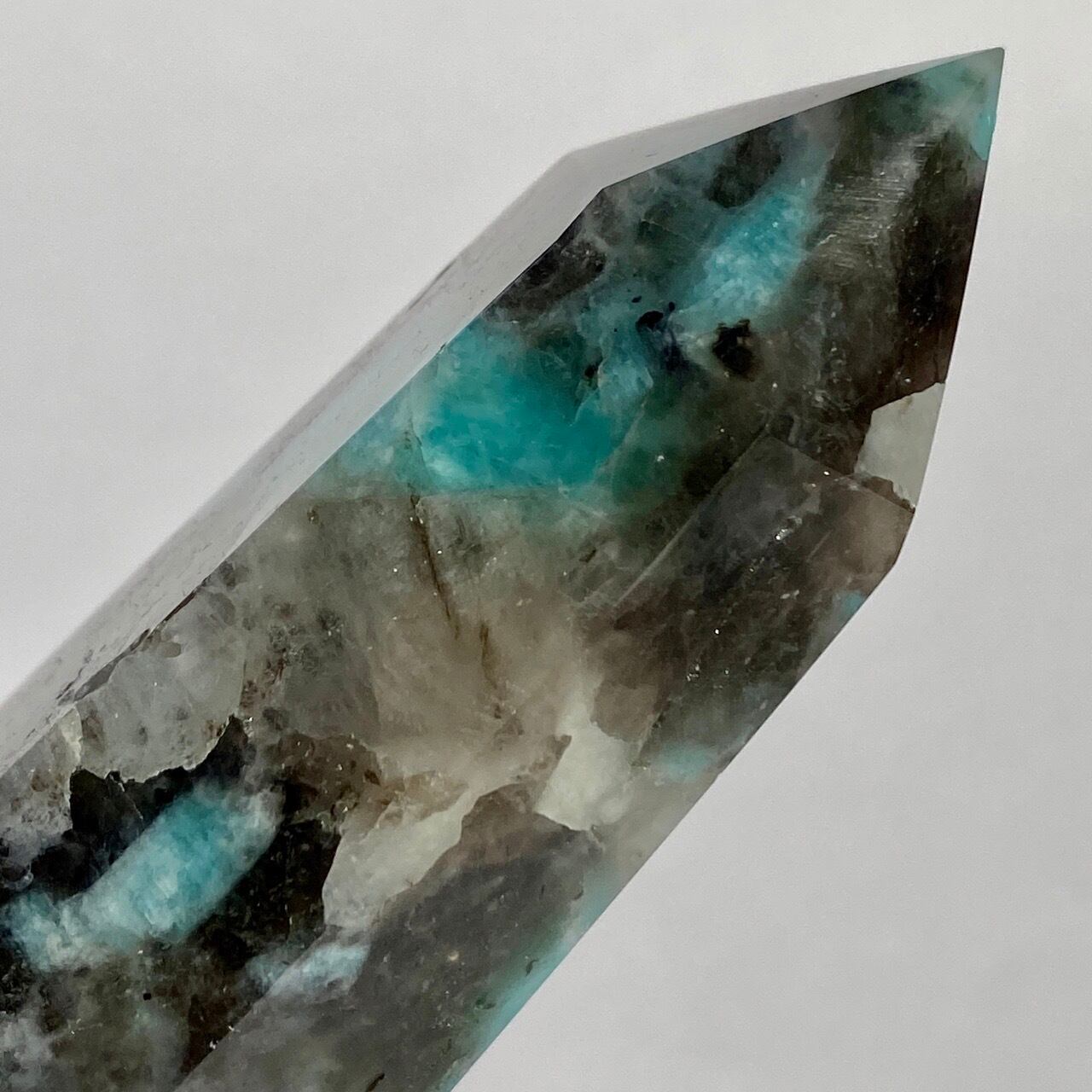 ブルーラグーンのような発色の美しいアマゾナイトが、濃淡の迷彩柄のようなスモーキークォーツの所々に配されている美しいタワーです。ダークなスモーキーの色味がアマゾナイトの鮮やかさを一段と引き立てている、素敵な組み合わせです。また、下部に少しマイカも入っているのが見受けられます。